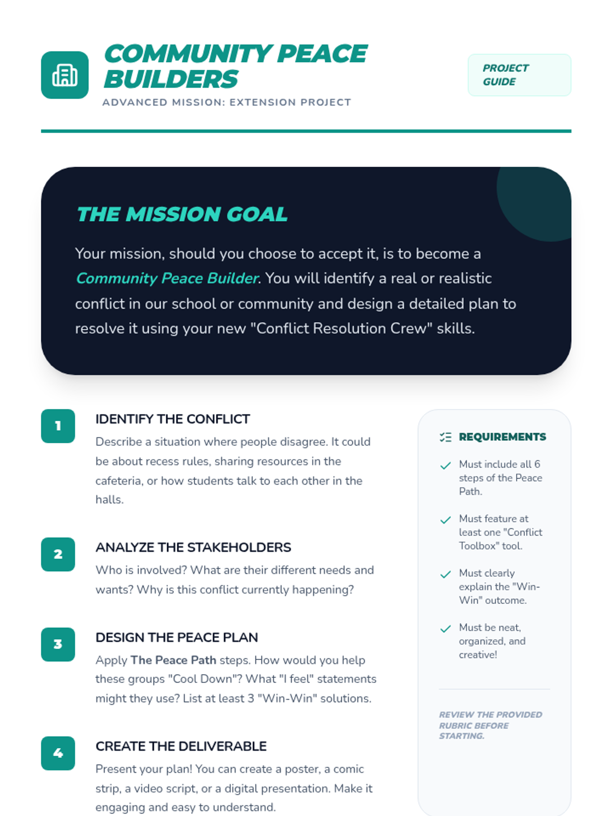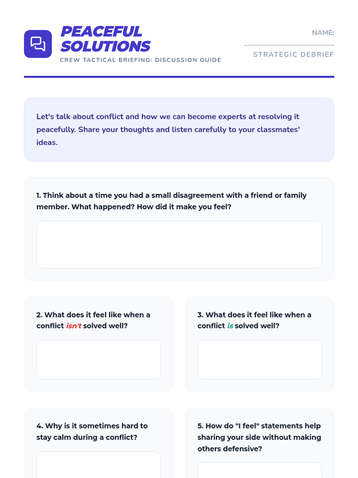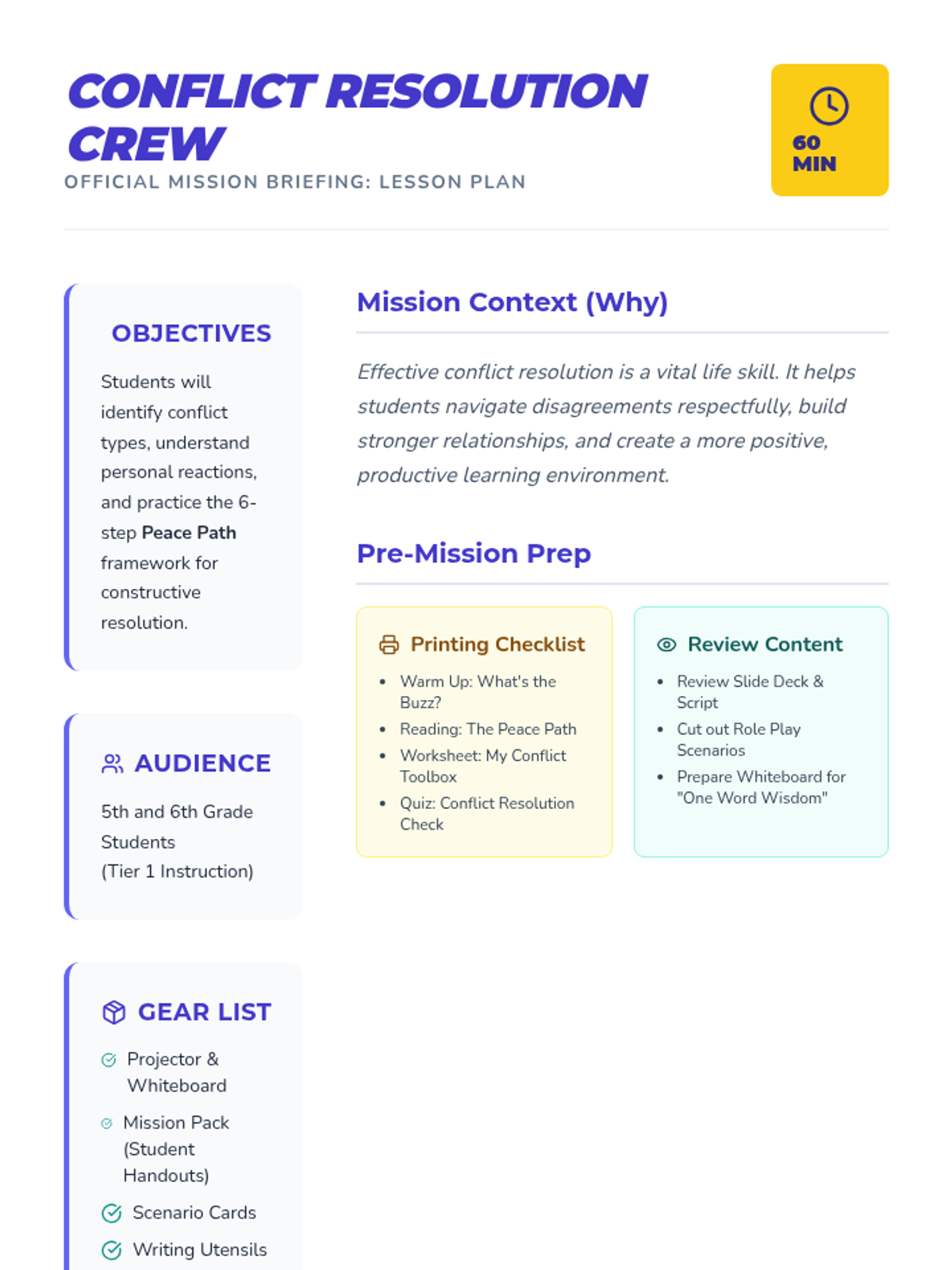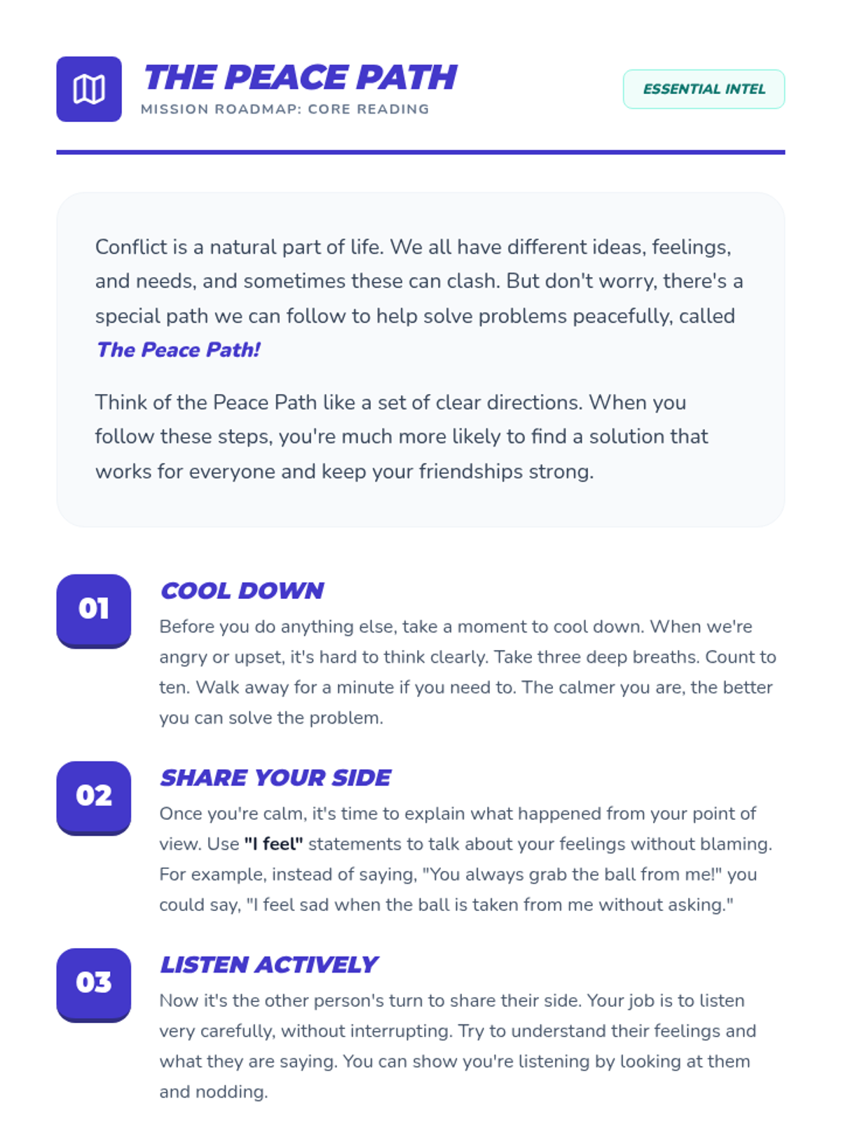 A comprehensive one-hour lesson for 5th and 6th graders that teaches the 'Peace Path' framework and provides a 'Conflict Toolbox' of practical strategies for resolving disagreements peacefully and effectively.