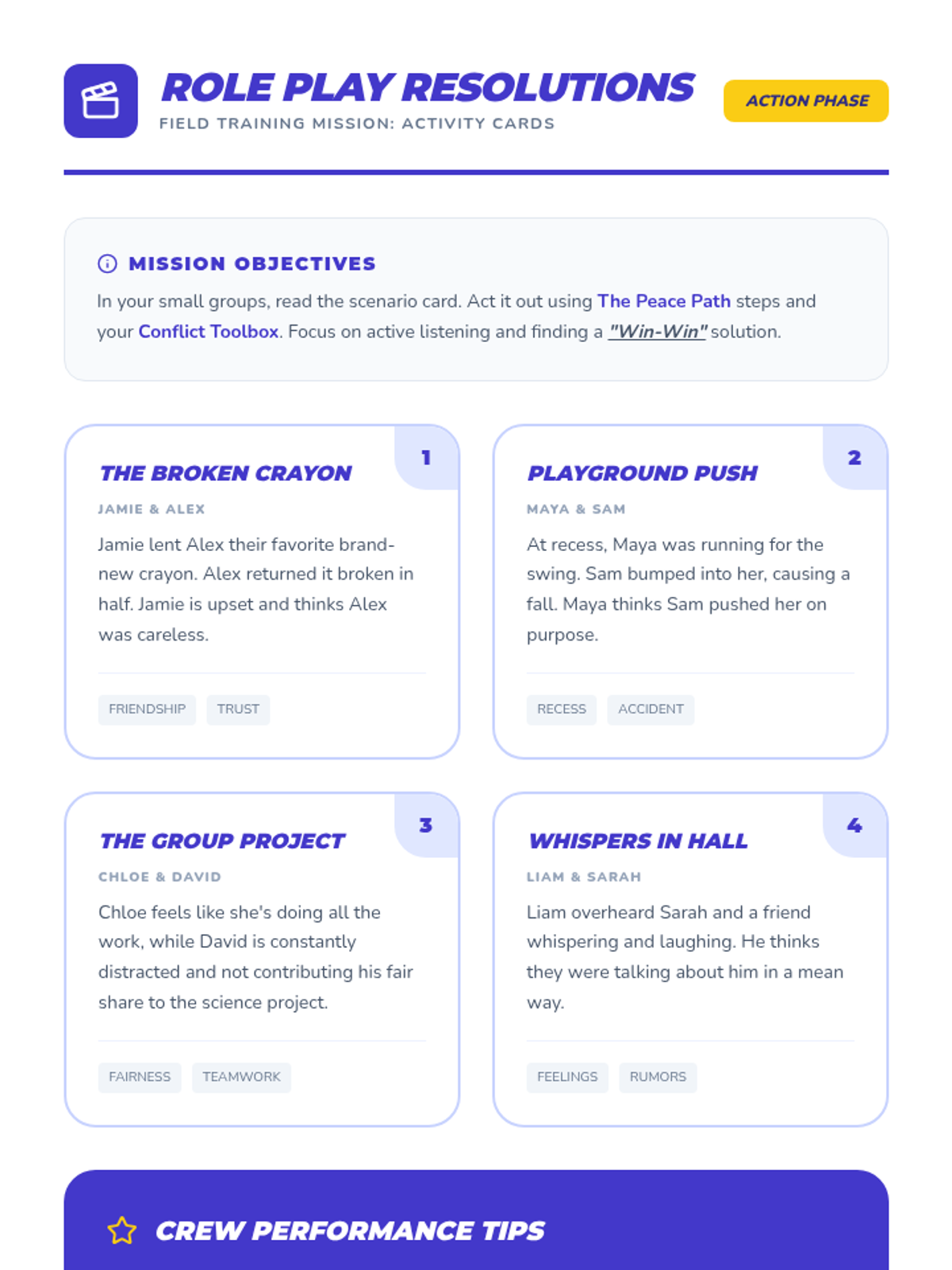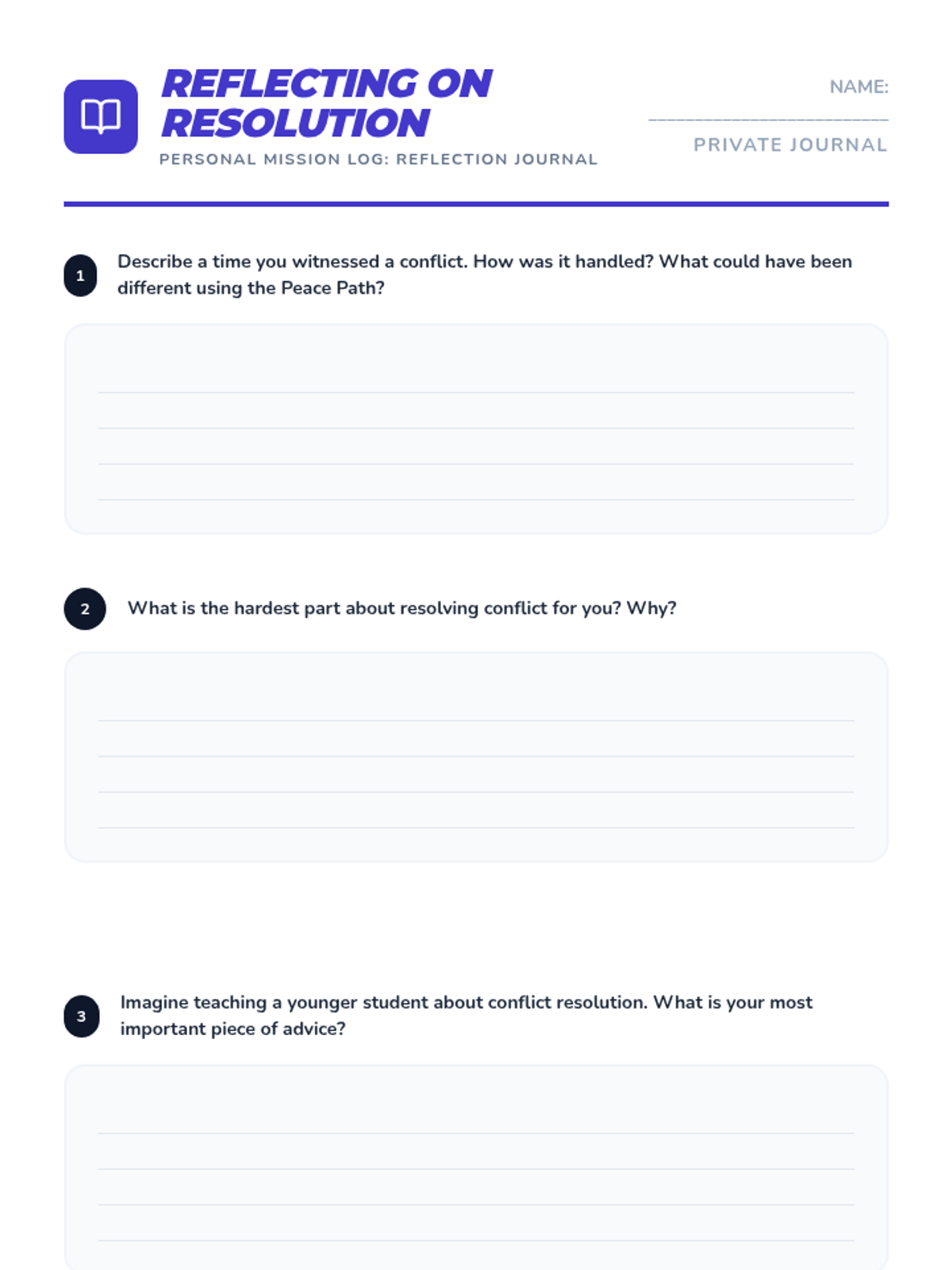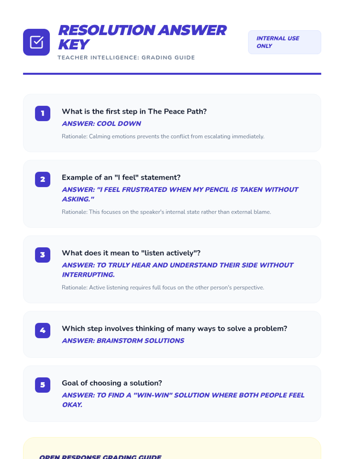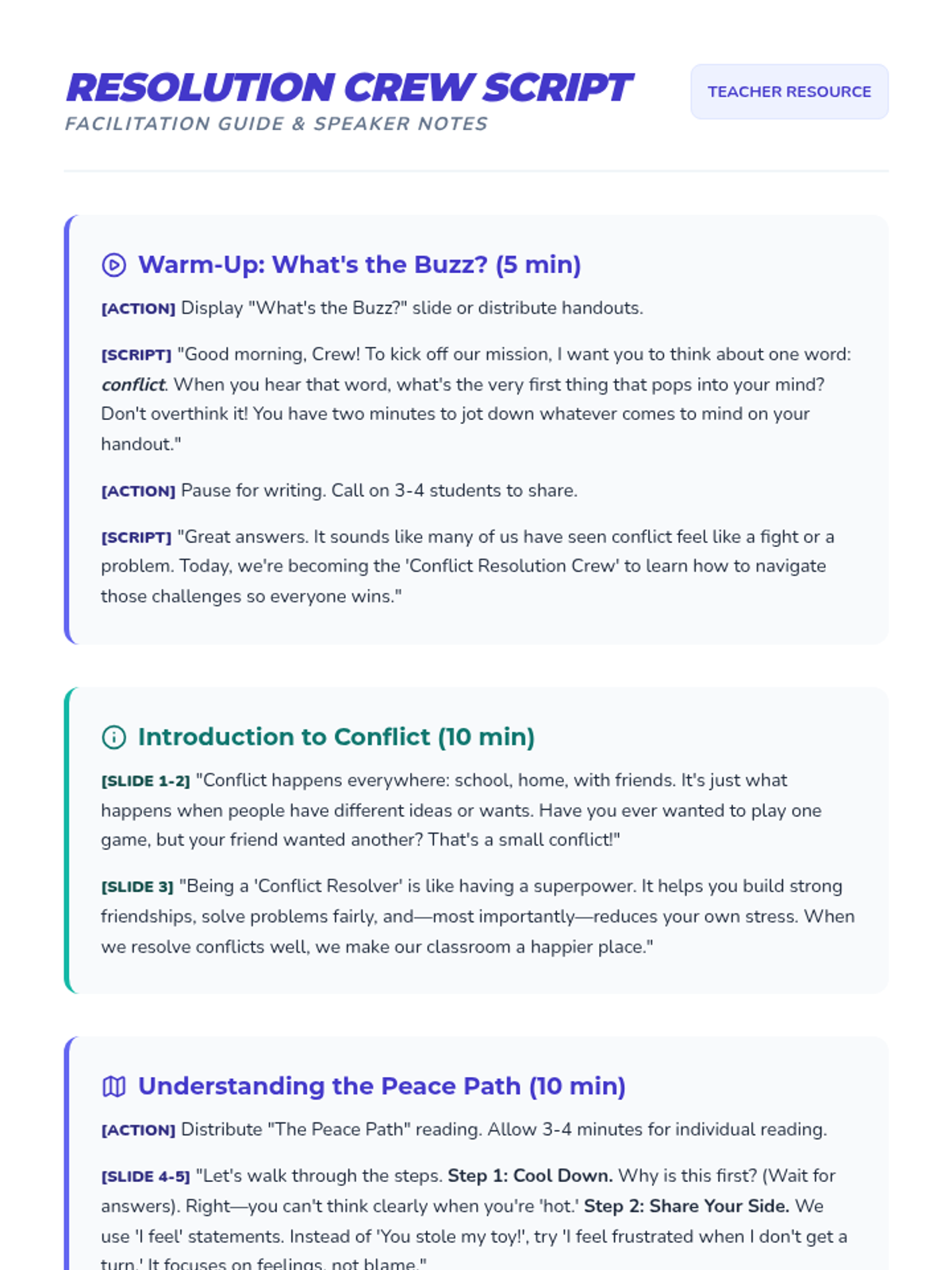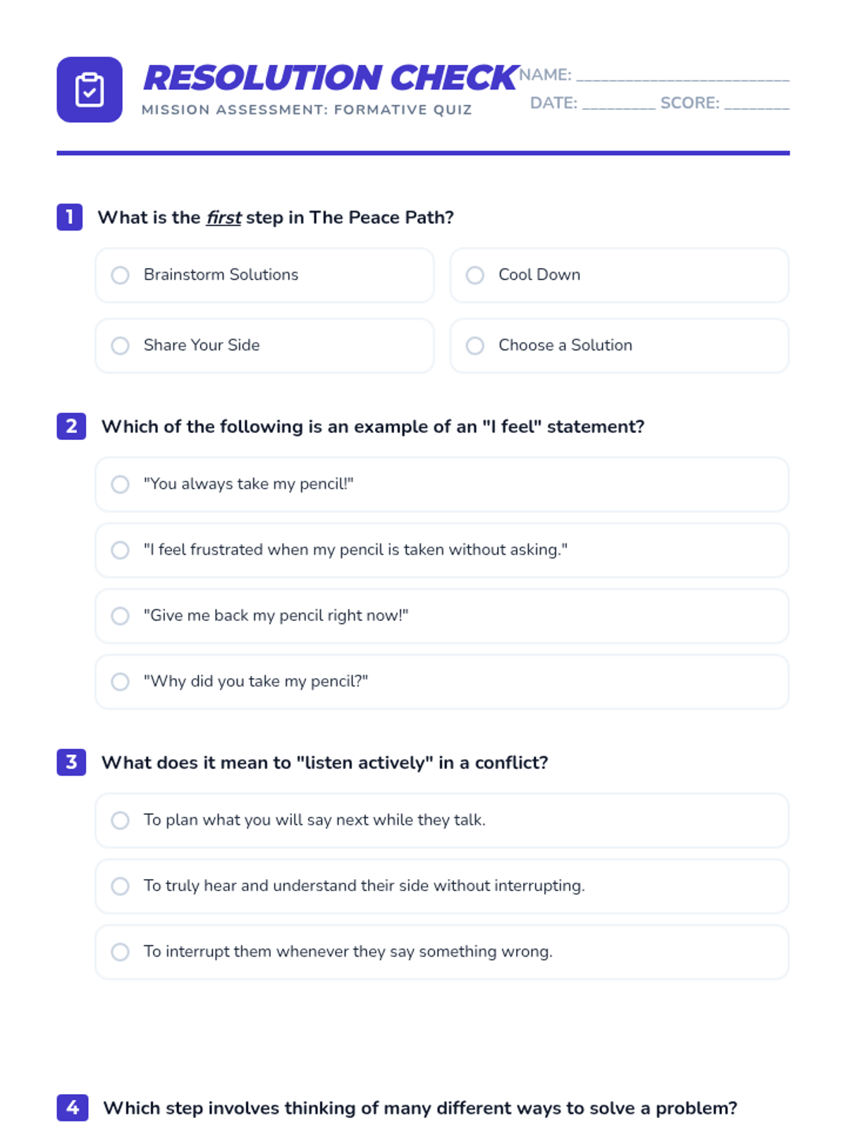 A comprehensive one-hour lesson for 5th and 6th graders that teaches the 'Peace Path' framework and provides a 'Conflict Toolbox' of practical strategies for resolving disagreements peacefully and effectively.