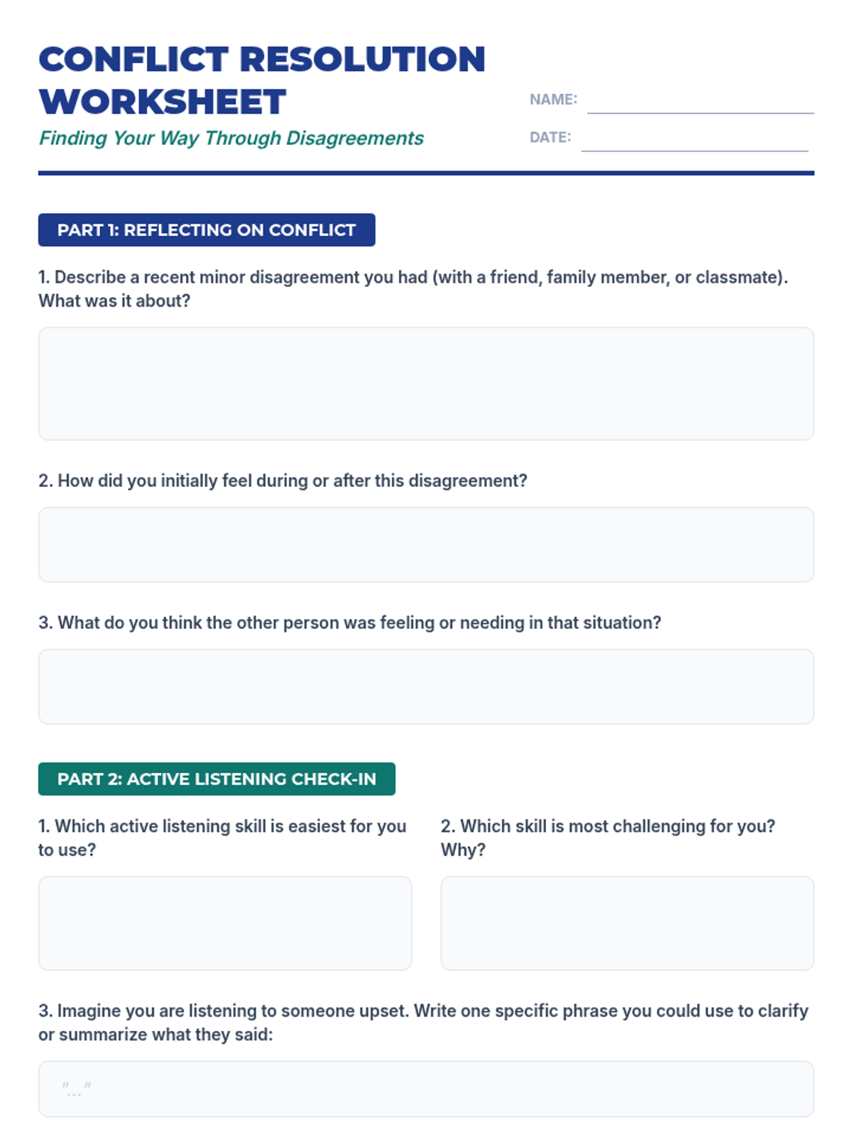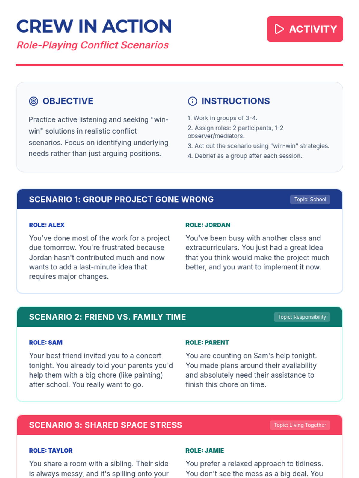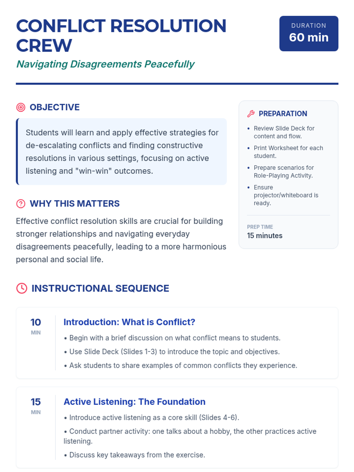 A 60-minute lesson for high school students on de-escalation, active listening, and finding win-win solutions to navigate peer and family conflicts.