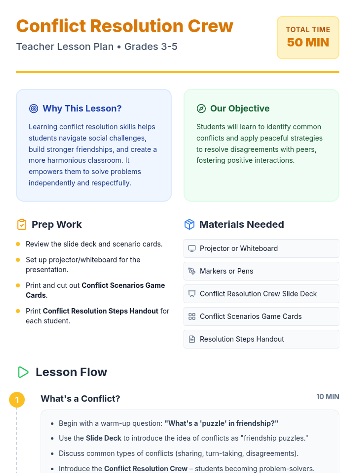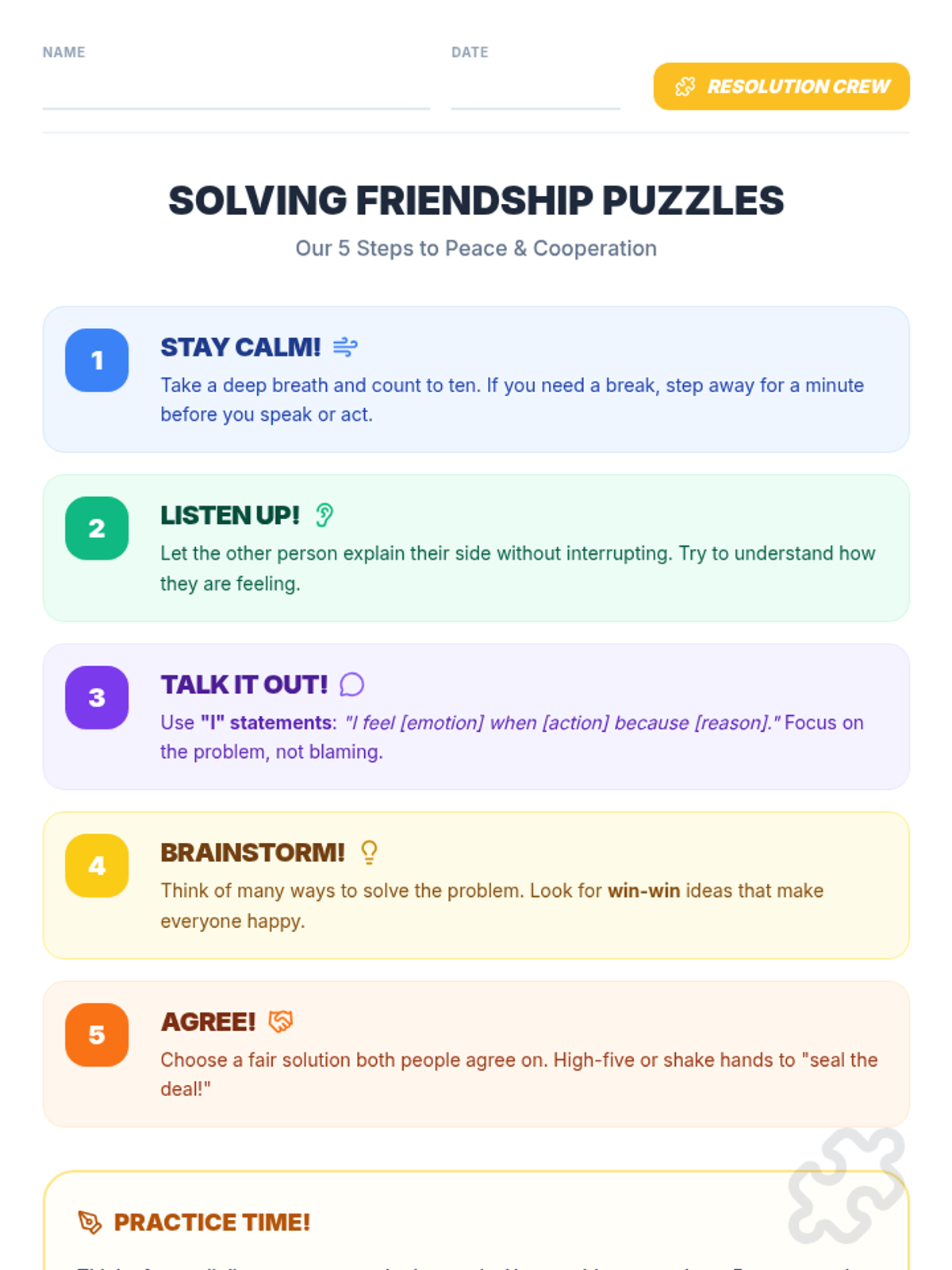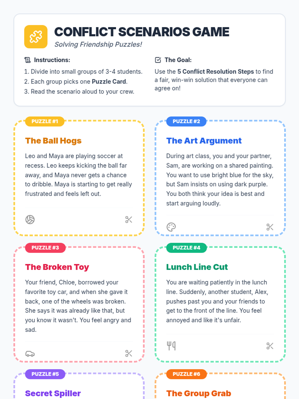 An interactive lesson for grades 3-5 that teaches students to identify conflicts as 'friendship puzzles' and apply a 5-step resolution process through scenarios and collaboration.