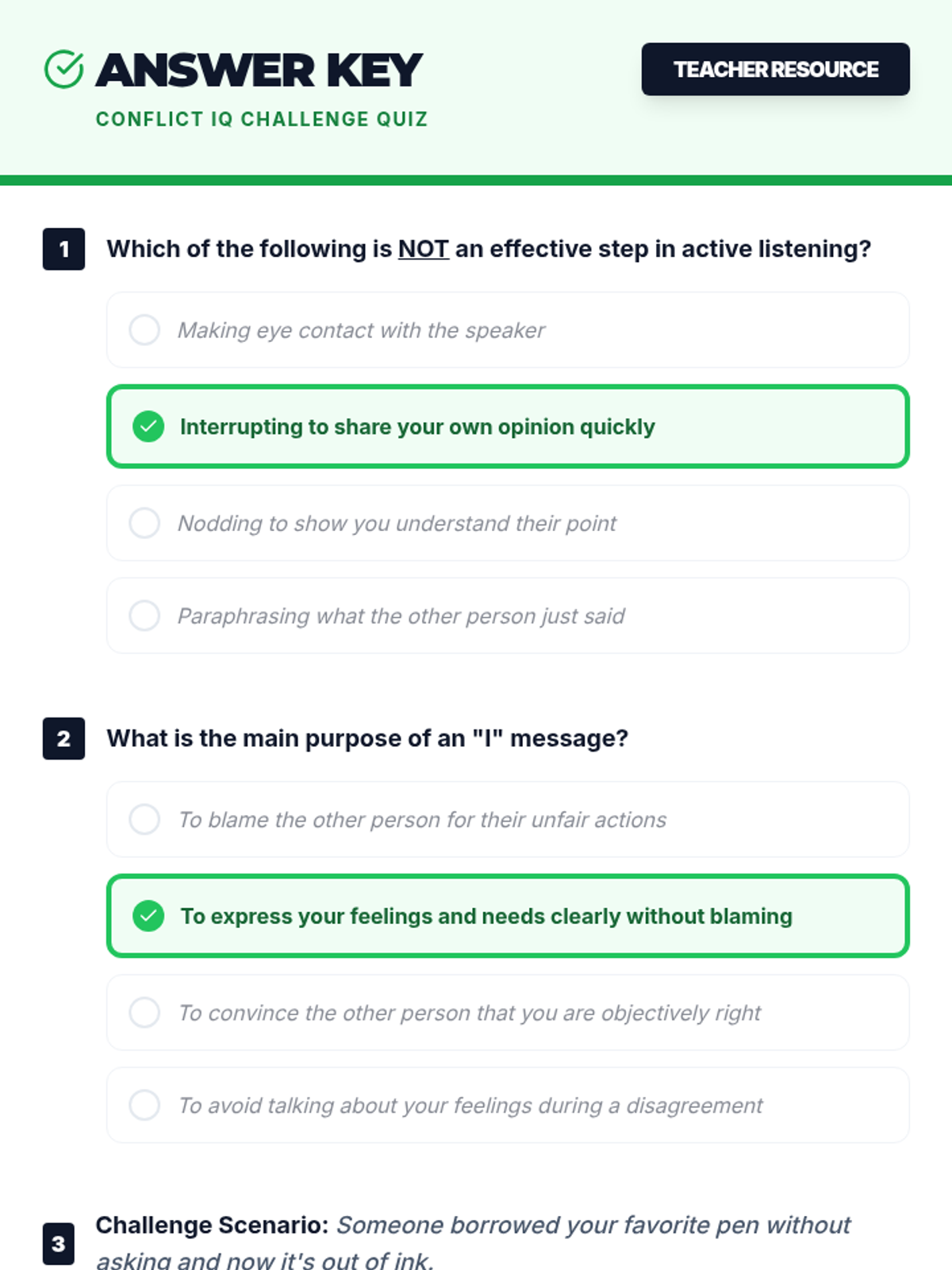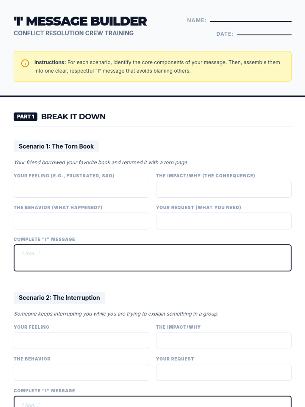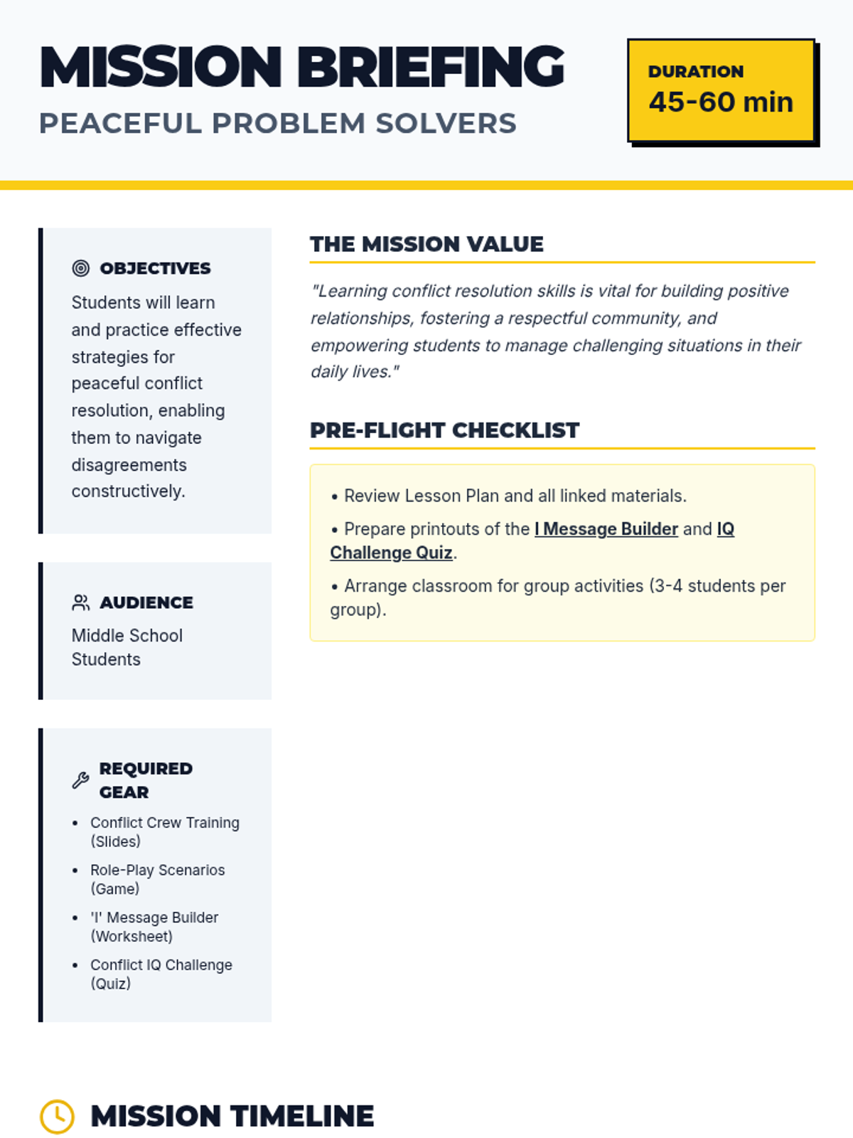 A single-session lesson for middle schoolers that teaches active listening, 'I' messages, and peaceful resolution strategies through interactive role-play and practice.