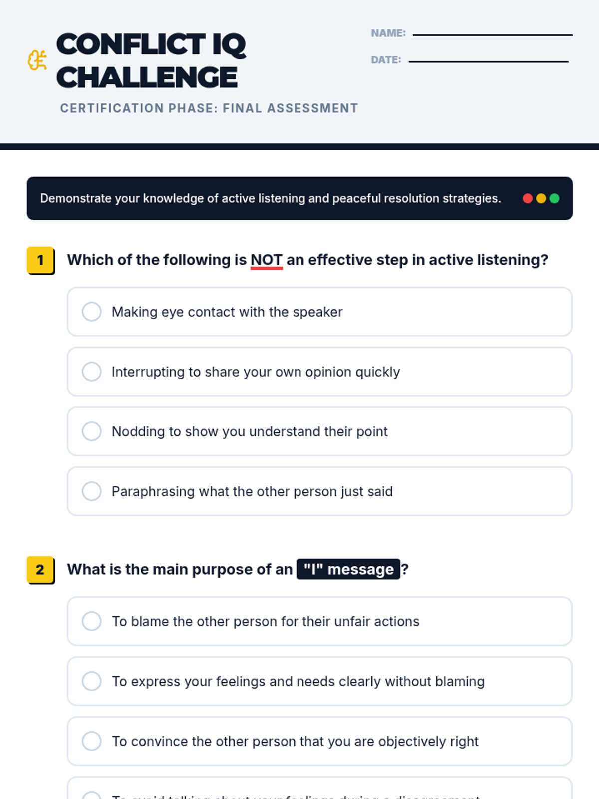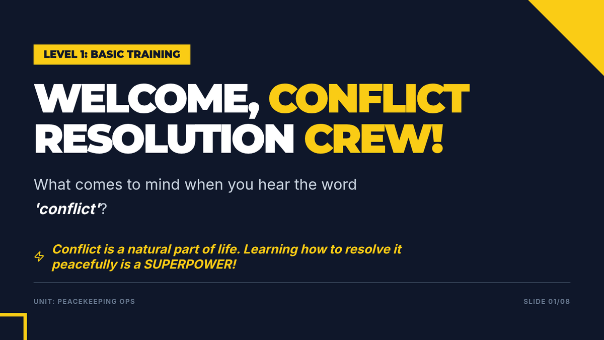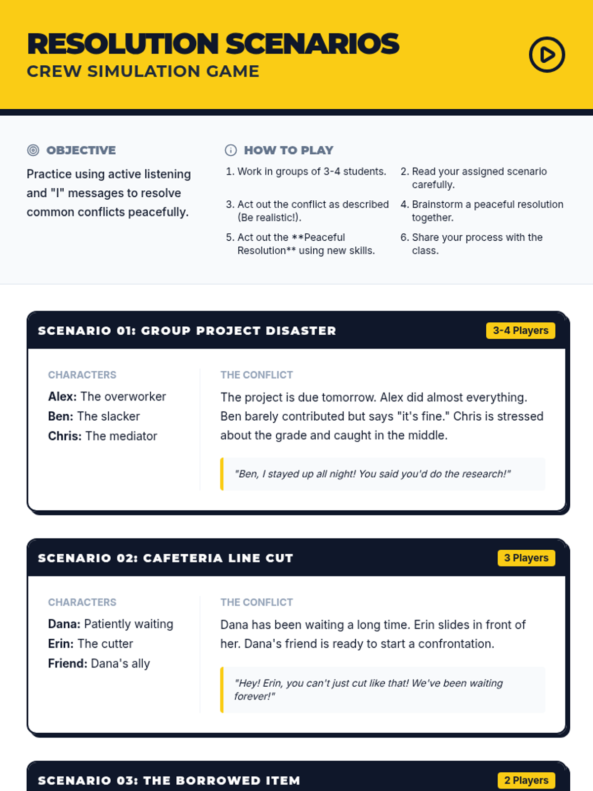 A single-session lesson for middle schoolers that teaches active listening, 'I' messages, and peaceful resolution strategies through interactive role-play and practice.