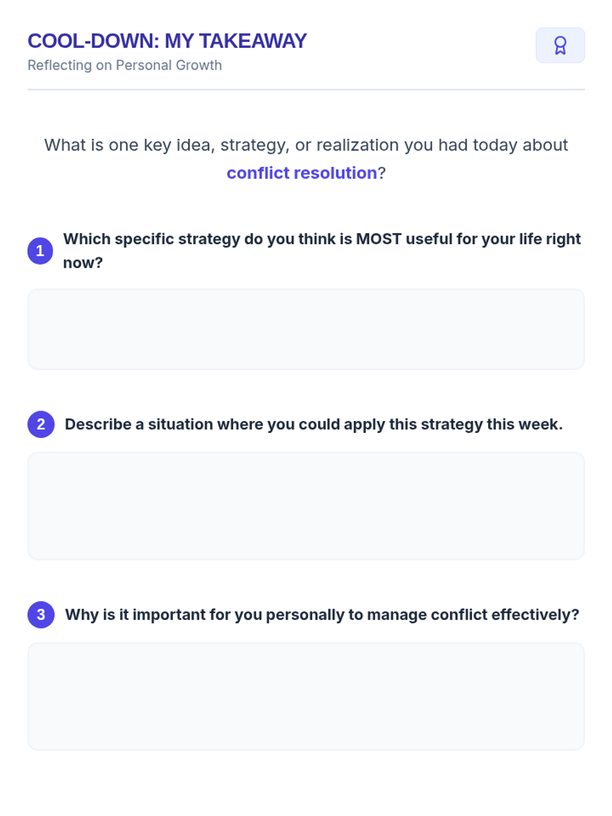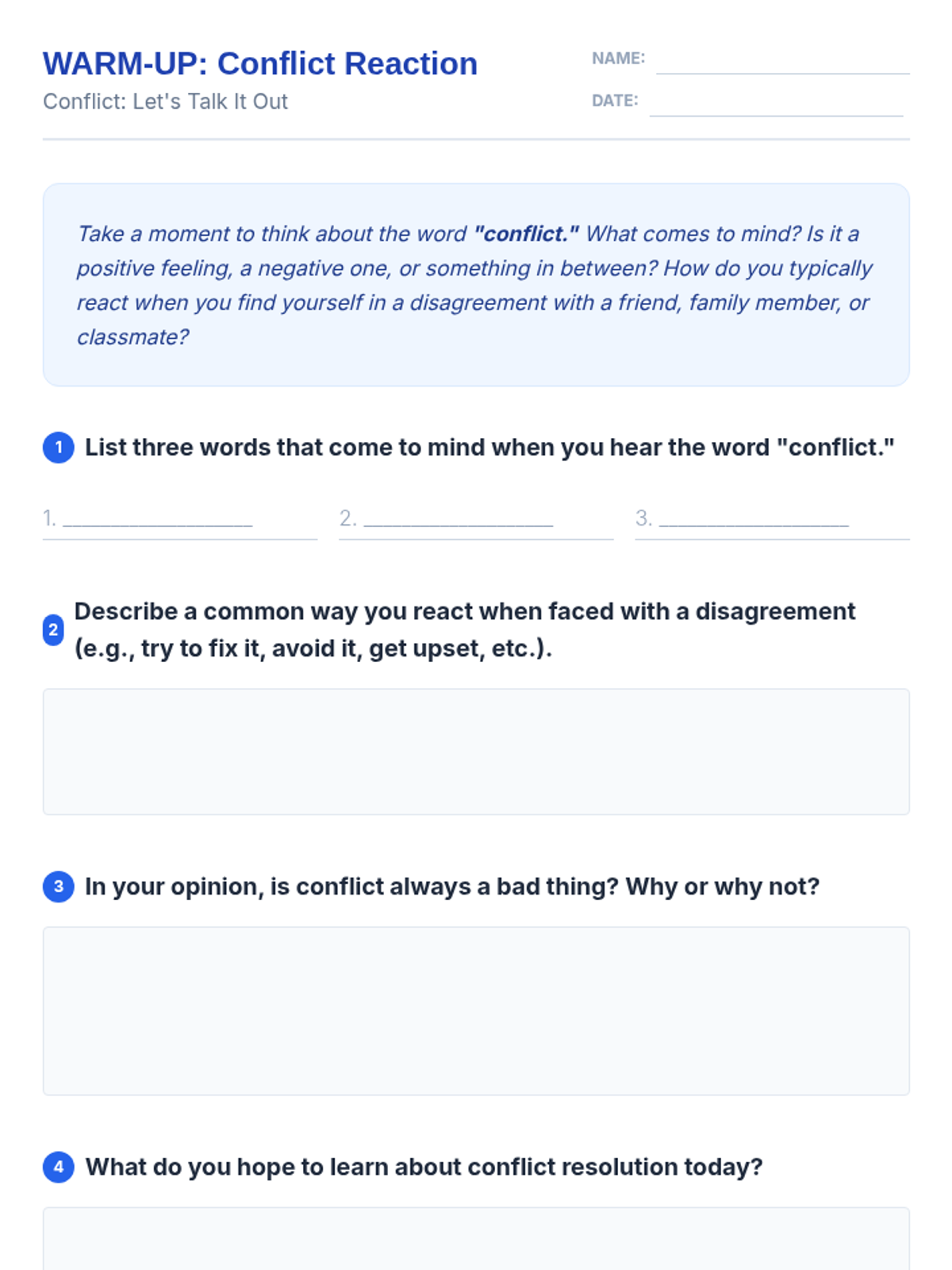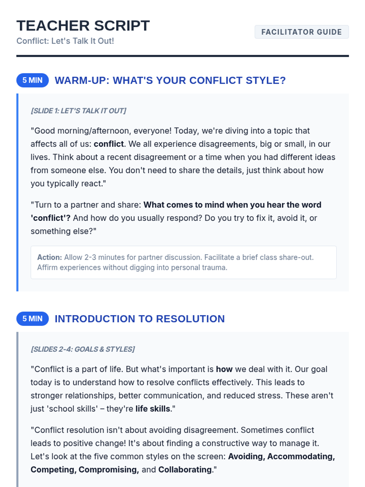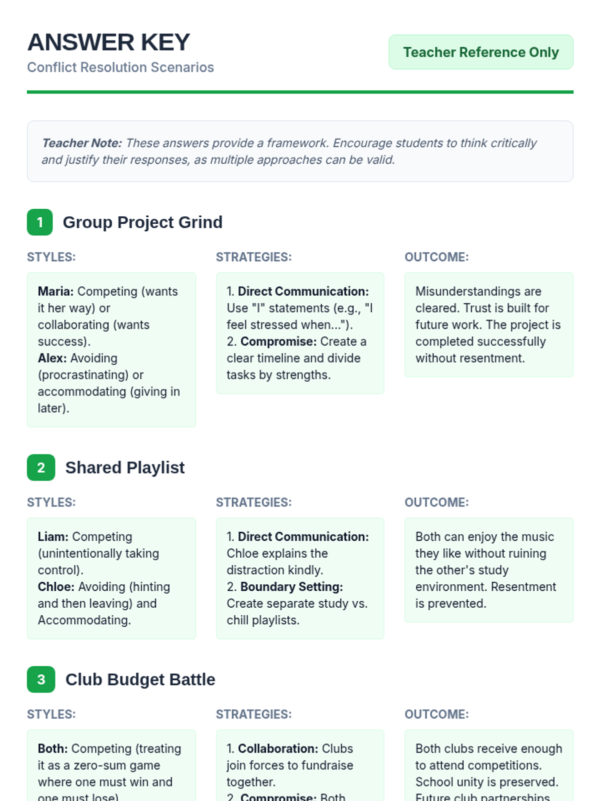 A 30-minute lesson for 11th-grade students exploring conflict resolution techniques, common conflict styles, and practical strategies for healthy communication.