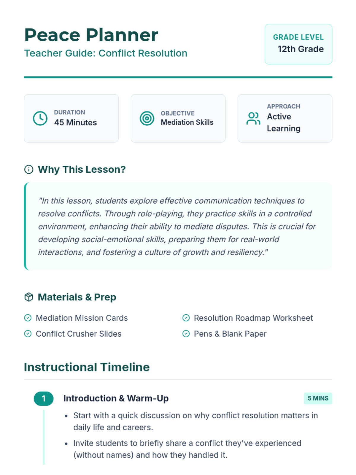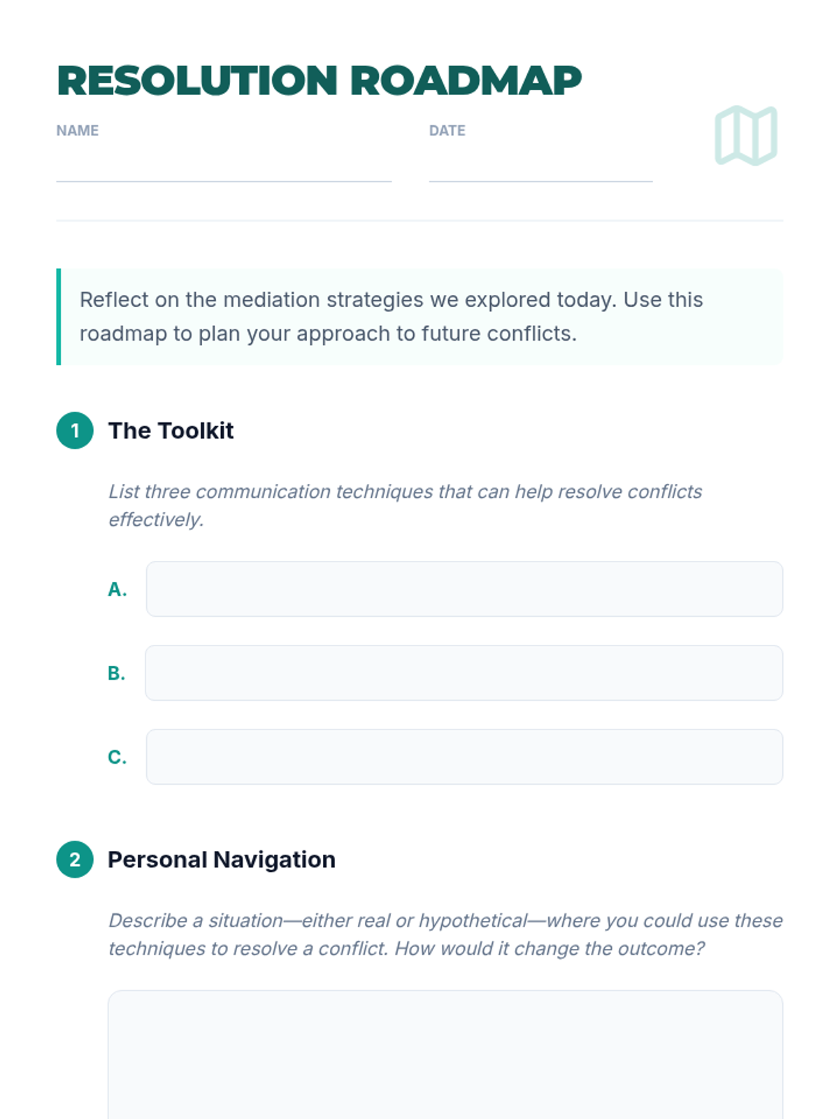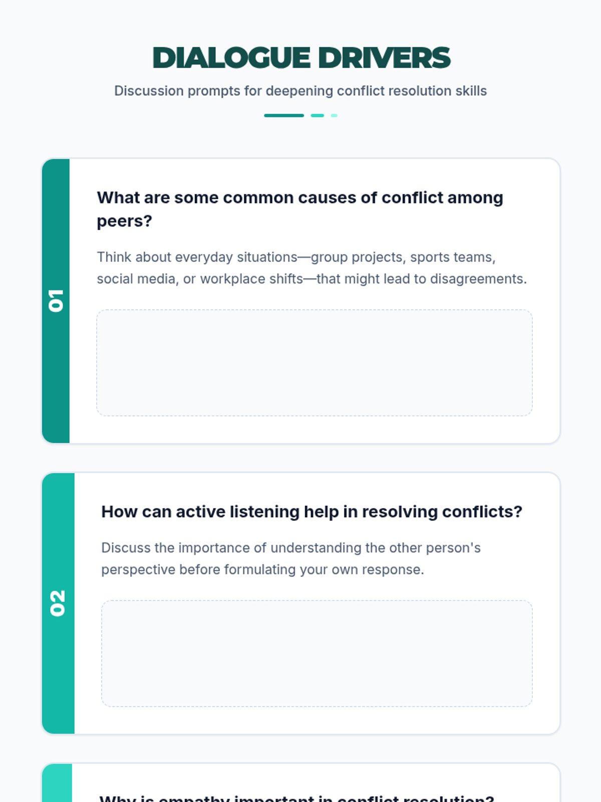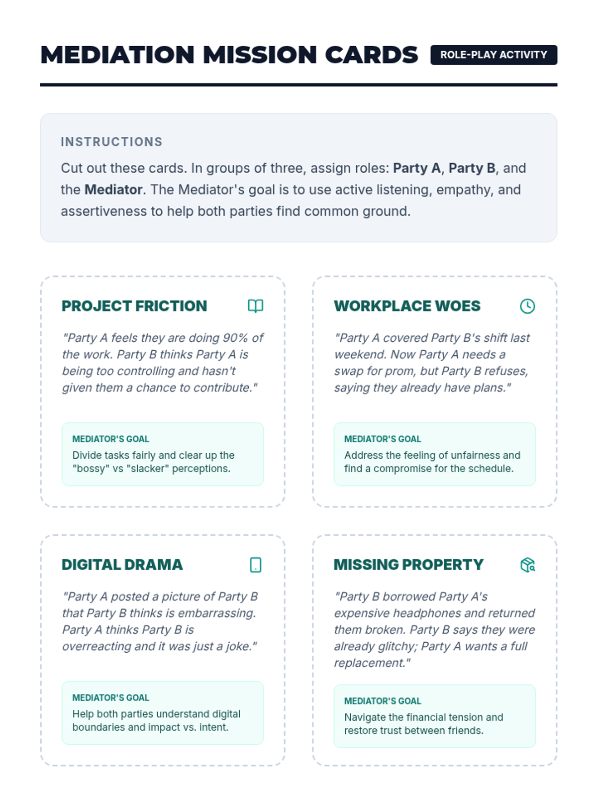 High school students learn to navigate and resolve disagreements using active listening, empathy, and assertiveness through interactive role-playing and reflection.