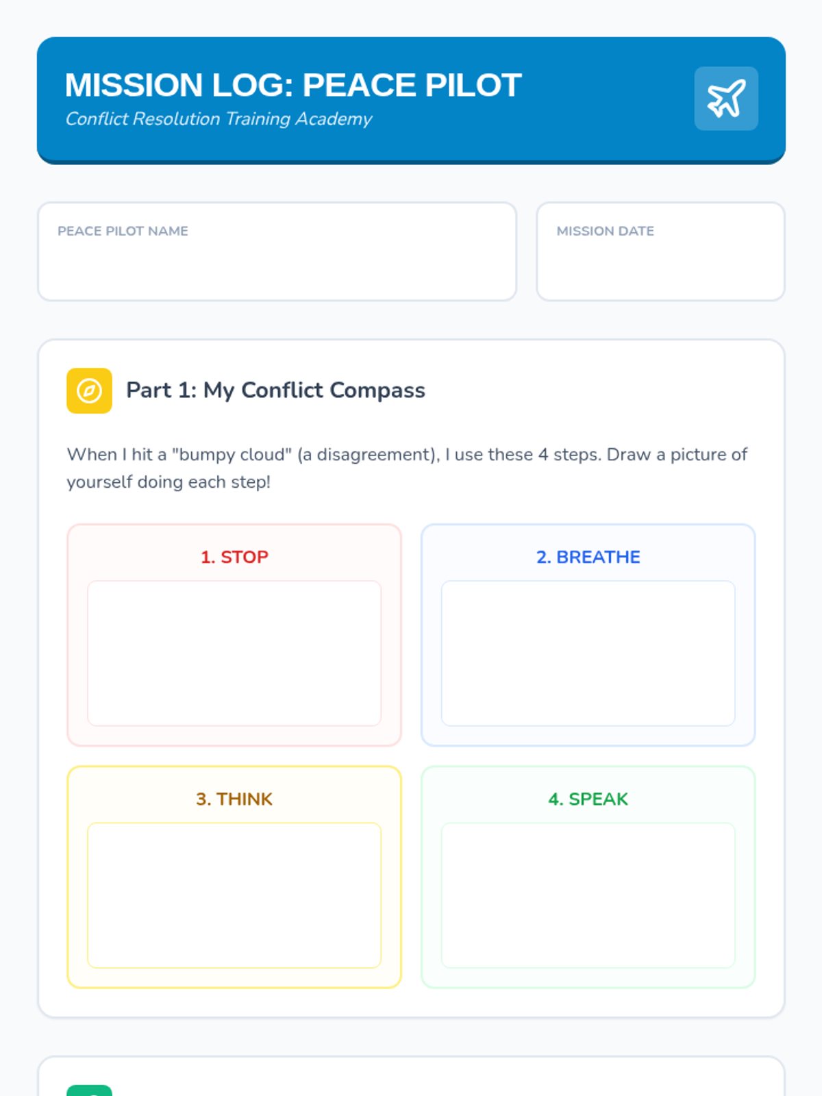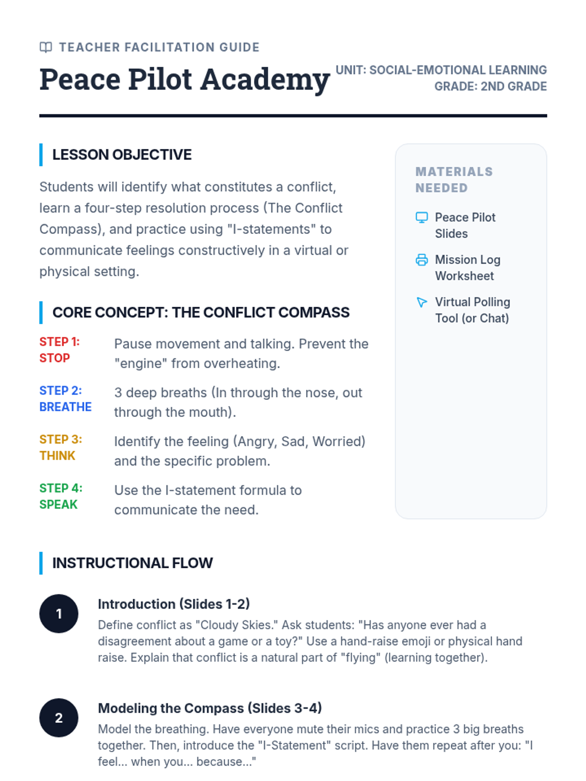 A social-emotional learning lesson for 2nd graders focused on conflict resolution. Students learn to navigate disagreements using the Conflict Compass and practice through interactive 'Peace Pilot' missions.