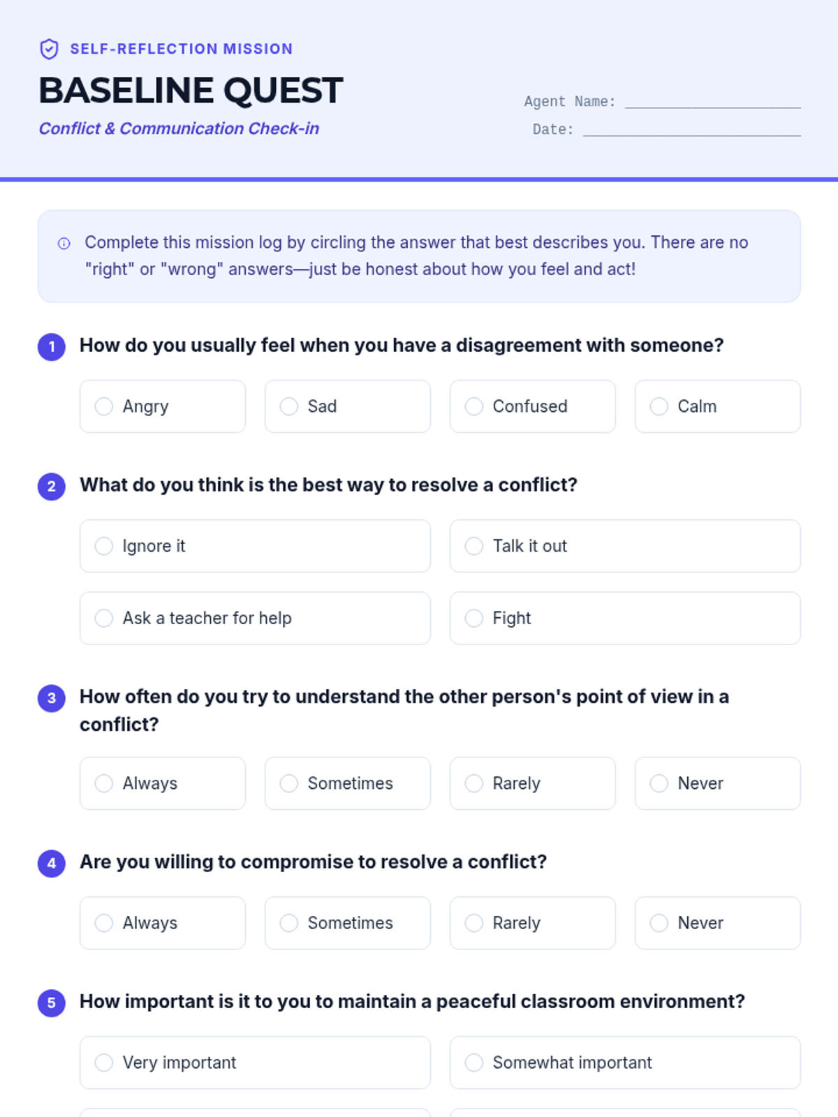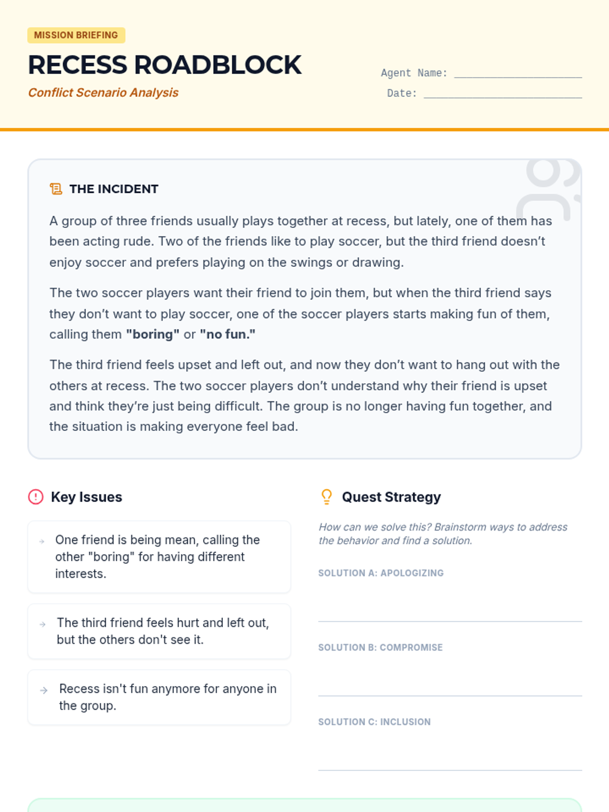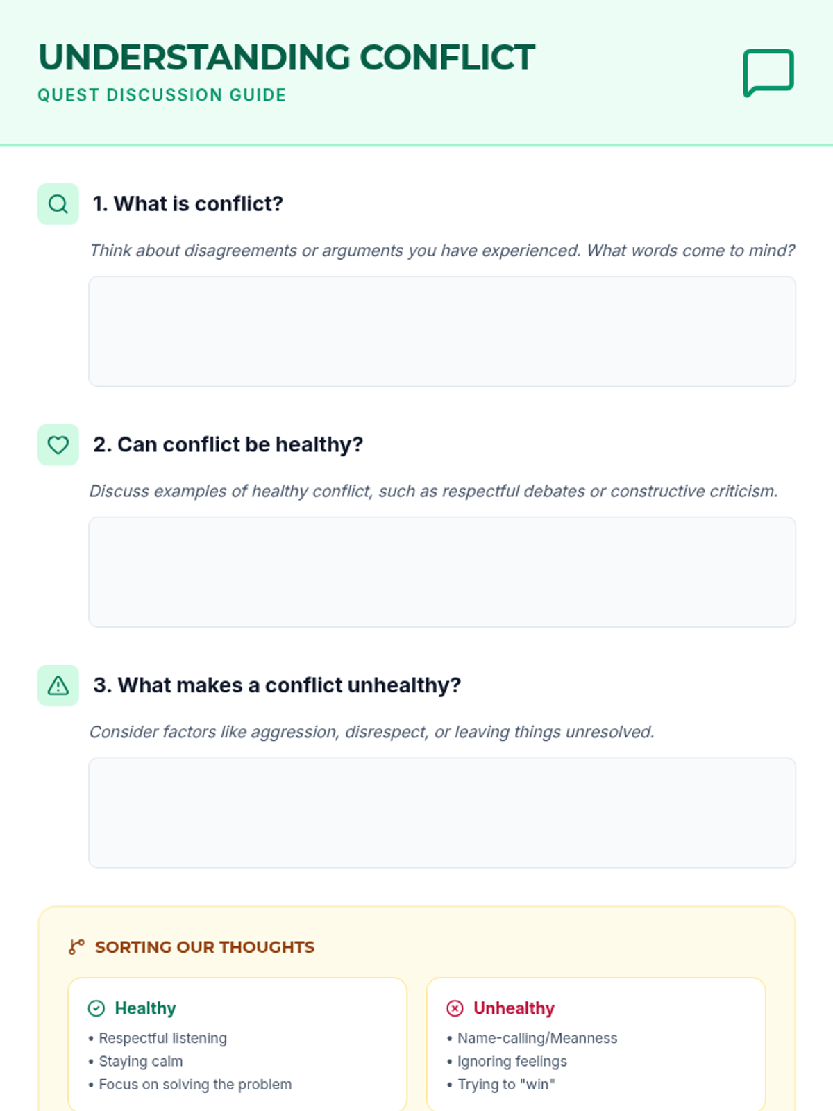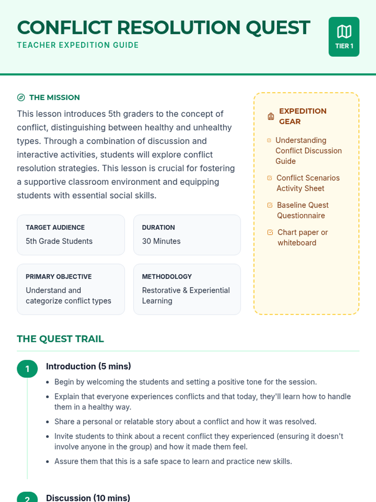 An interactive lesson for 5th graders to explore the nature of conflict, distinguish between healthy and unhealthy types, and practice resolution strategies through role-play and reflection.