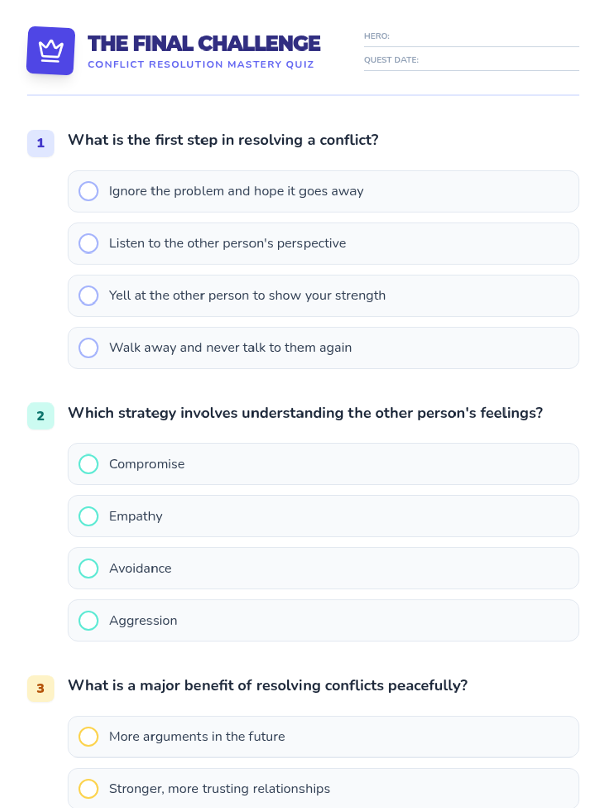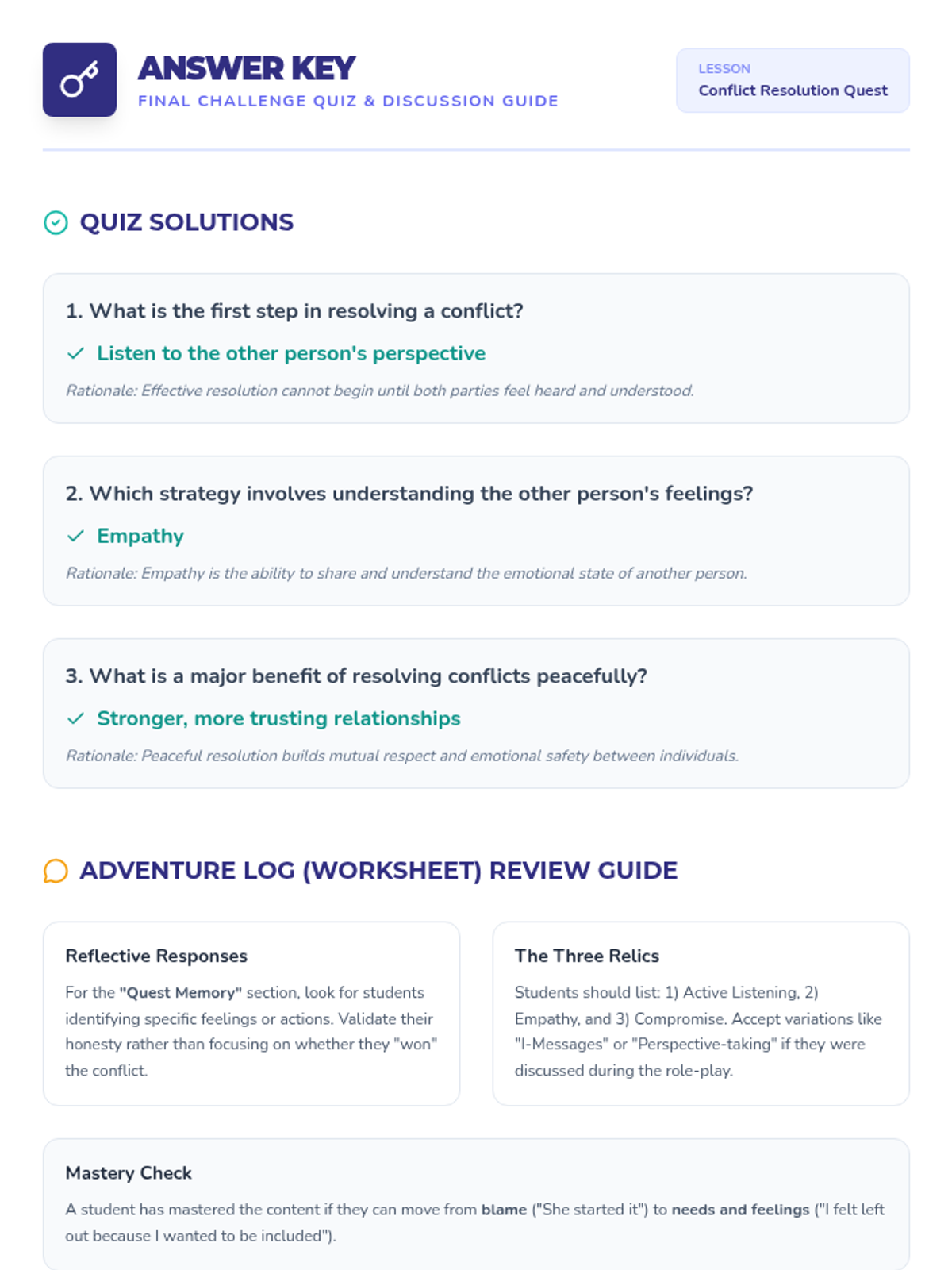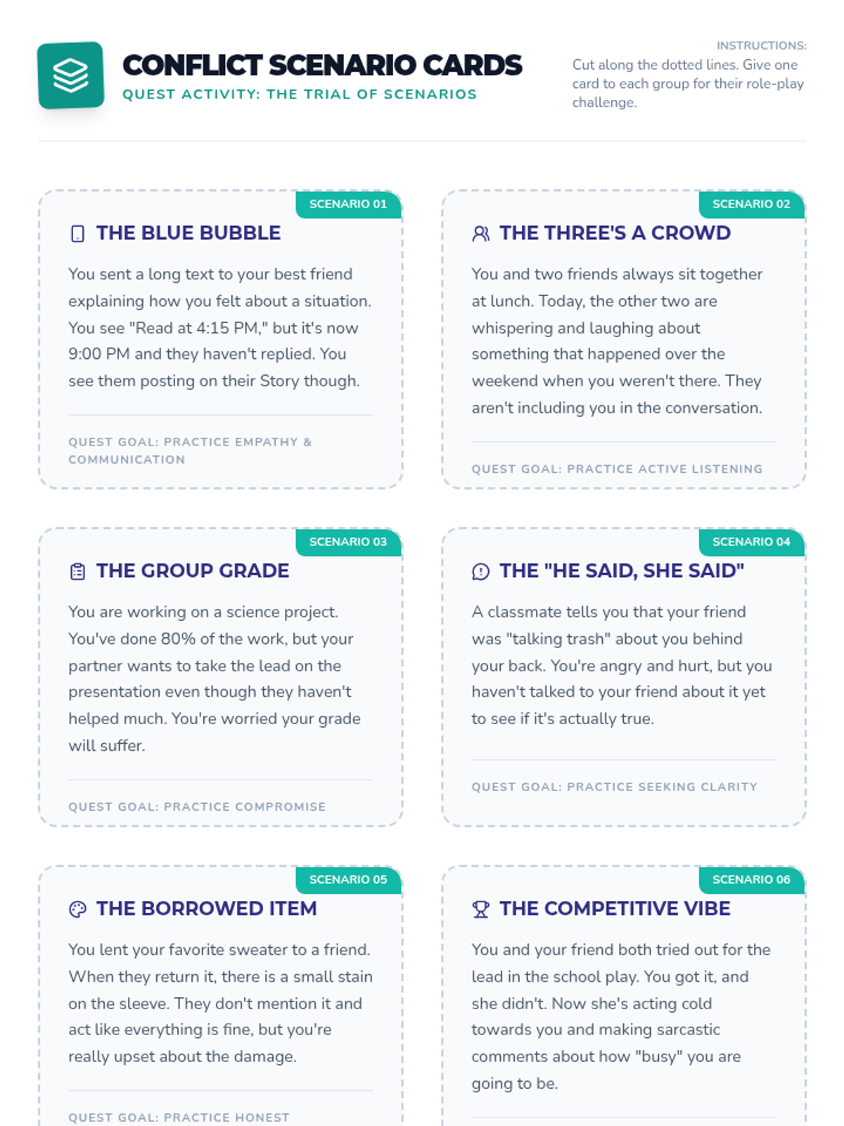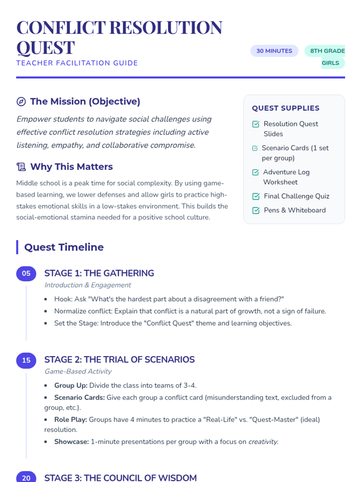 This lesson engages 8th grade girls in learning conflict resolution through interactive games and activities. By using Game-Based Learning and Active Learning strategies, students will explore different conflict scenarios and practice resolution techniques in a supportive environment. This lesson is important as it equips students with essential life skills to manage conflicts constructively, fostering a positive school climate and enhancing their social-emotional development.