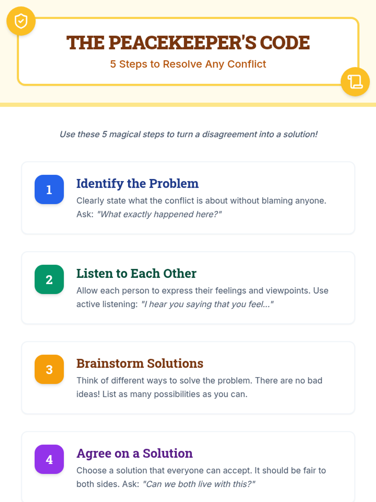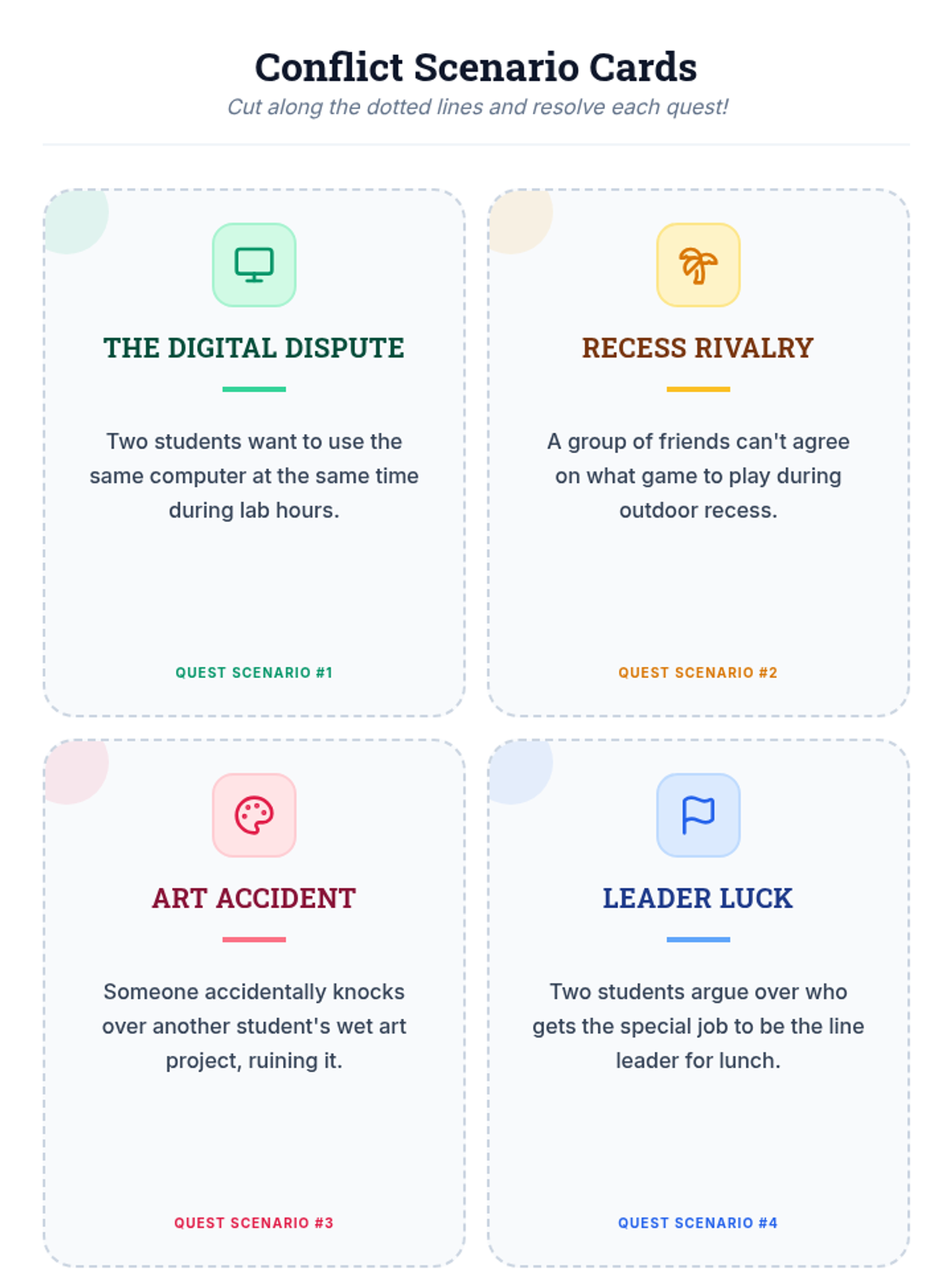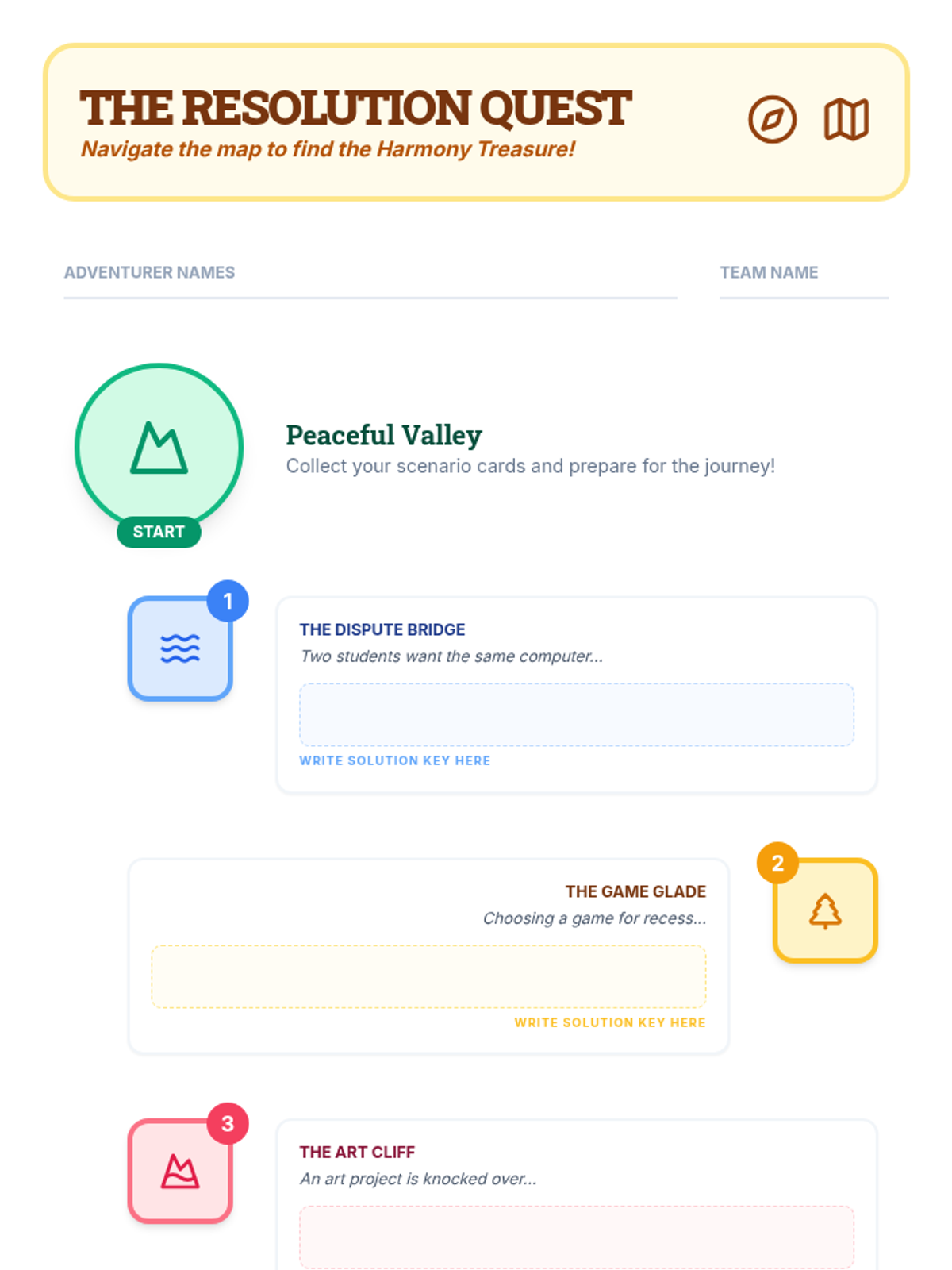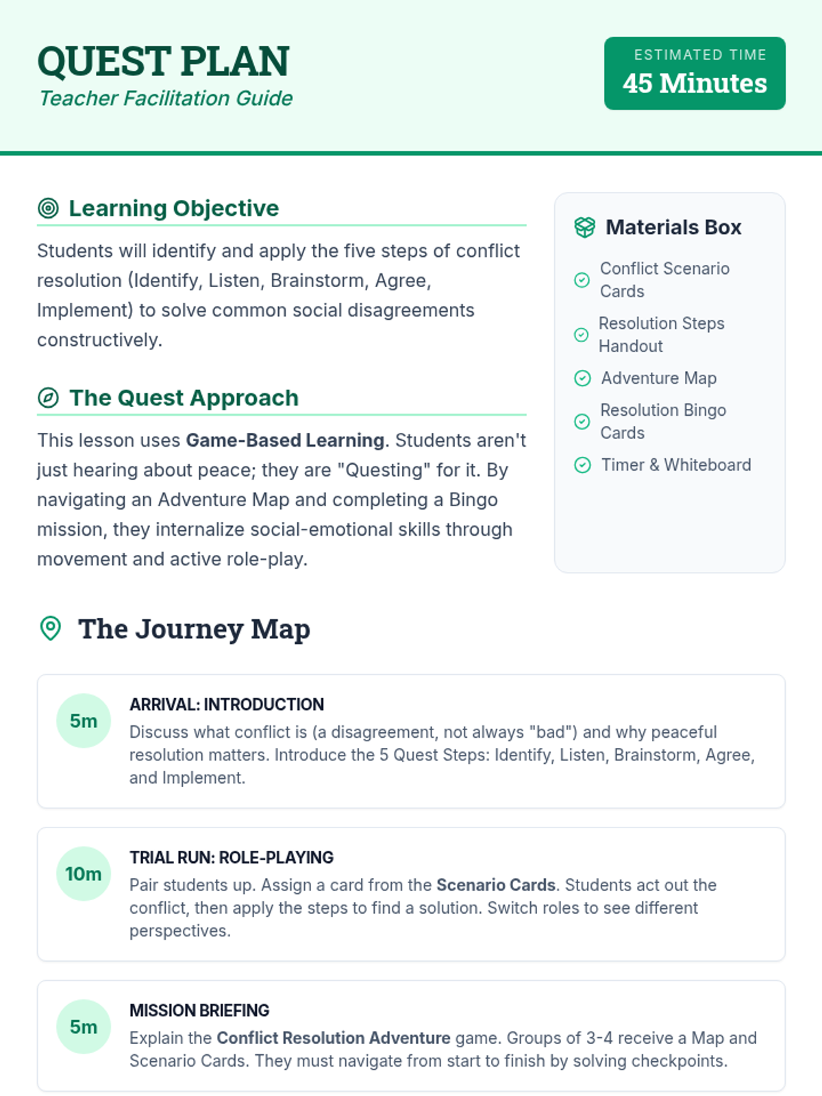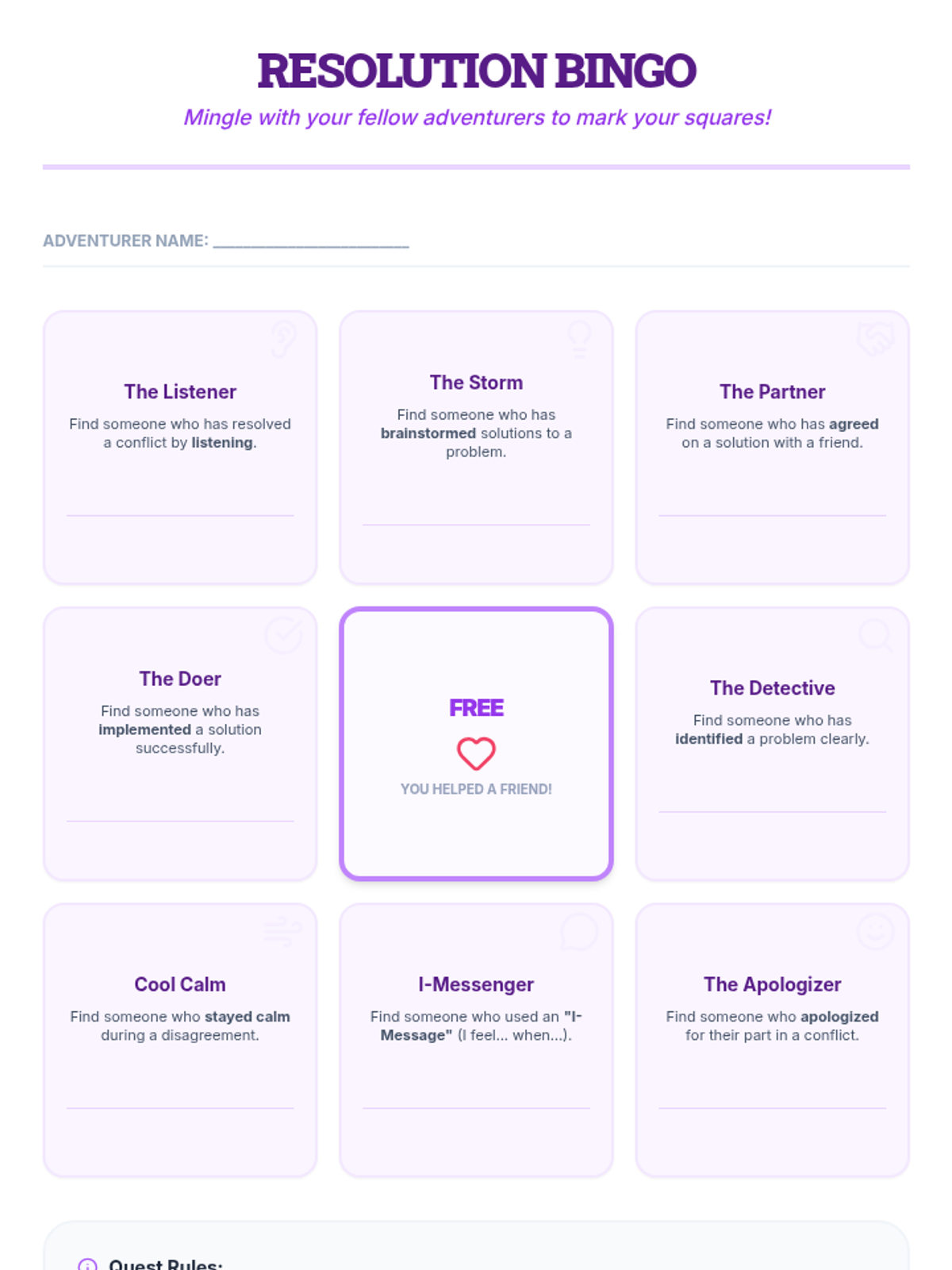 A game-based lesson for 4th graders to master conflict resolution through an interactive 'Adventure Map' and Bingo game. Students practice identifying problems, listening, and brainstorming solutions in a quest-themed environment.