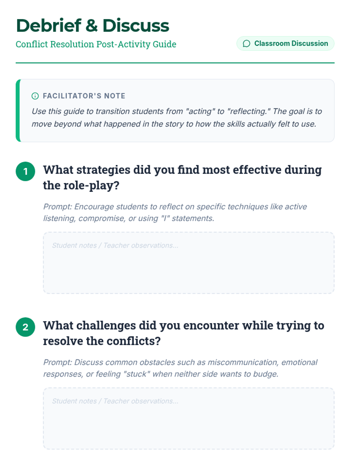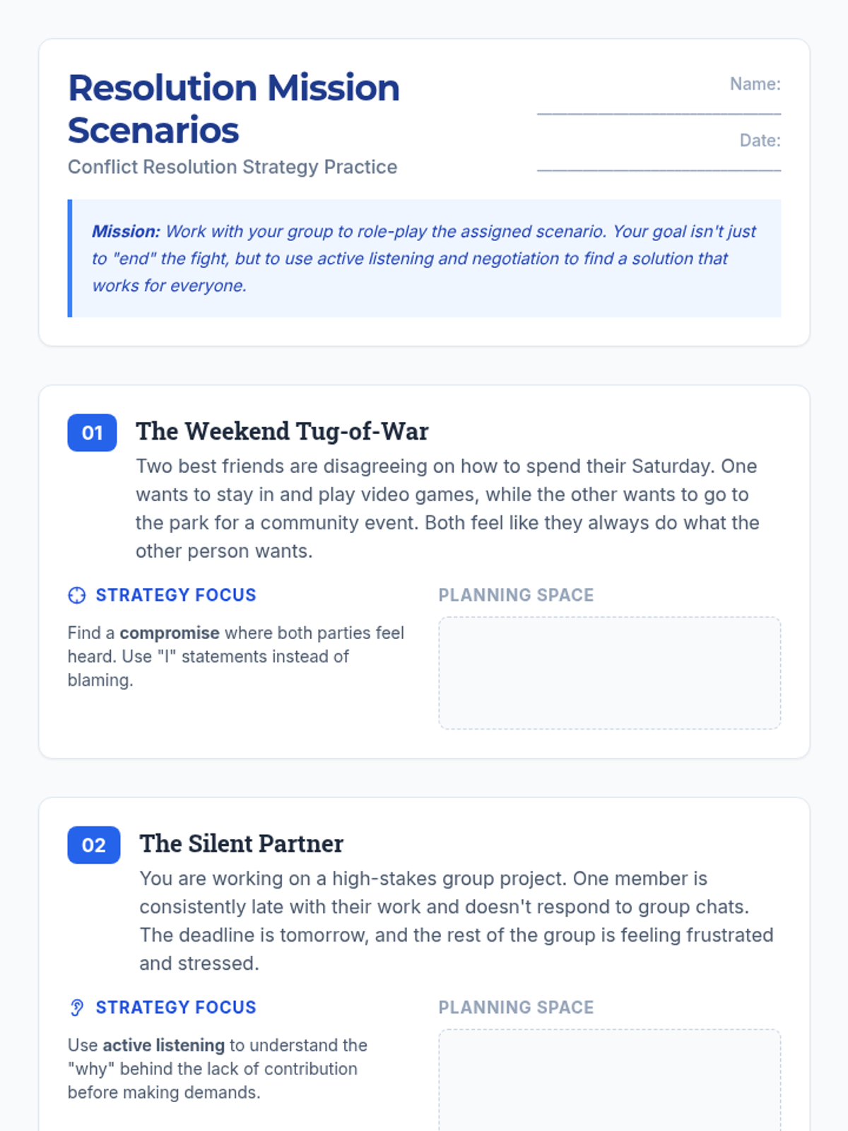 Students practice conflict resolution strategies through interactive role-playing scenarios, focusing on active listening, negotiation, and finding common ground.