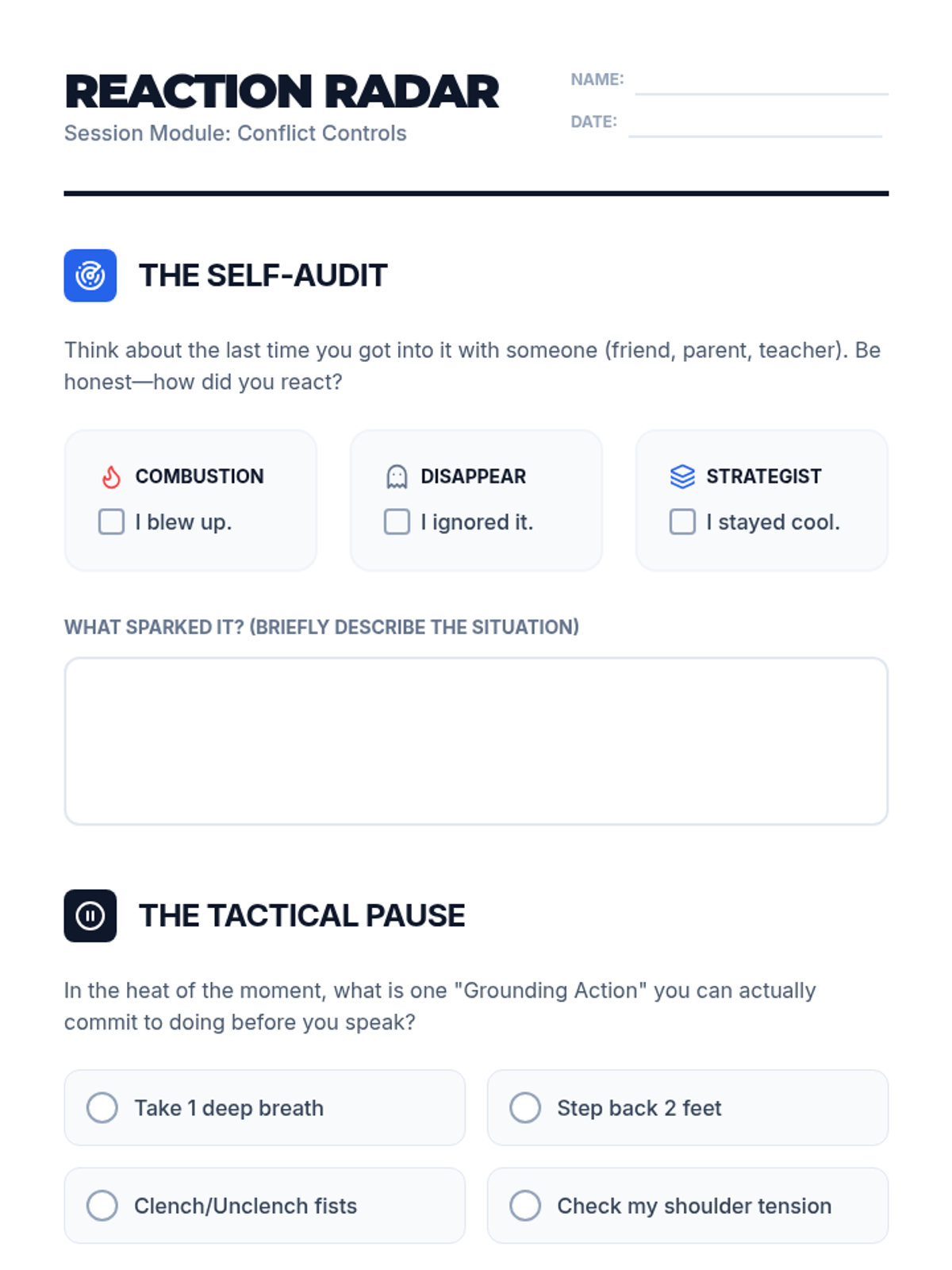 Students will explore a variety of sensory and cognitive coping strategies. They will evaluate which techniques work best for them and begin building their personal 'Coping Menu'.