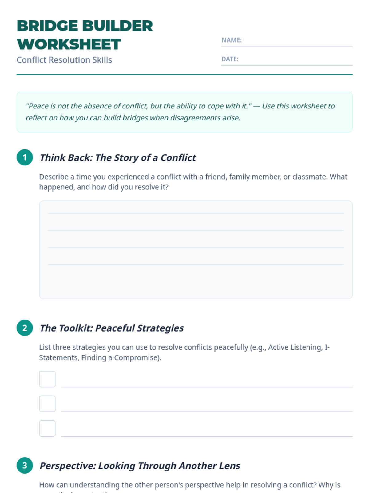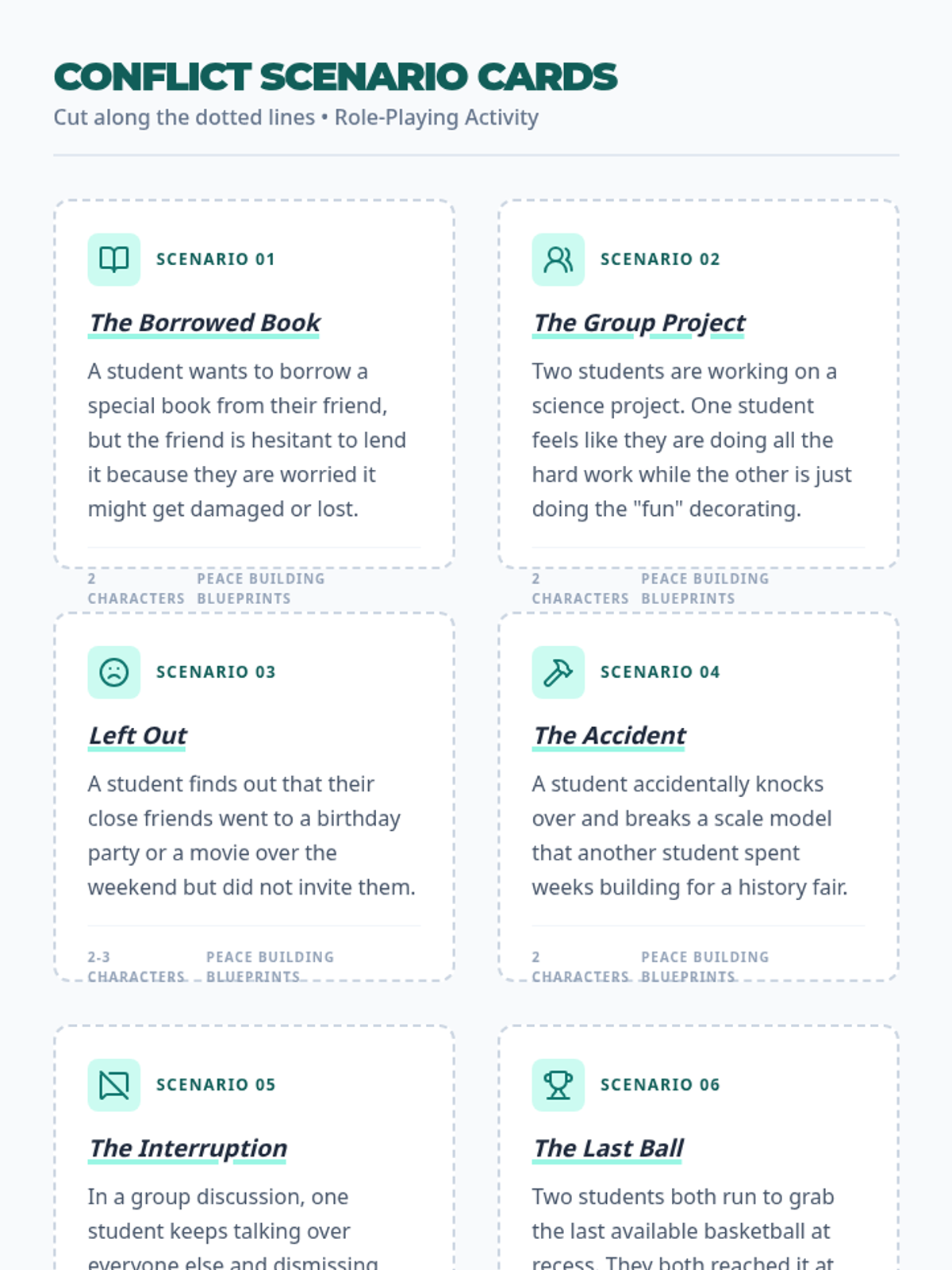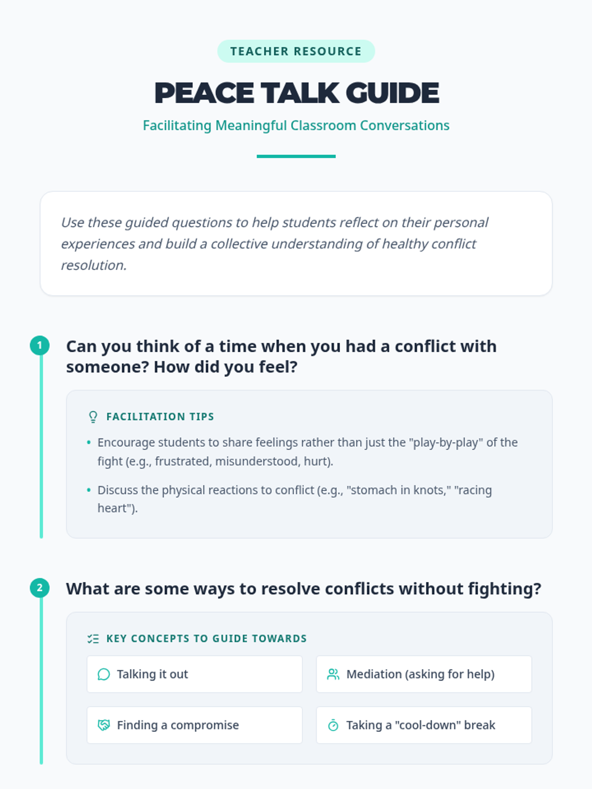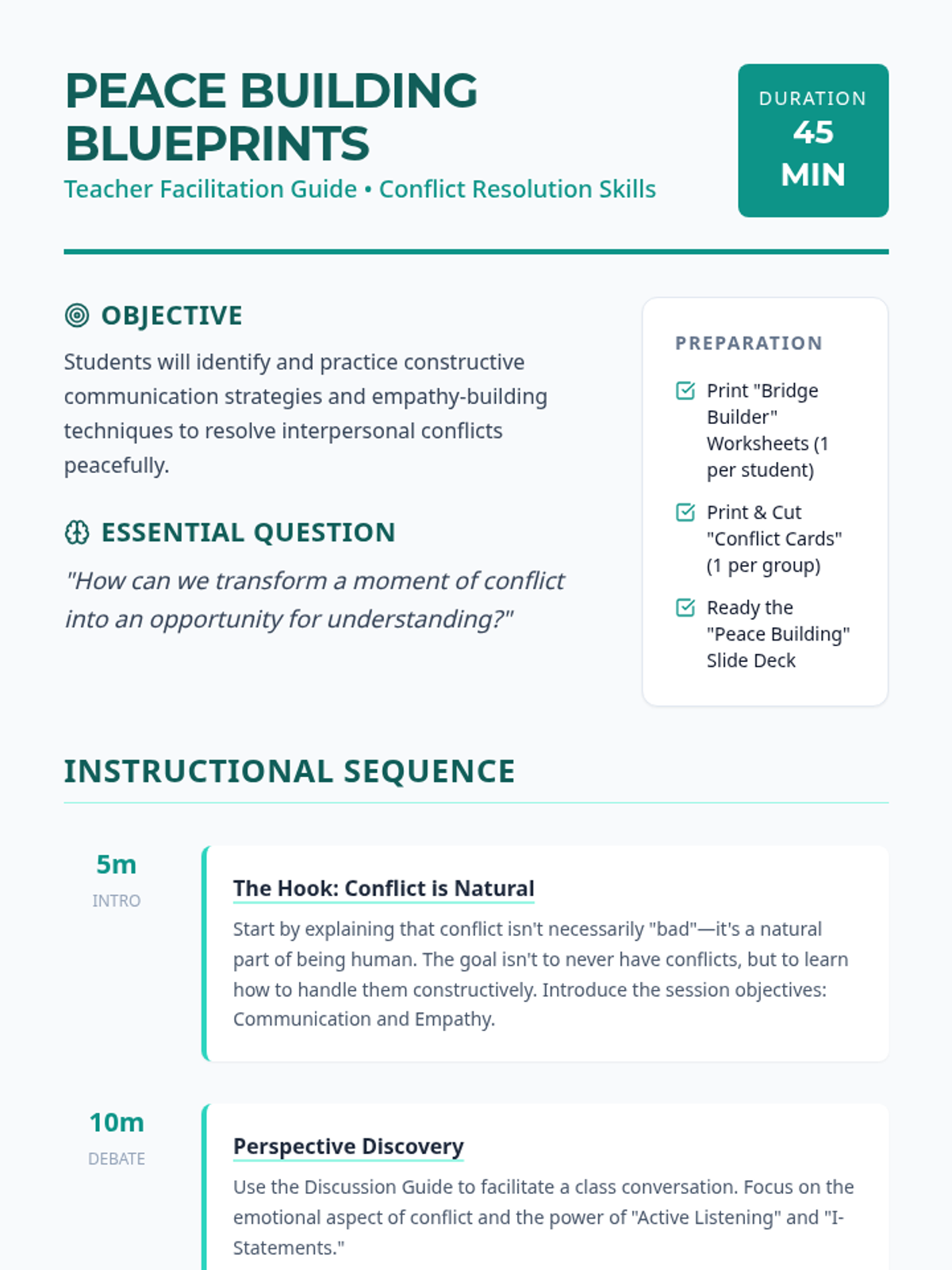 A 45-minute interactive lesson for 6th graders focused on practical conflict resolution strategies, empathy-building, and communication through role-playing scenarios.