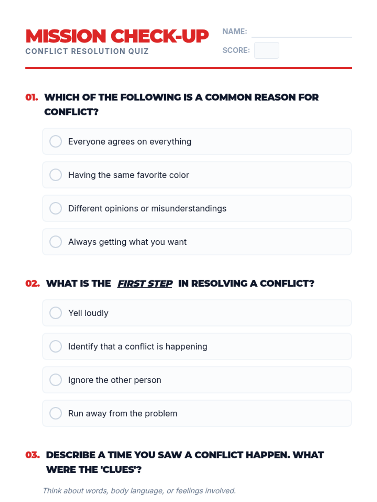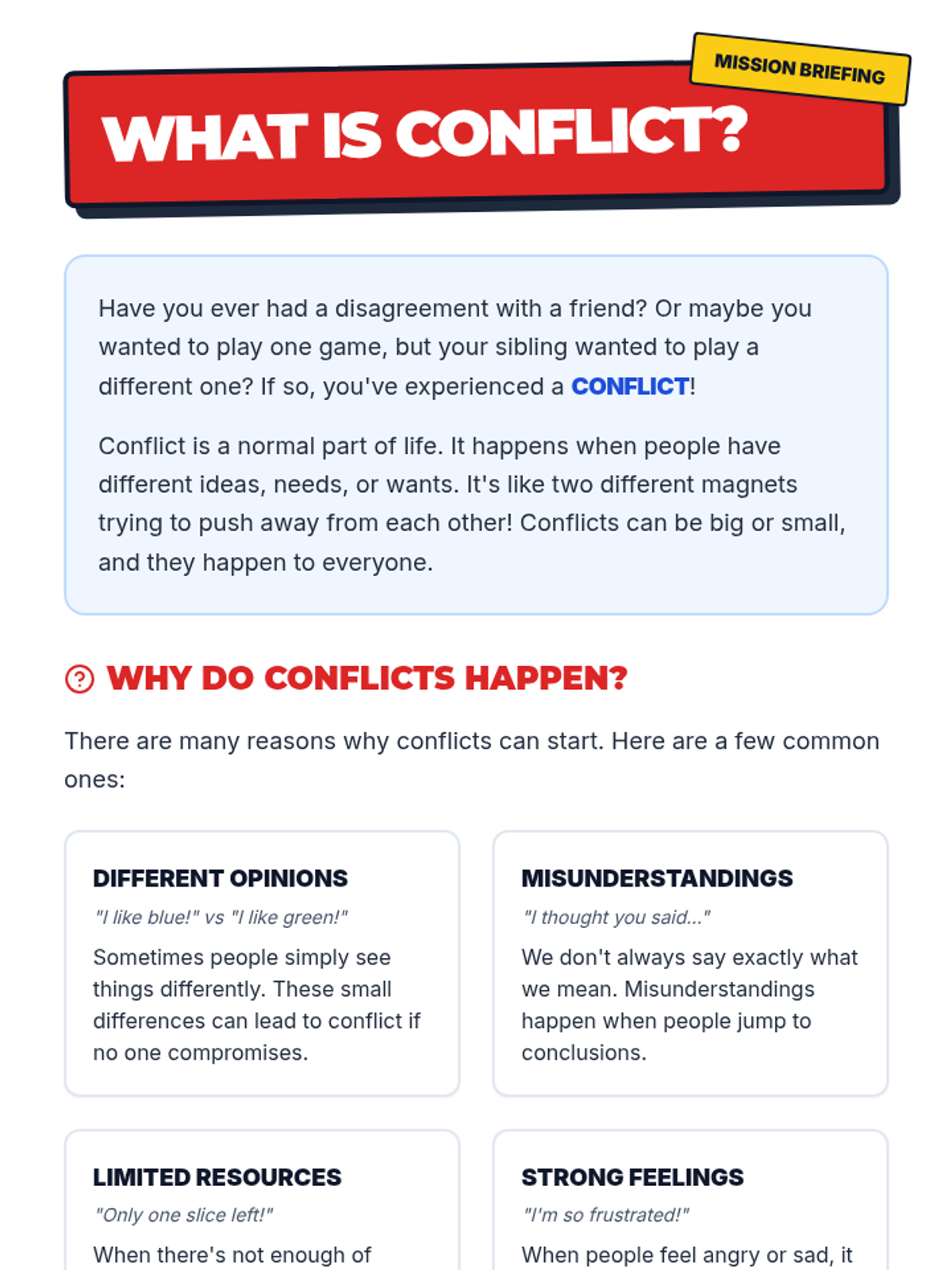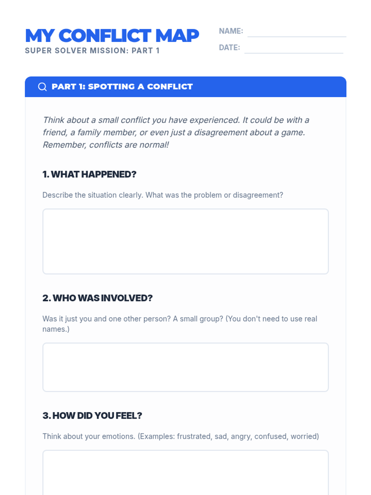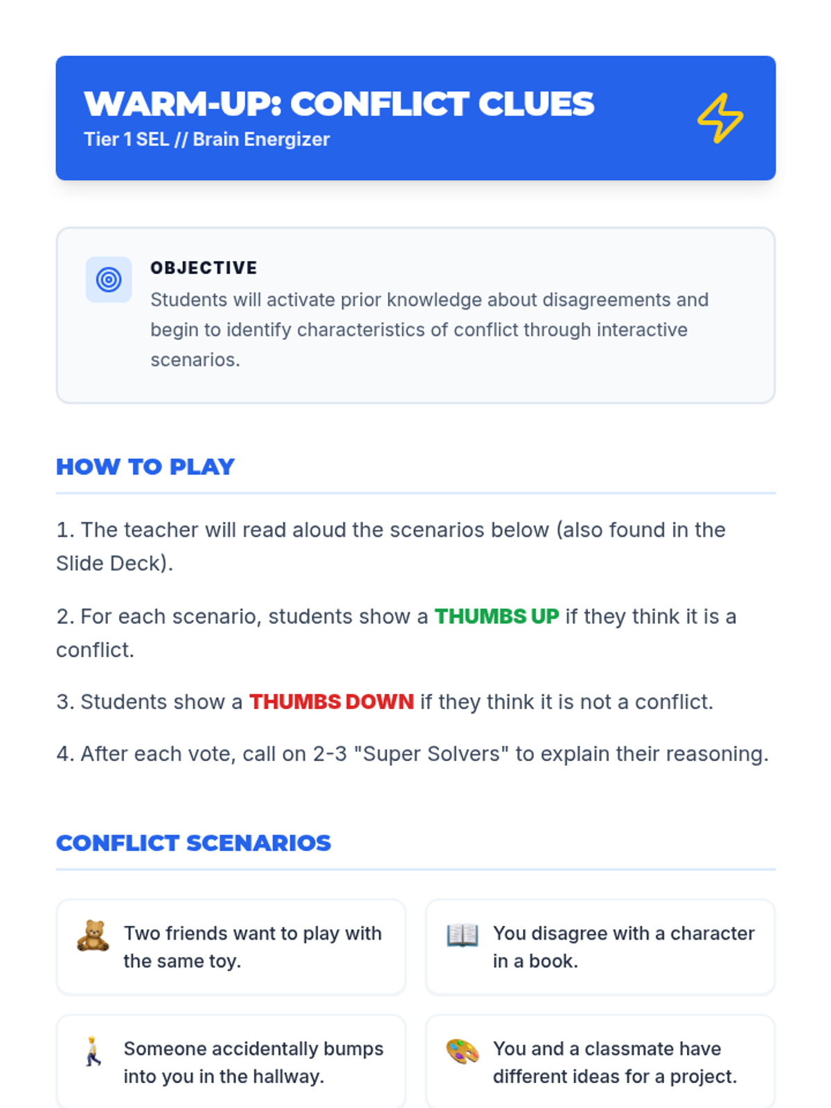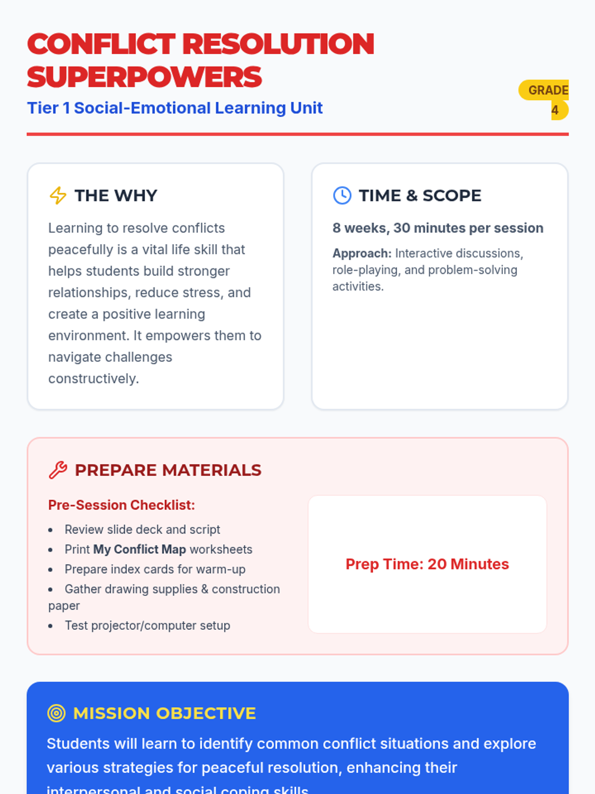 This 8-week unit helps 4th-grade students develop essential interpersonal, social, and academic coping skills by focusing on conflict resolution. Students will learn to identify conflicts, understand their causes, and practice peaceful resolution strategies through engaging activities and role-plays.