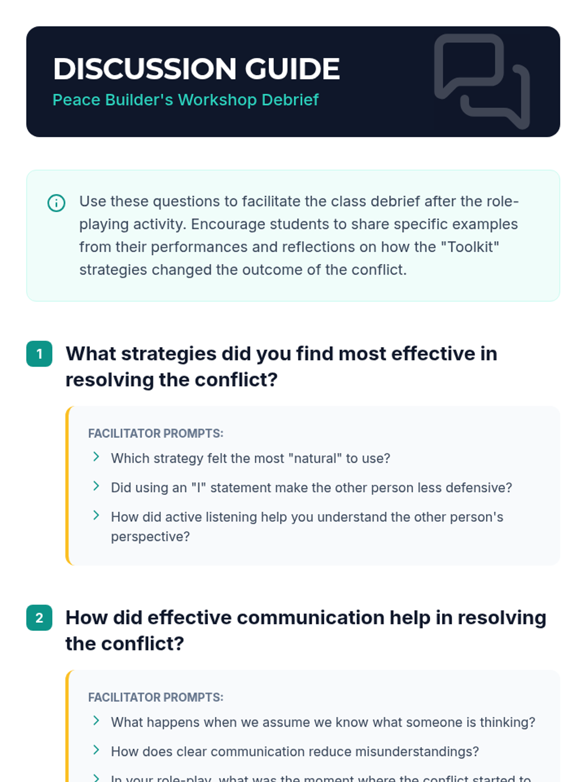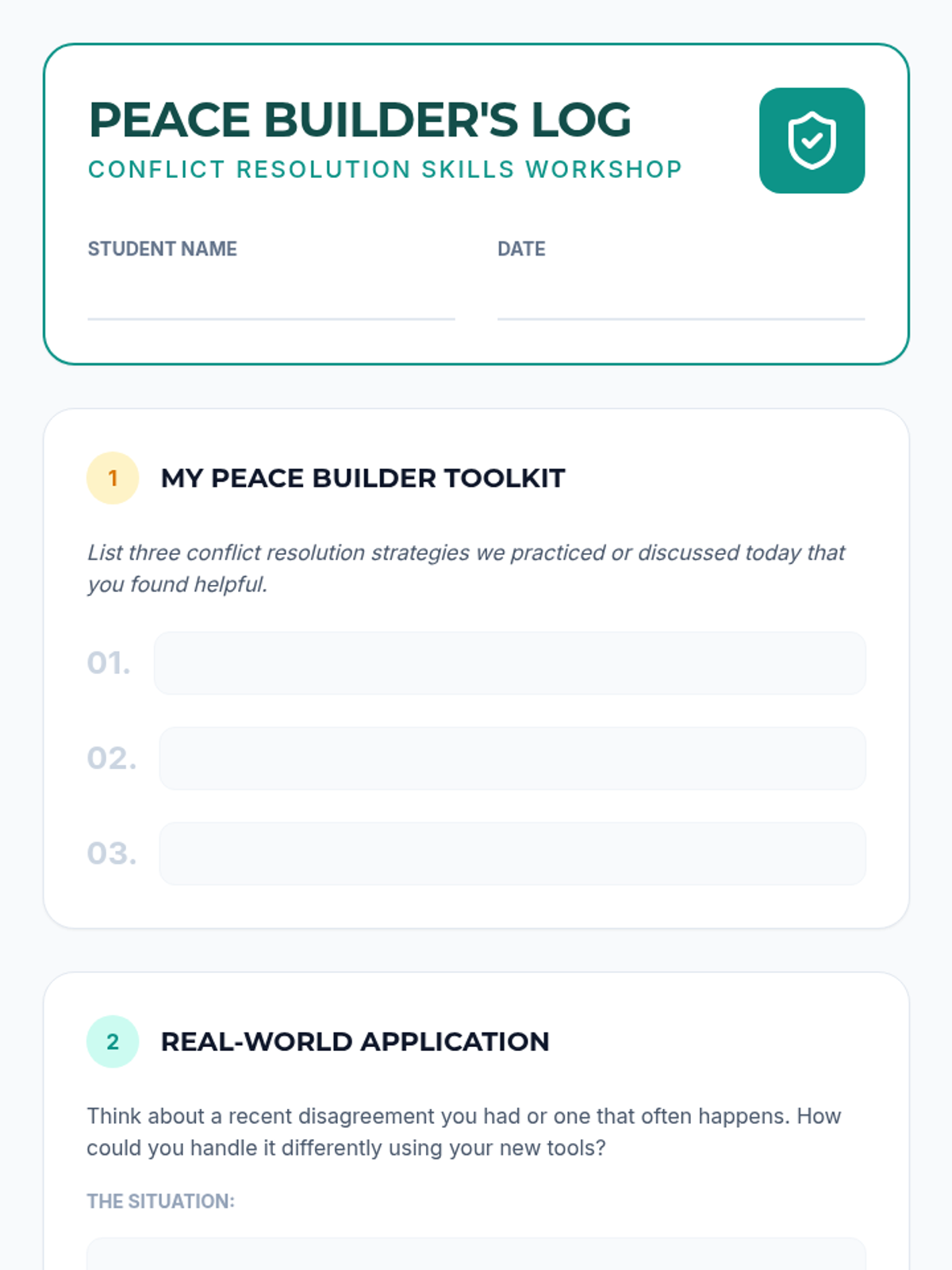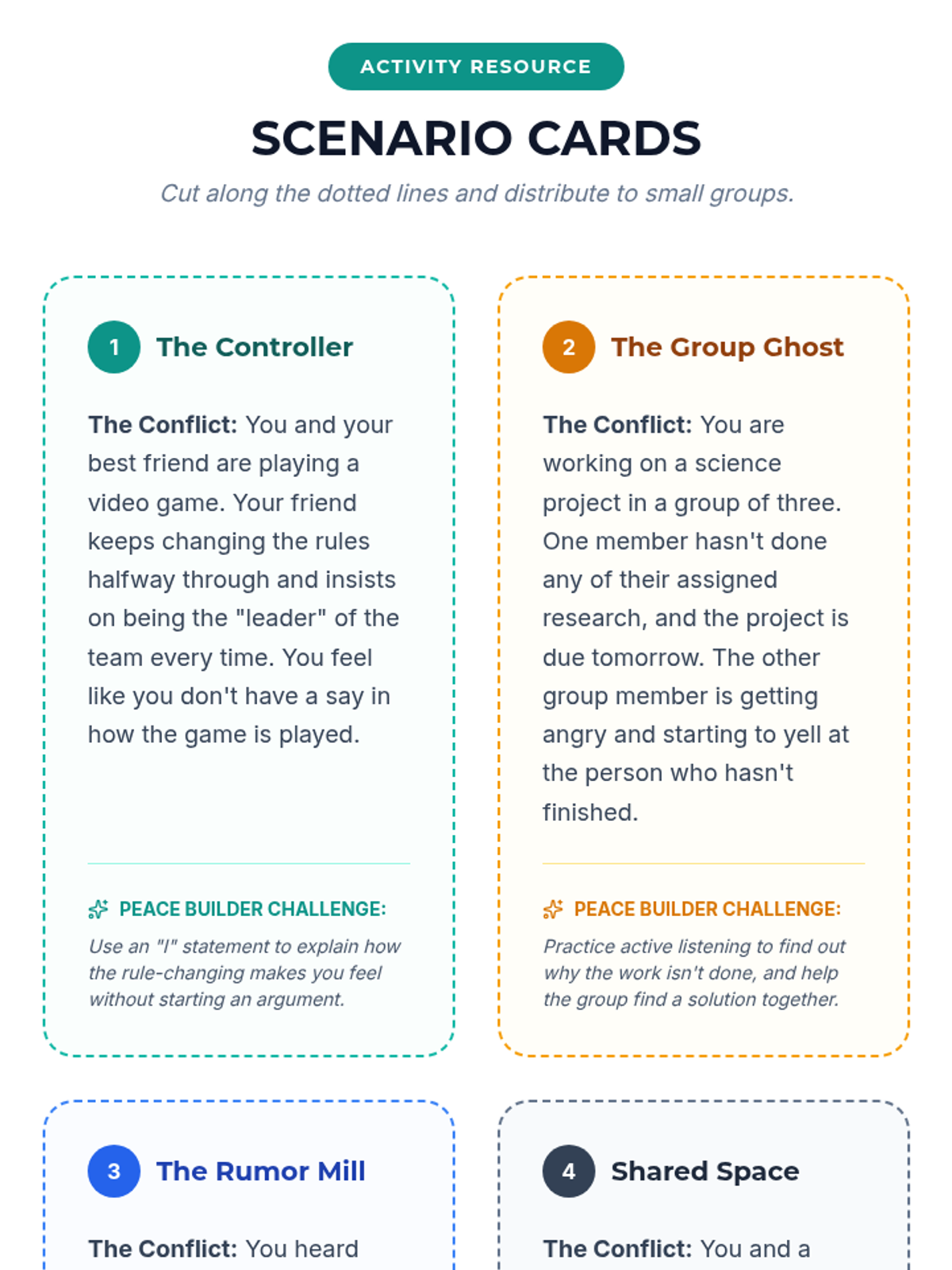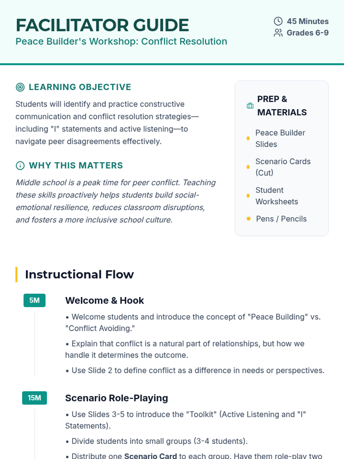 This interactive workshop teaches middle school students how to navigate disagreements using effective communication and constructive resolution strategies through role-playing and reflection.