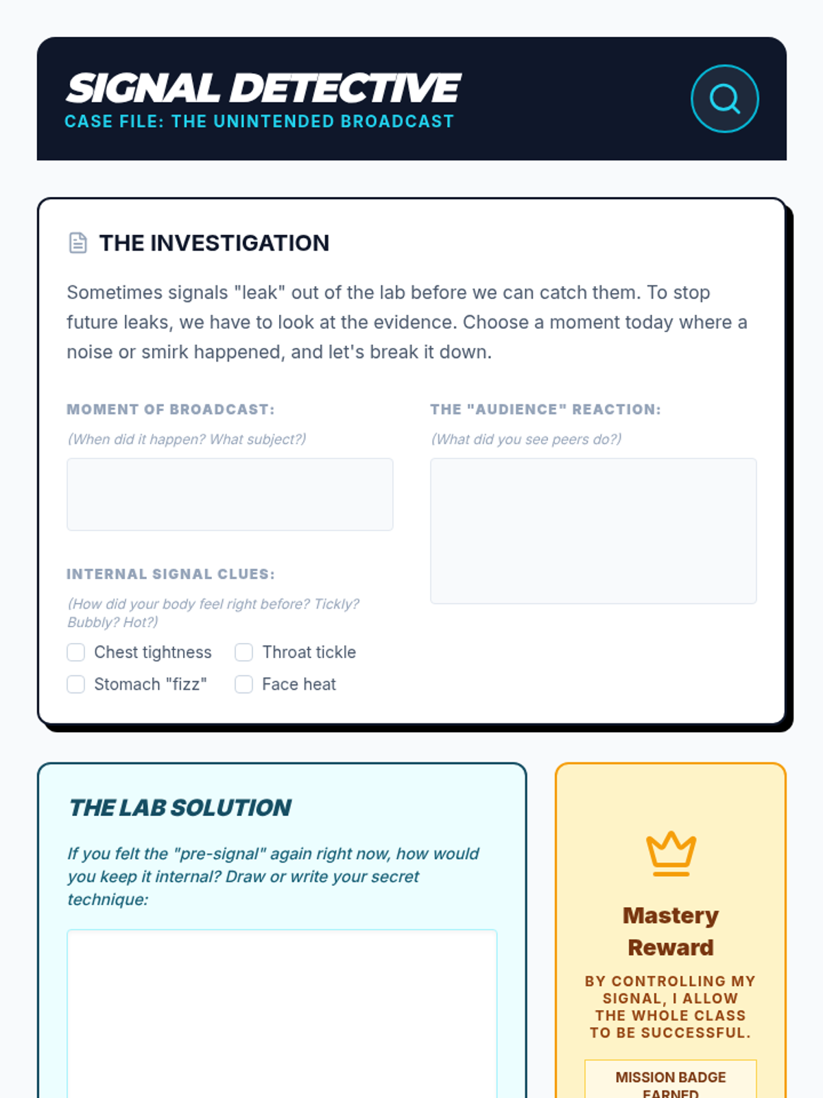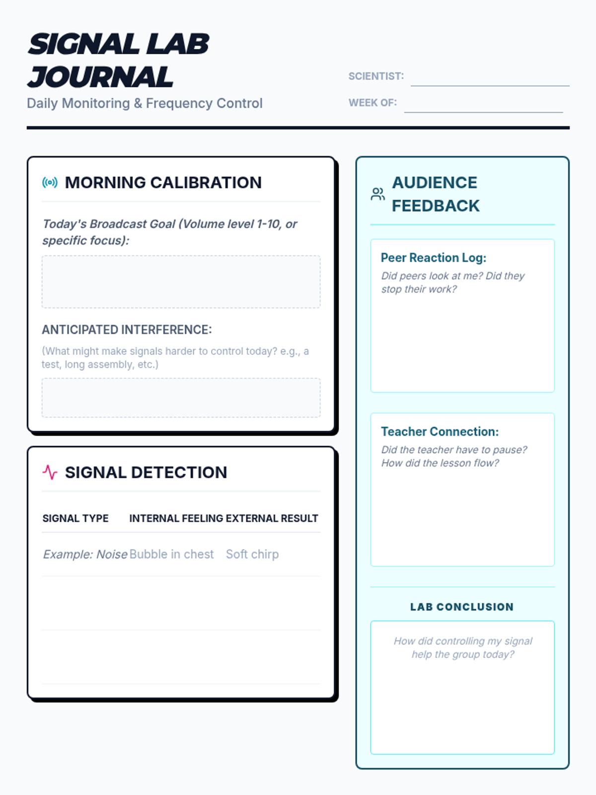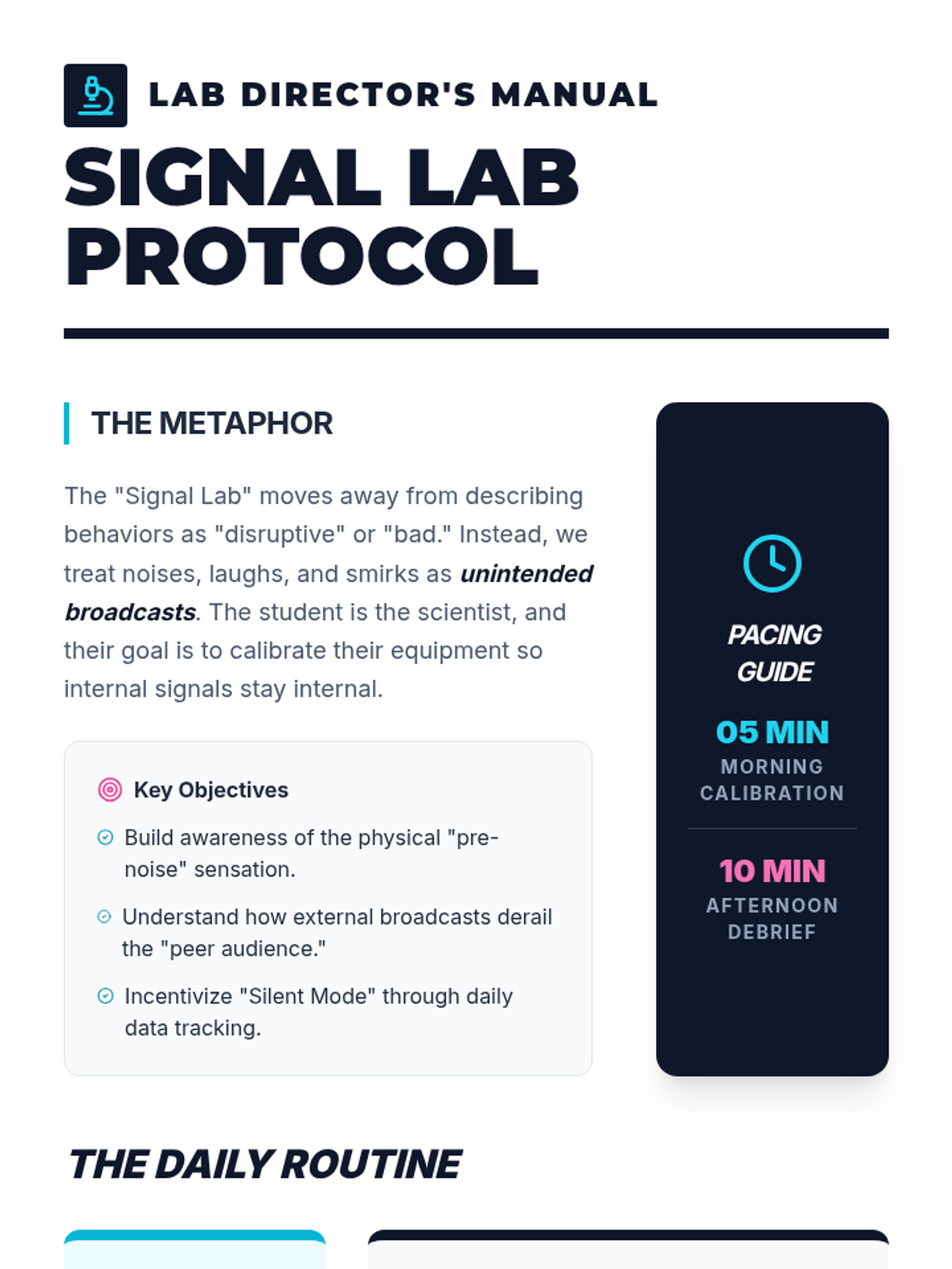 A 10-15 minute daily check-in routine designed to help students build self-awareness regarding disruptive noises and expressions, focusing on 'signals' and 'impact'.