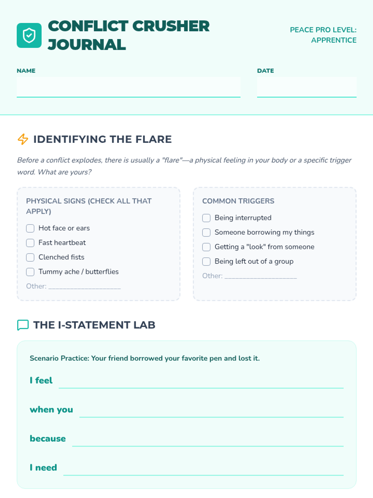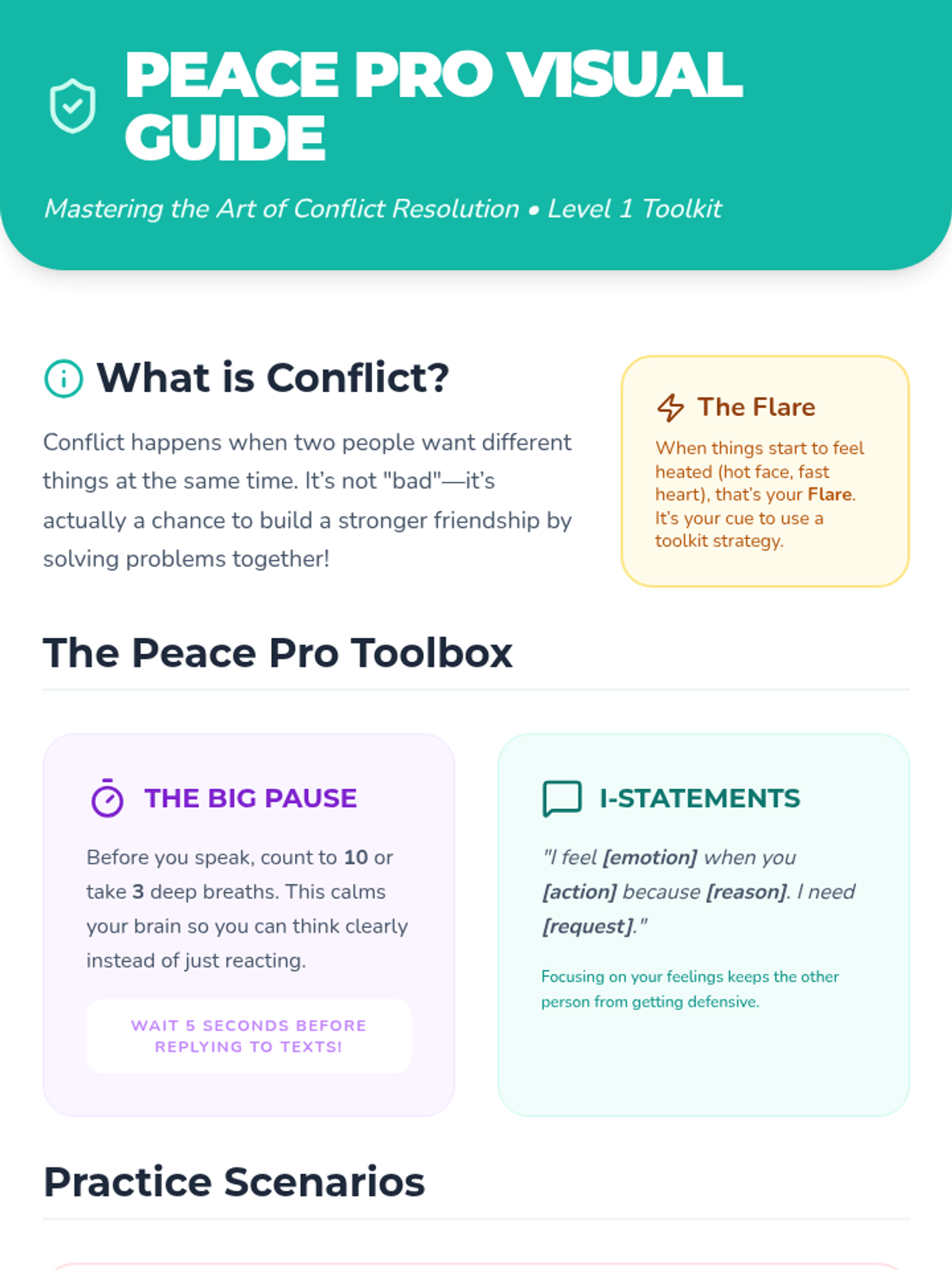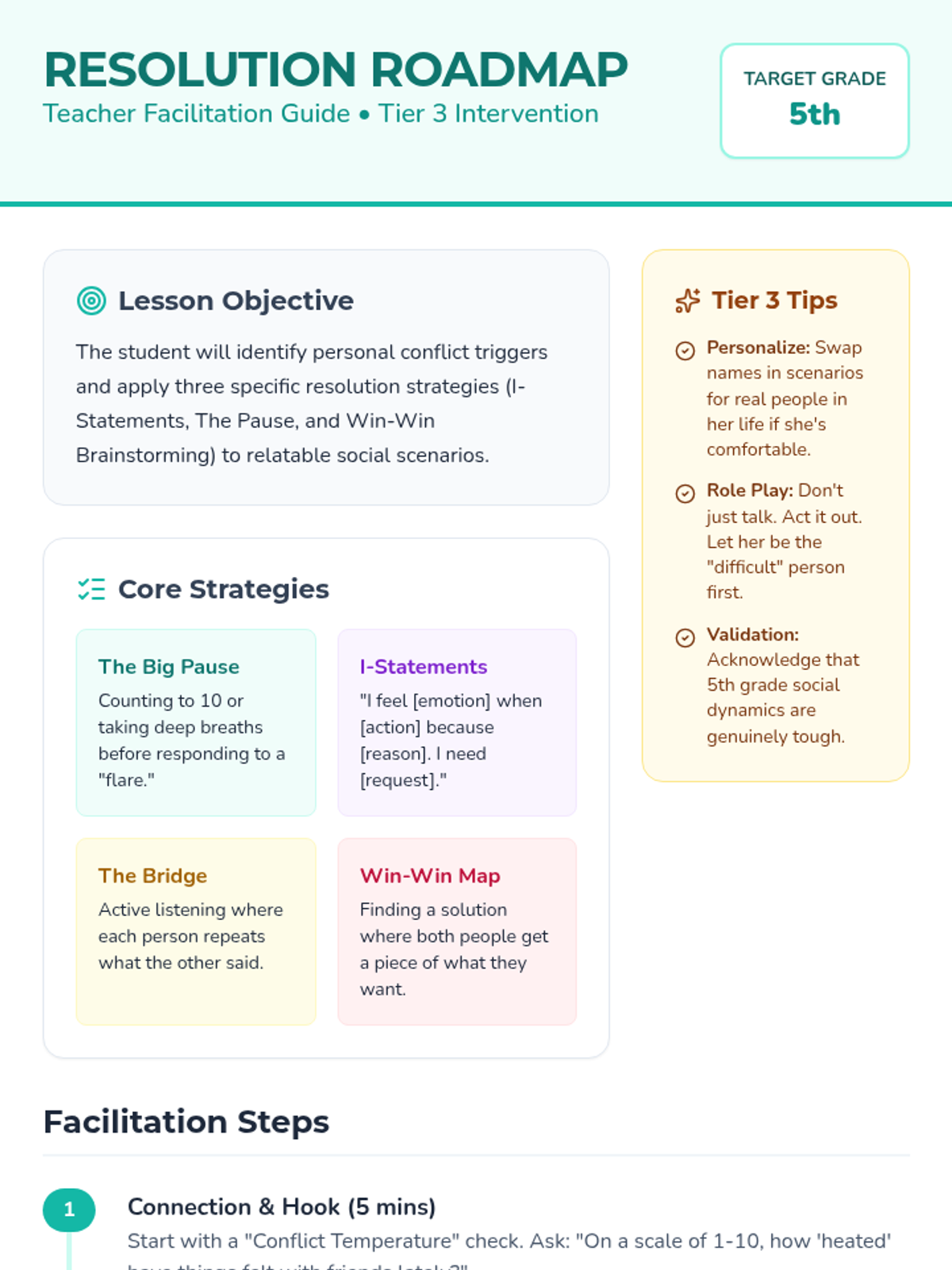 A Tier 3 social-emotional learning lesson focused on empowering a 5th-grade student with concrete conflict resolution strategies through guided practice and relatable scenarios.
