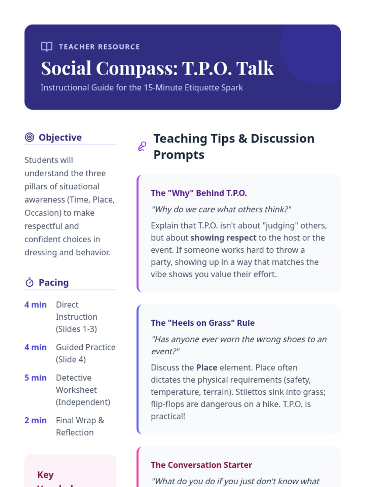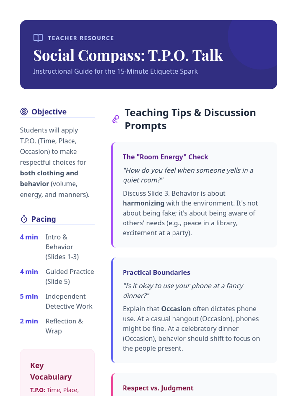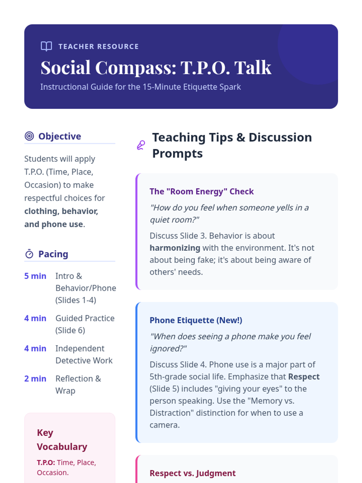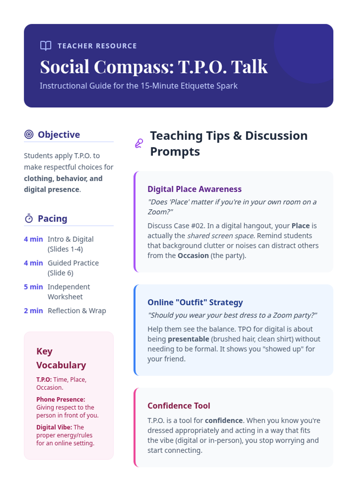 A quick 15-minute introductory lesson on Time, Place, and Occasion (TPO) to help 5th-grade girls navigate social contexts and dress codes with confidence.