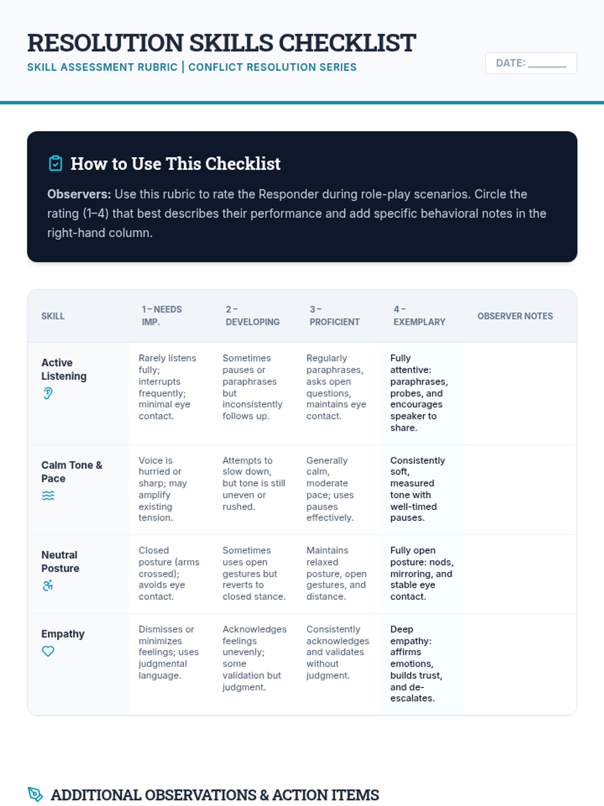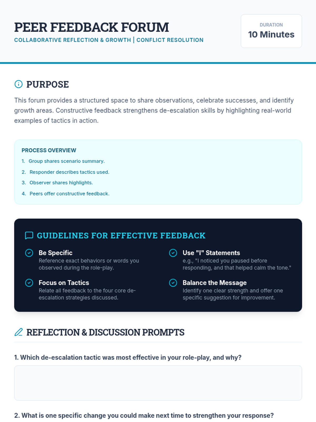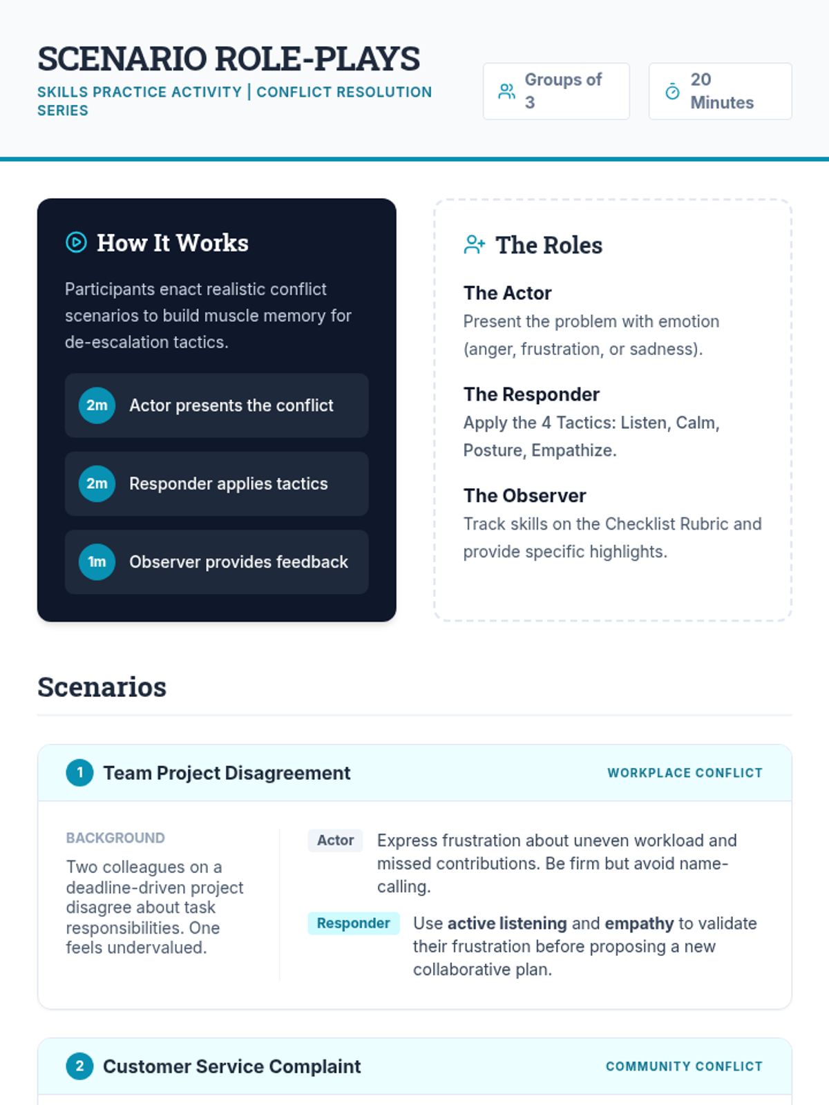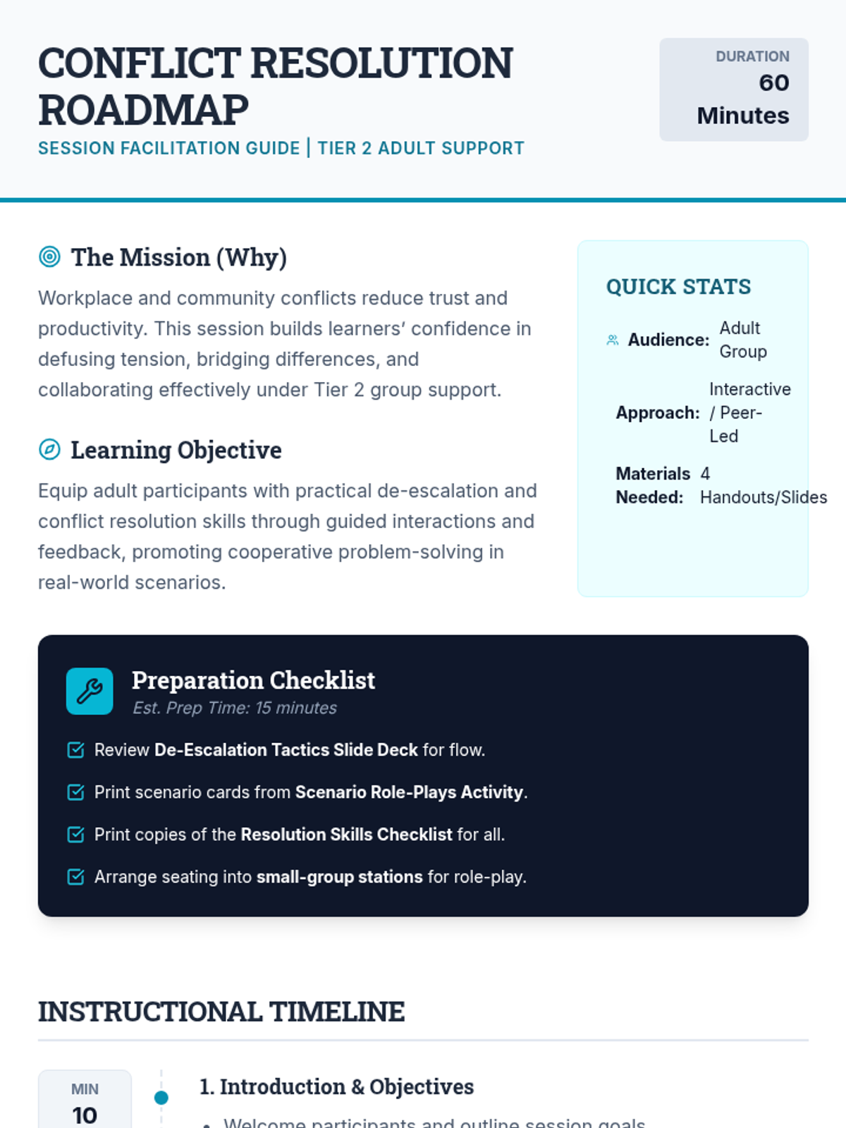 A 60-minute Tier 2 group lesson for adults focusing on de-escalation tactics and conflict resolution. Participants engage in interactive role-plays and peer feedback to build practical workplace and community communication skills.