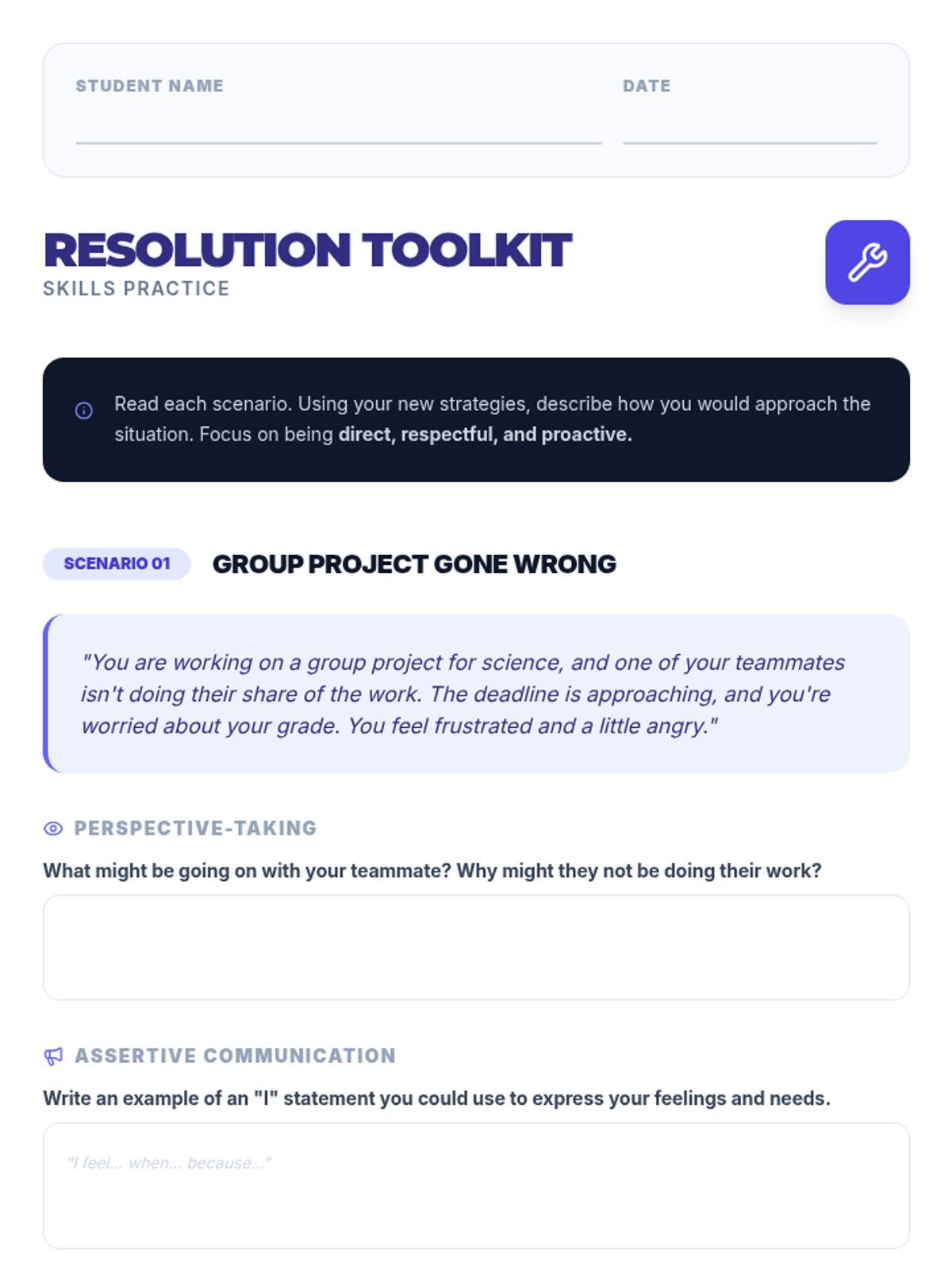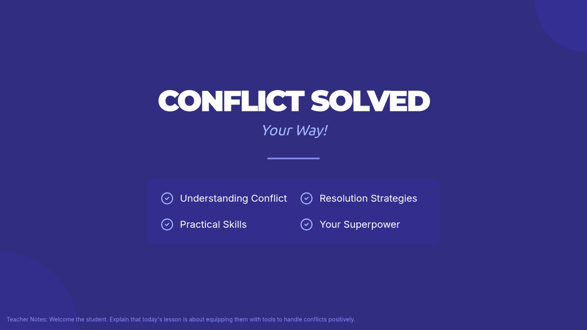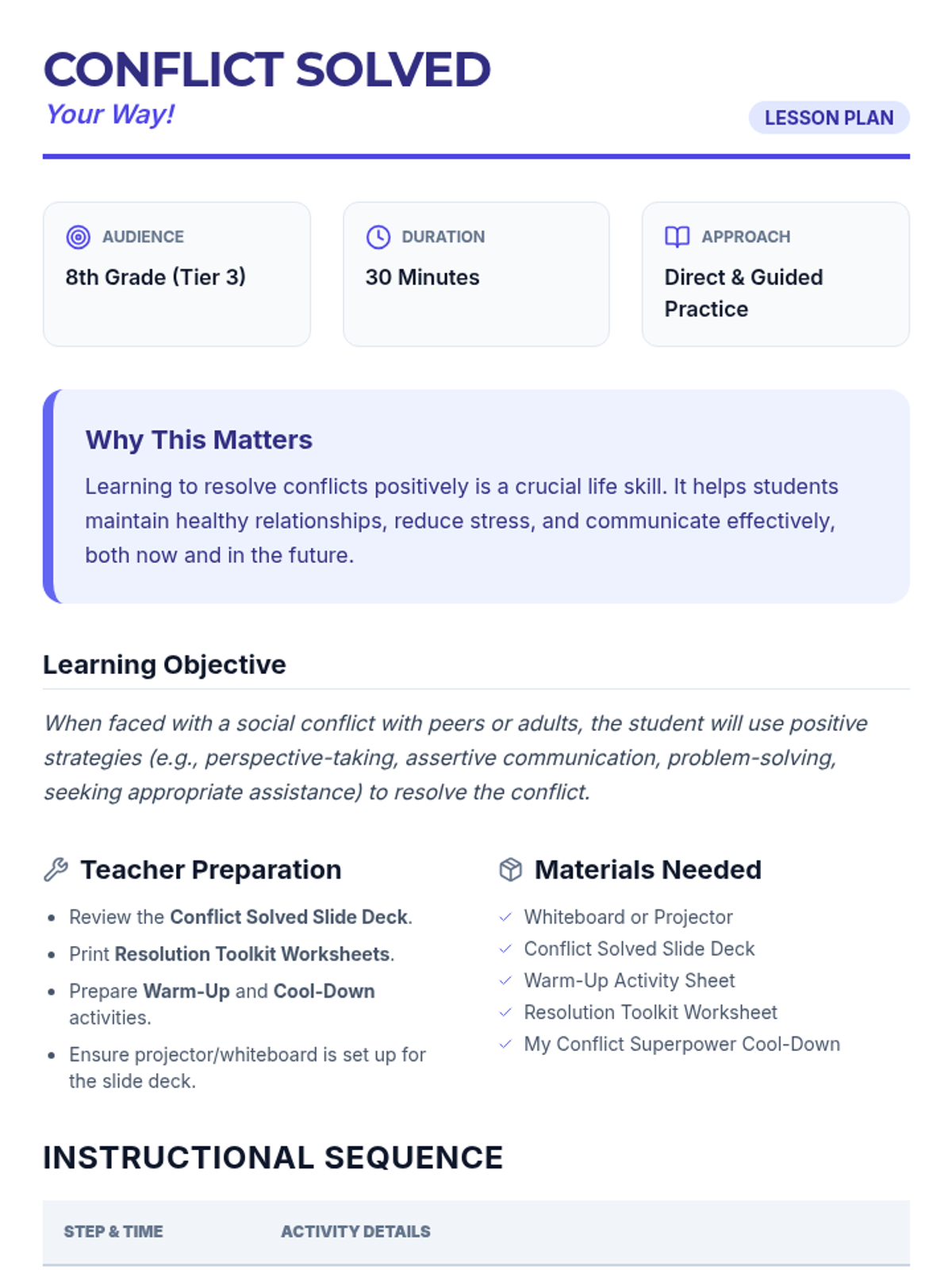A 30-minute Tier 3 intervention lesson for 8th-grade students focusing on four key strategies for positive conflict resolution: perspective-taking, assertive communication, problem-solving, and seeking assistance.