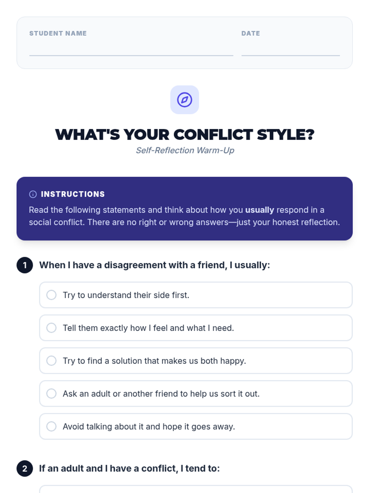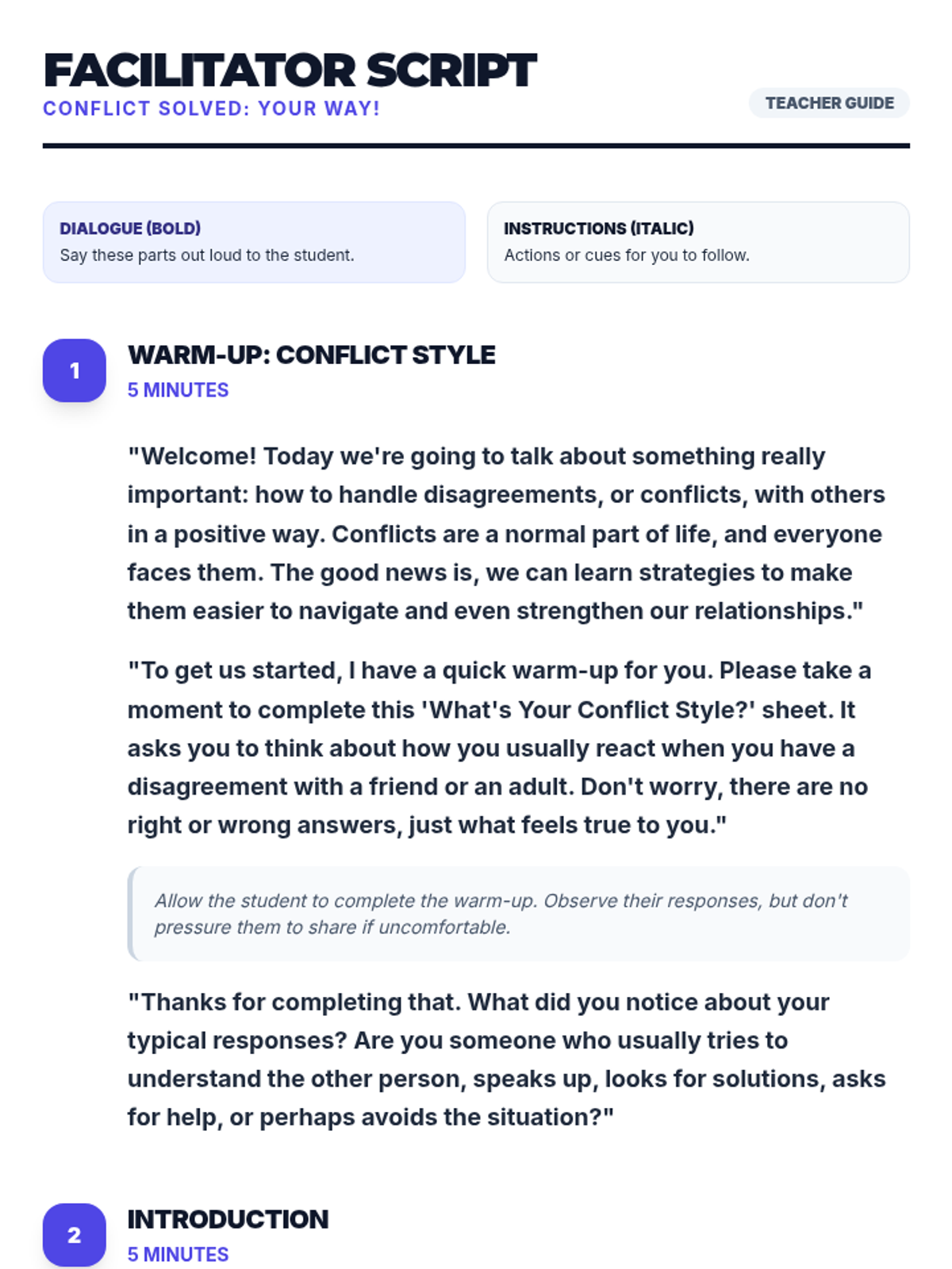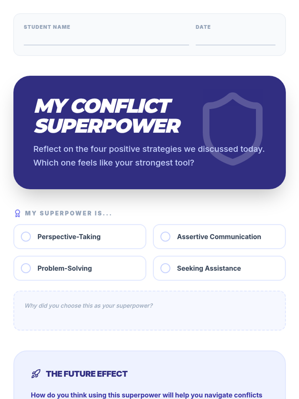 A 30-minute Tier 3 intervention lesson for 8th-grade students focusing on four key strategies for positive conflict resolution: perspective-taking, assertive communication, problem-solving, and seeking assistance.