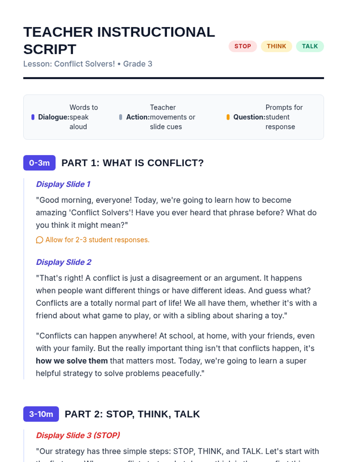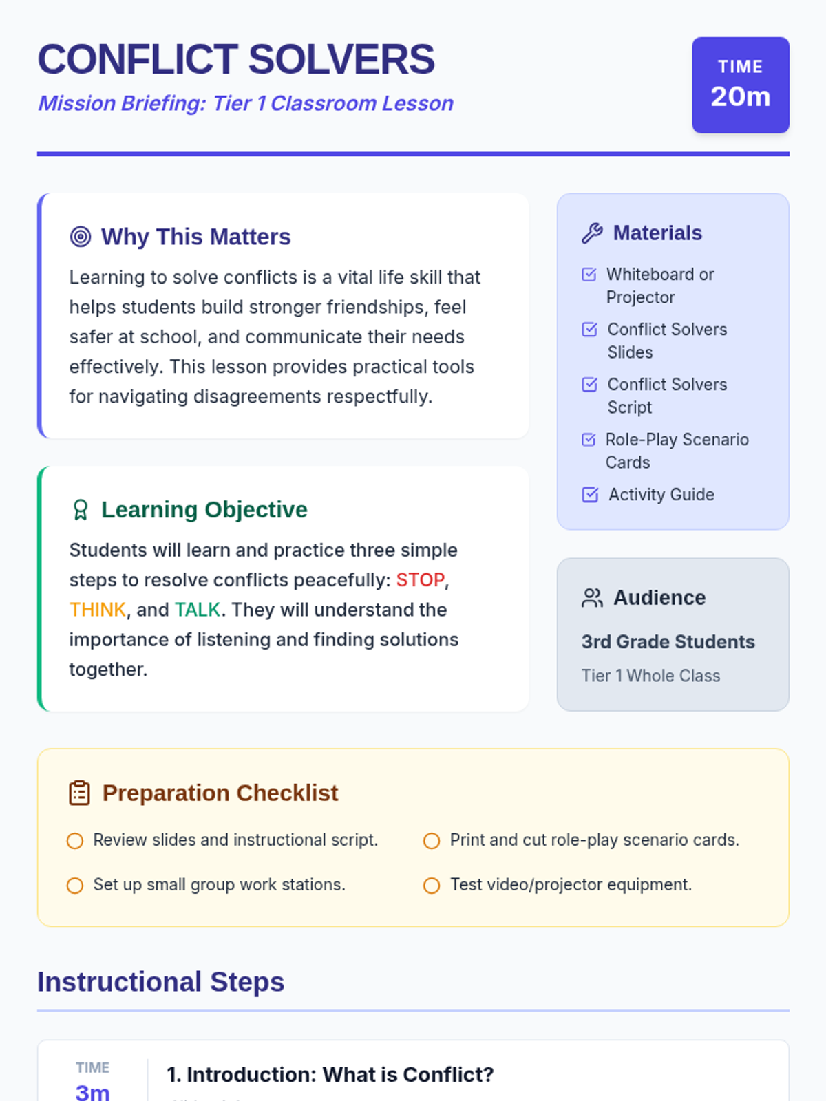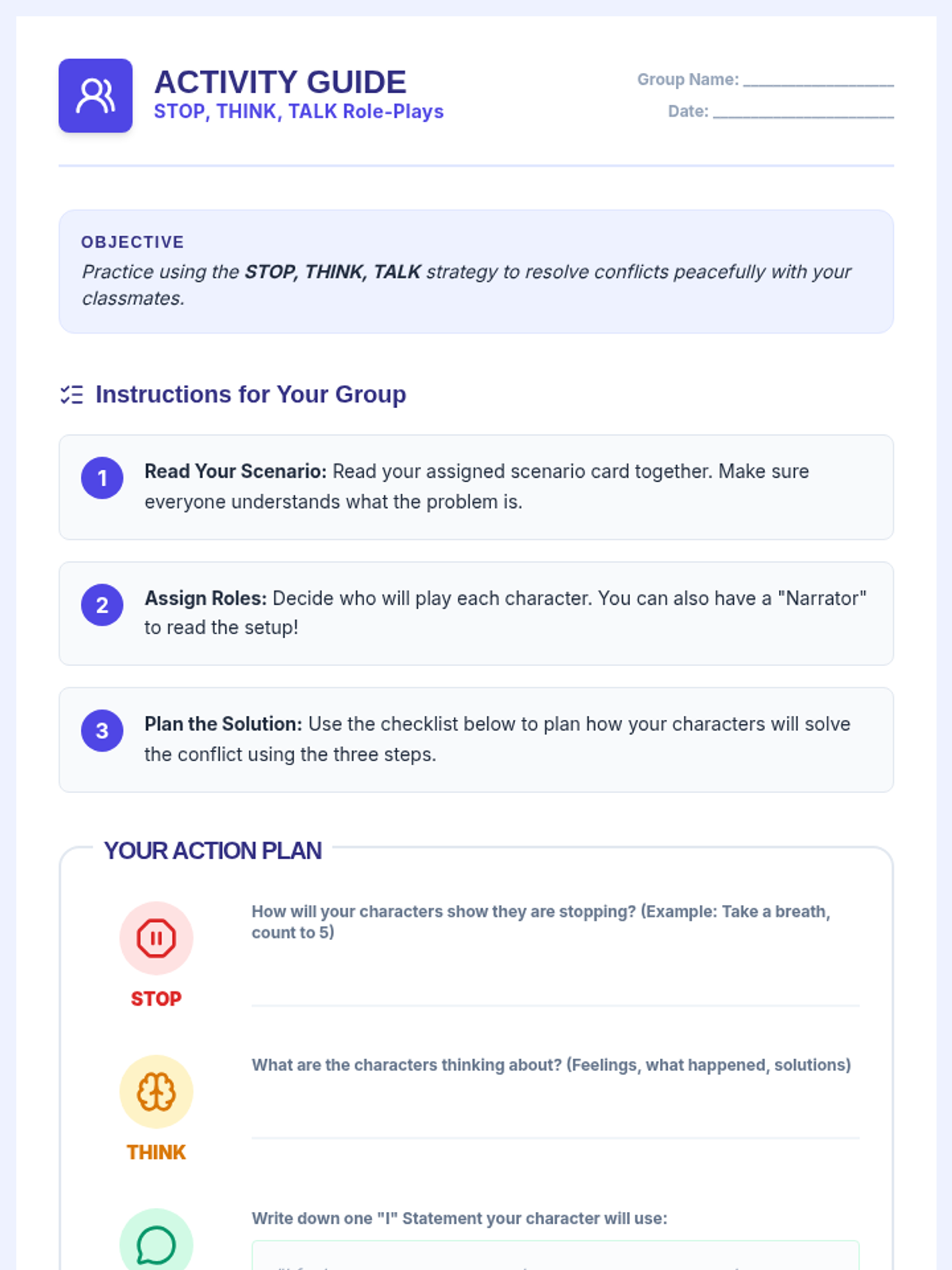 A 20-minute interactive lesson for 3rd graders on resolving conflicts using the STOP, THINK, TALK strategy. Students engage in role-play to practice peaceful communication and finding win-win solutions.