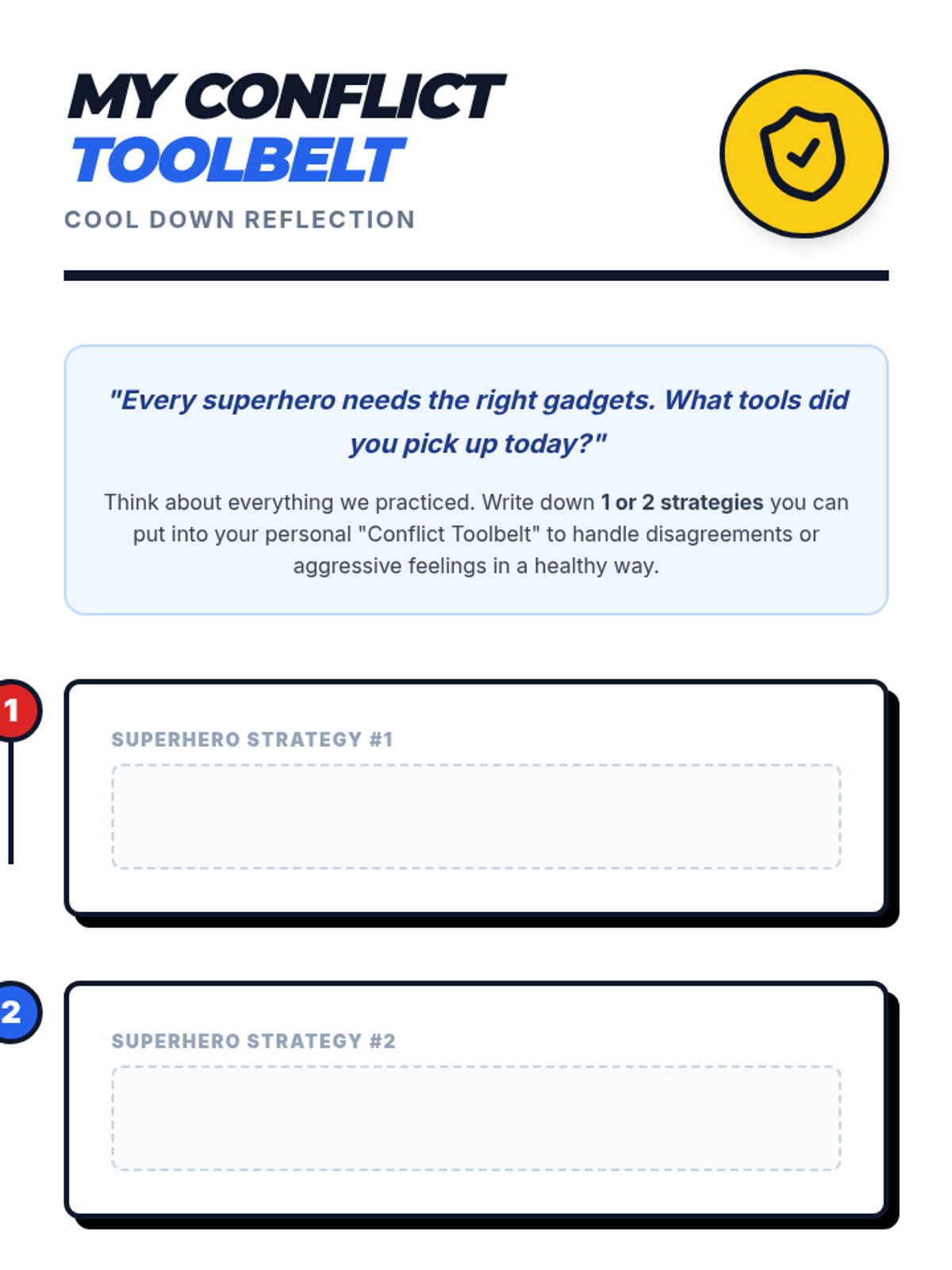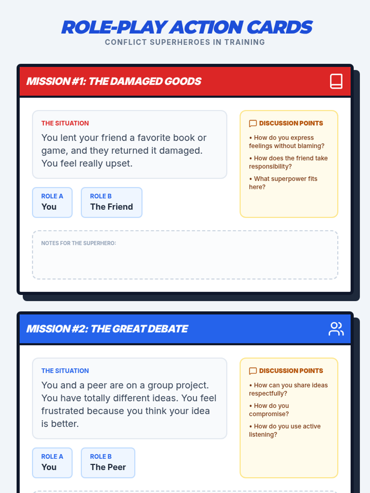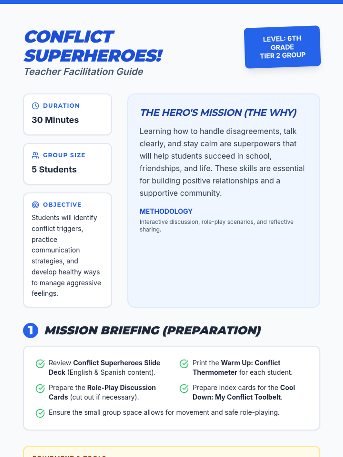 This 30-minute small-group lesson for 6th graders uses a superhero theme to teach conflict resolution, effective communication, and aggression management through interactive role-play and reflection.