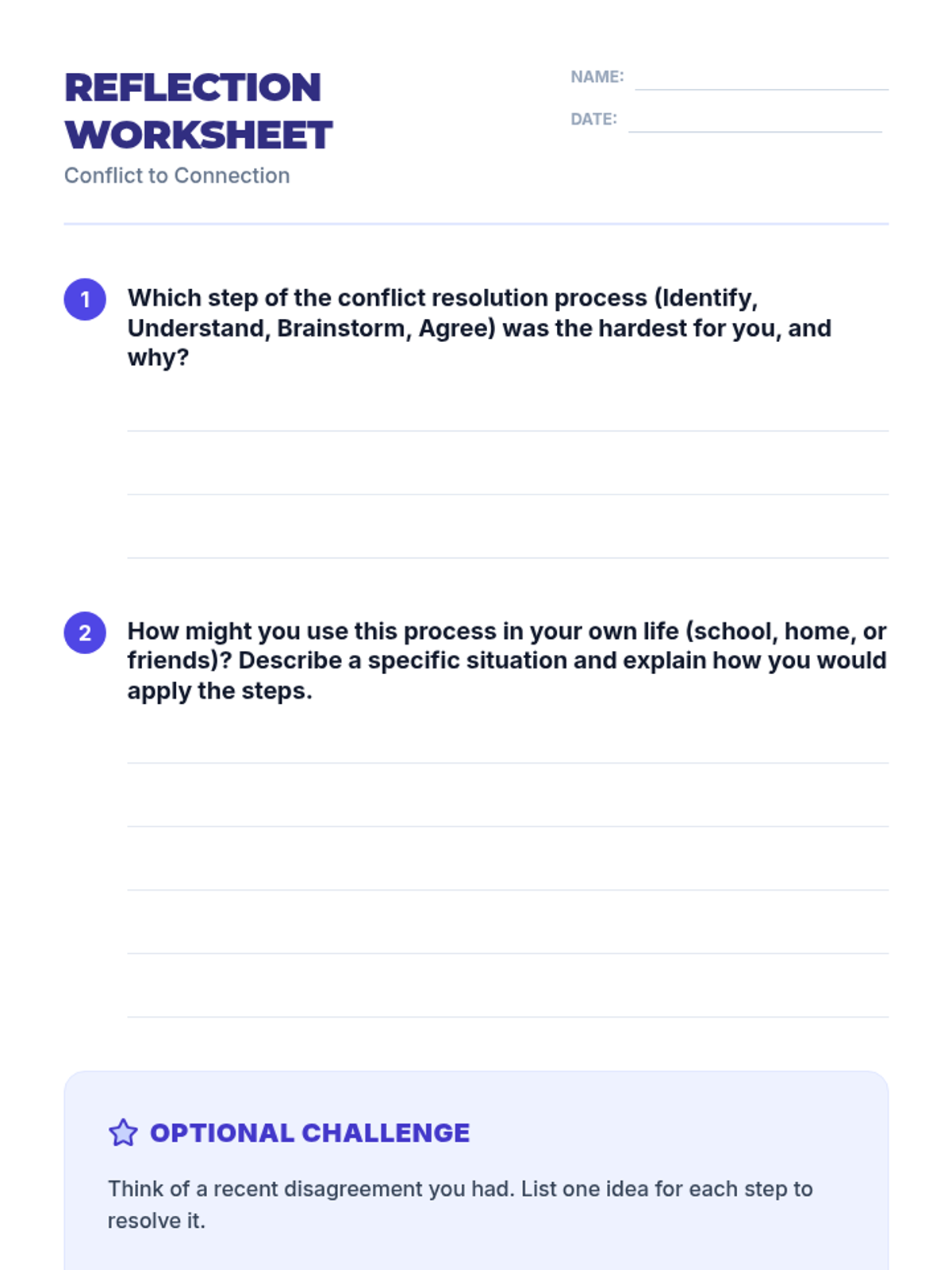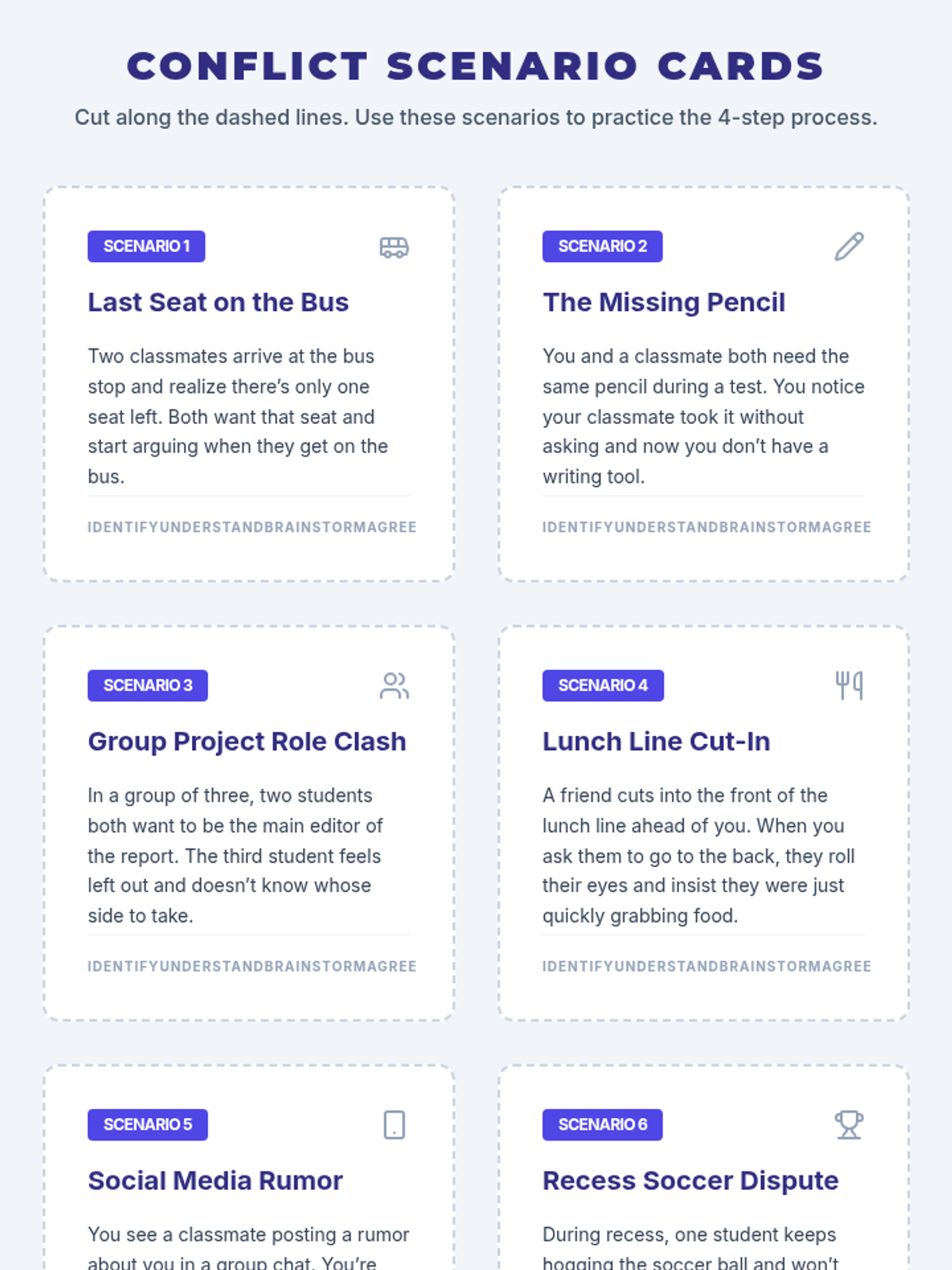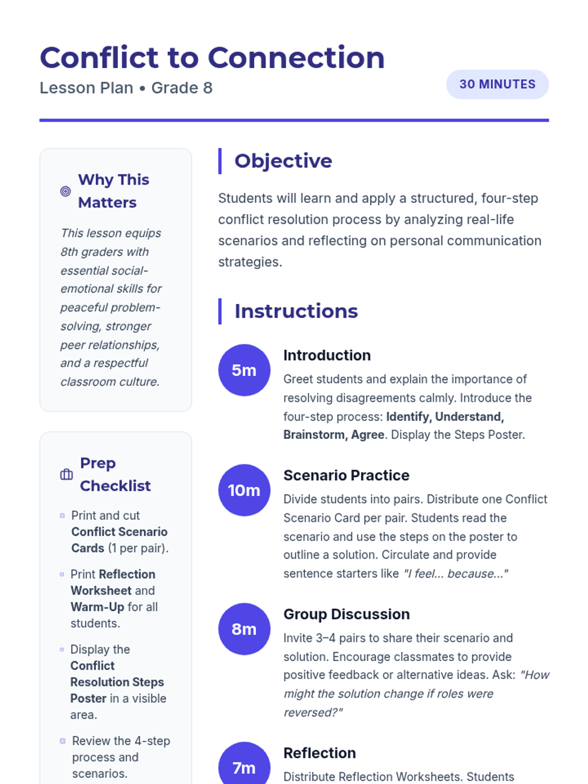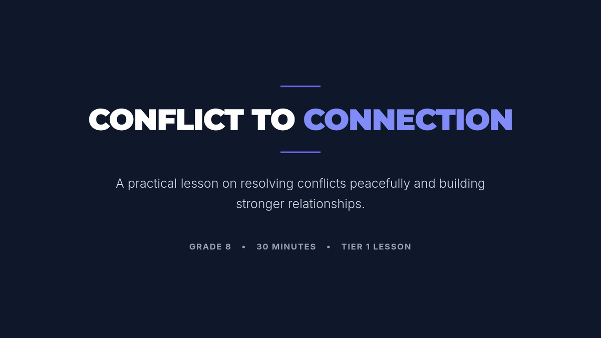 A 30-minute 8th-grade lesson focused on the four-step conflict resolution process: Identify, Understand, Brainstorm, and Agree. Students practice these skills through real-life scenarios to build stronger communication and relationships.