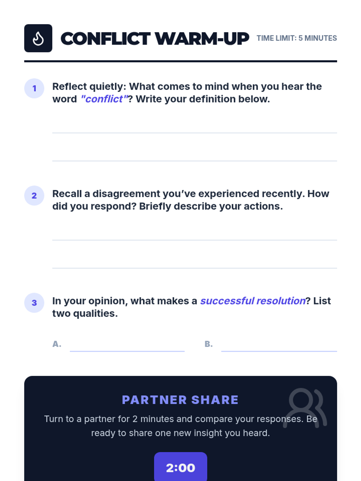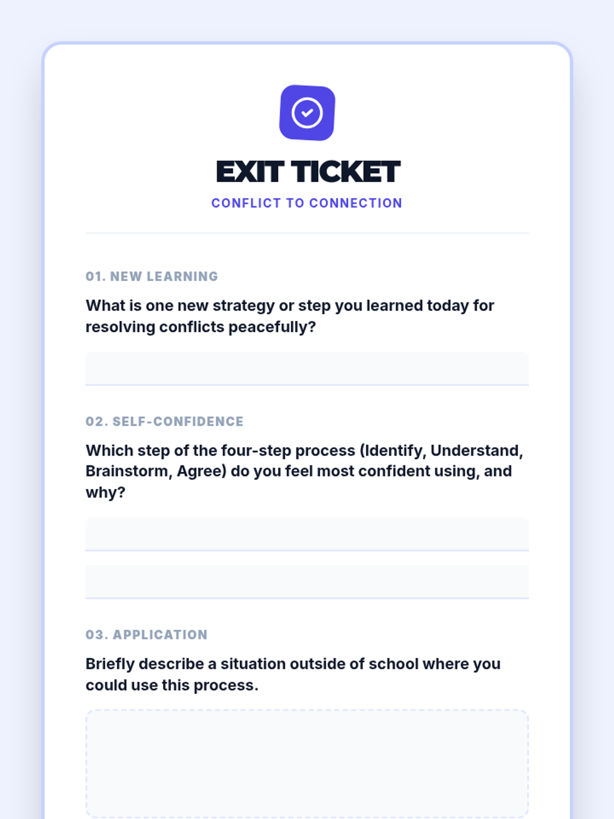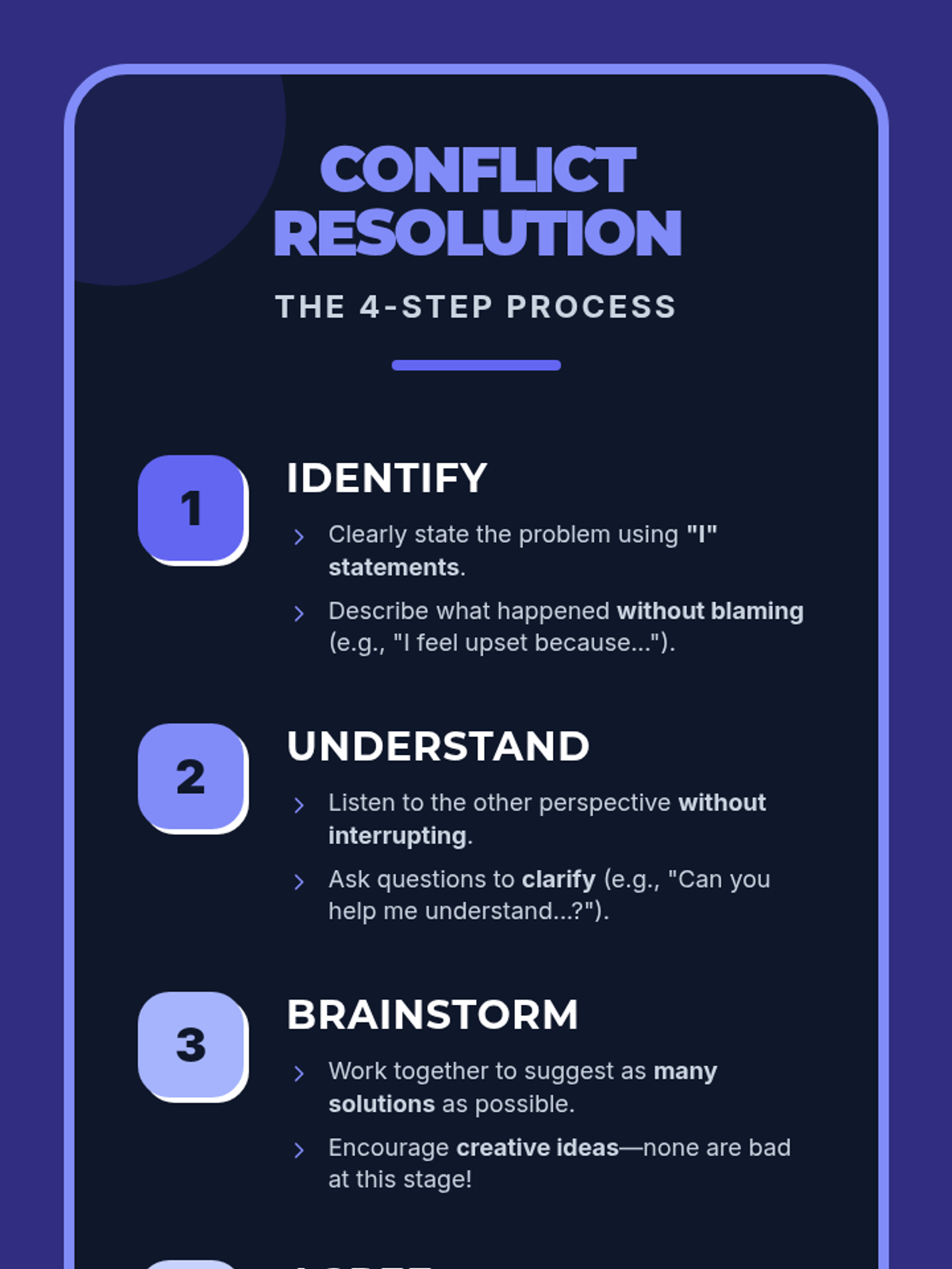 A 30-minute 8th-grade lesson focused on the four-step conflict resolution process: Identify, Understand, Brainstorm, and Agree. Students practice these skills through real-life scenarios to build stronger communication and relationships.