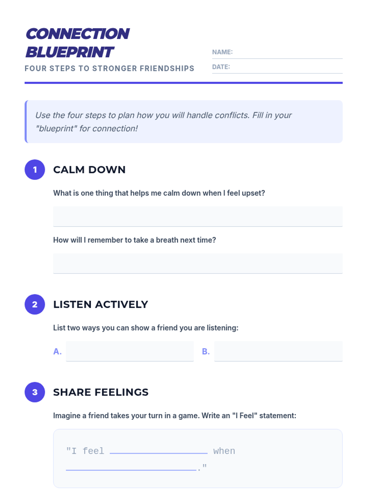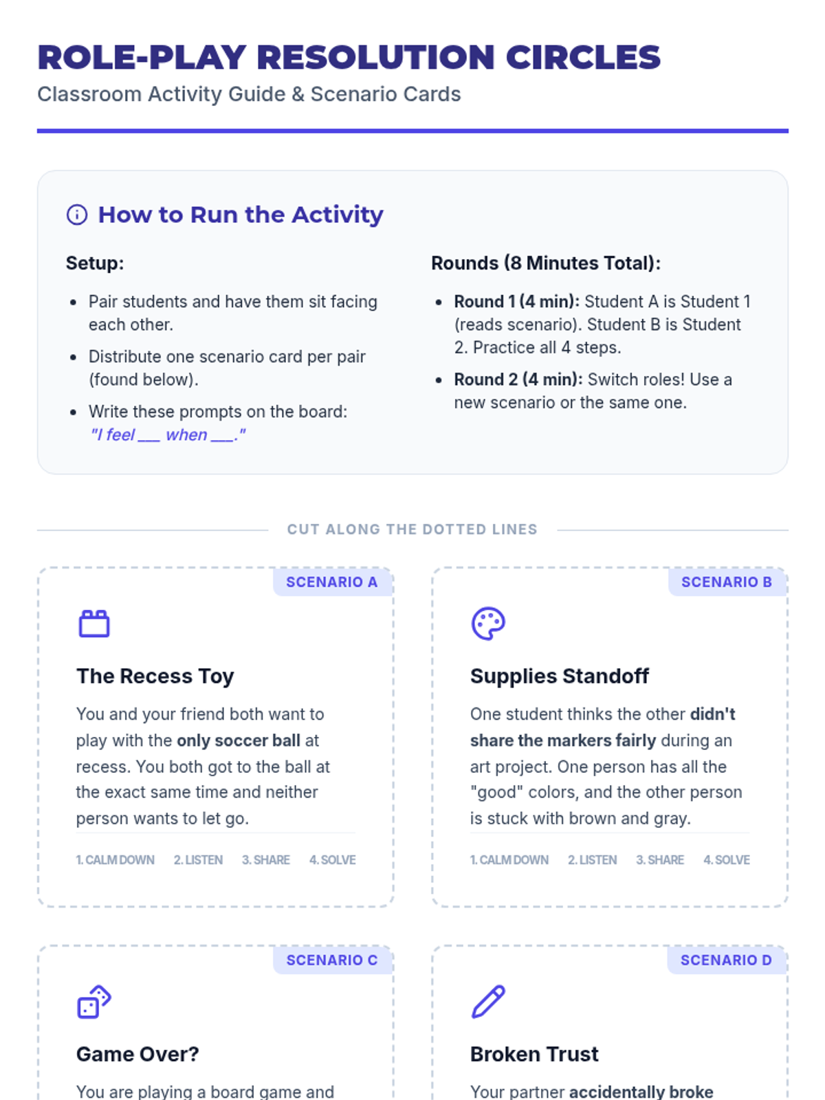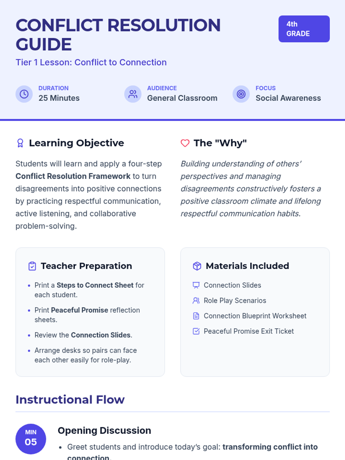 A 25-minute Tier 1 social-emotional learning lesson for 4th graders focused on a four-step framework for resolving conflicts and strengthening friendships through respectful communication and active listening.