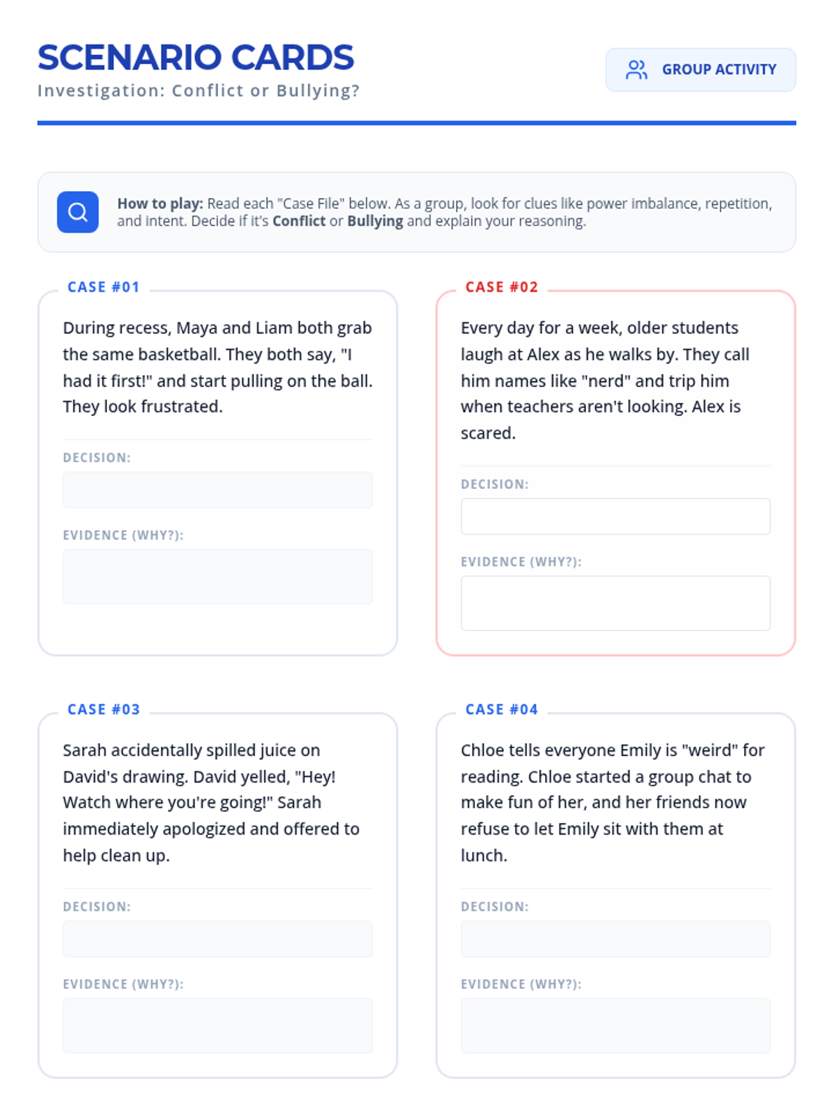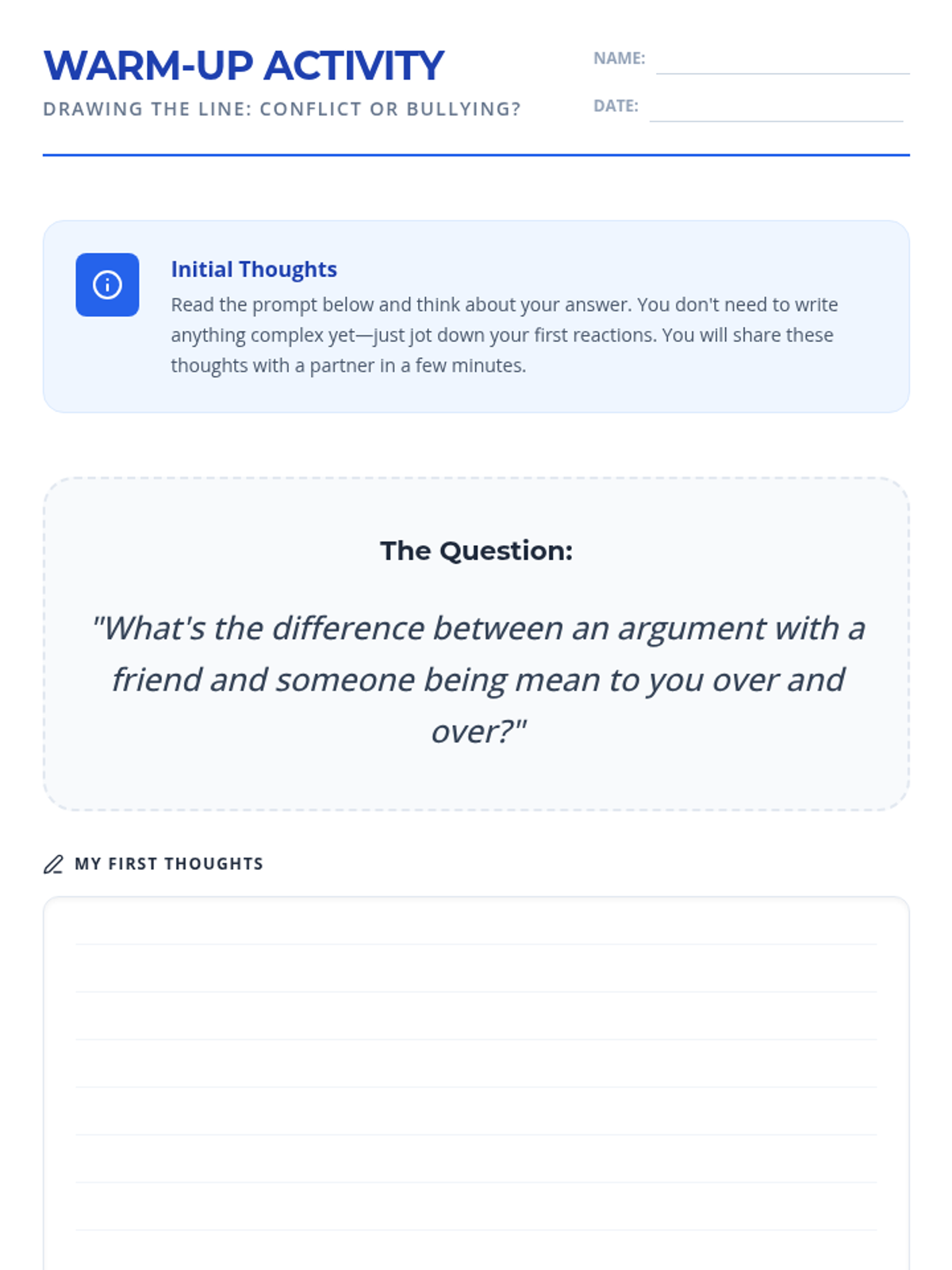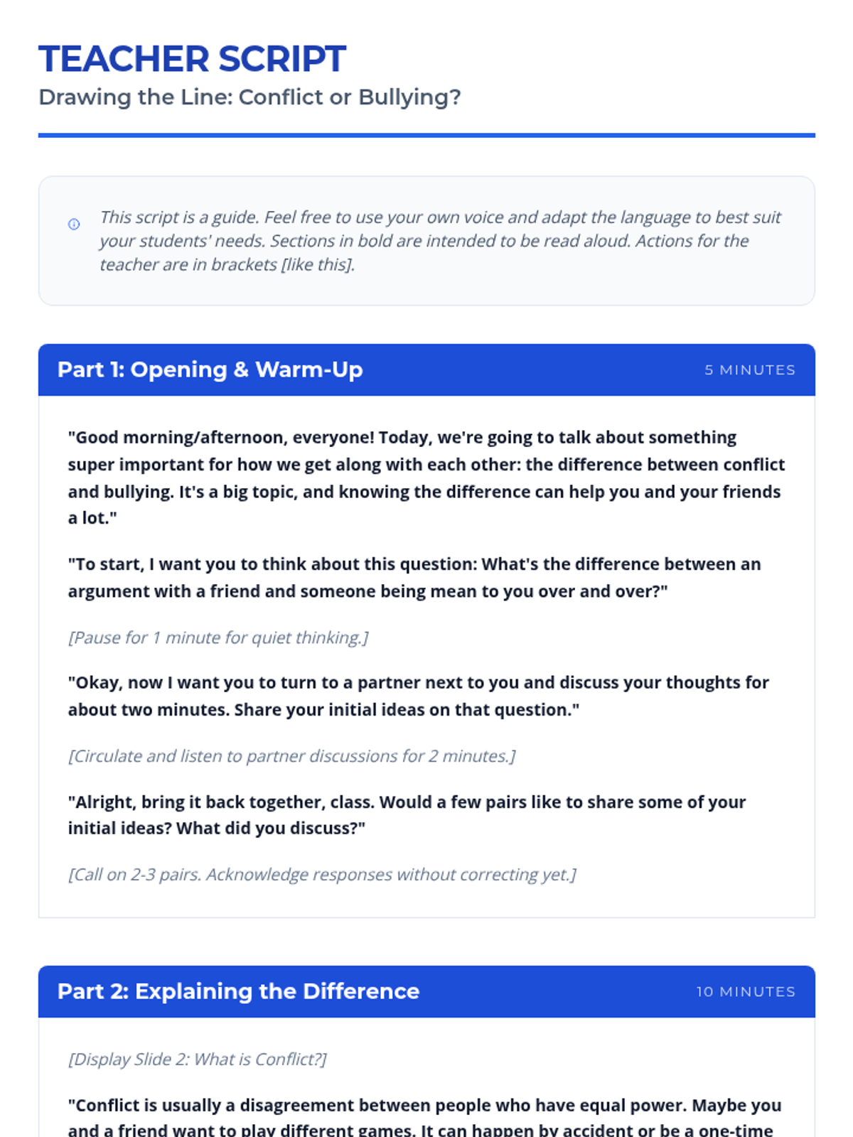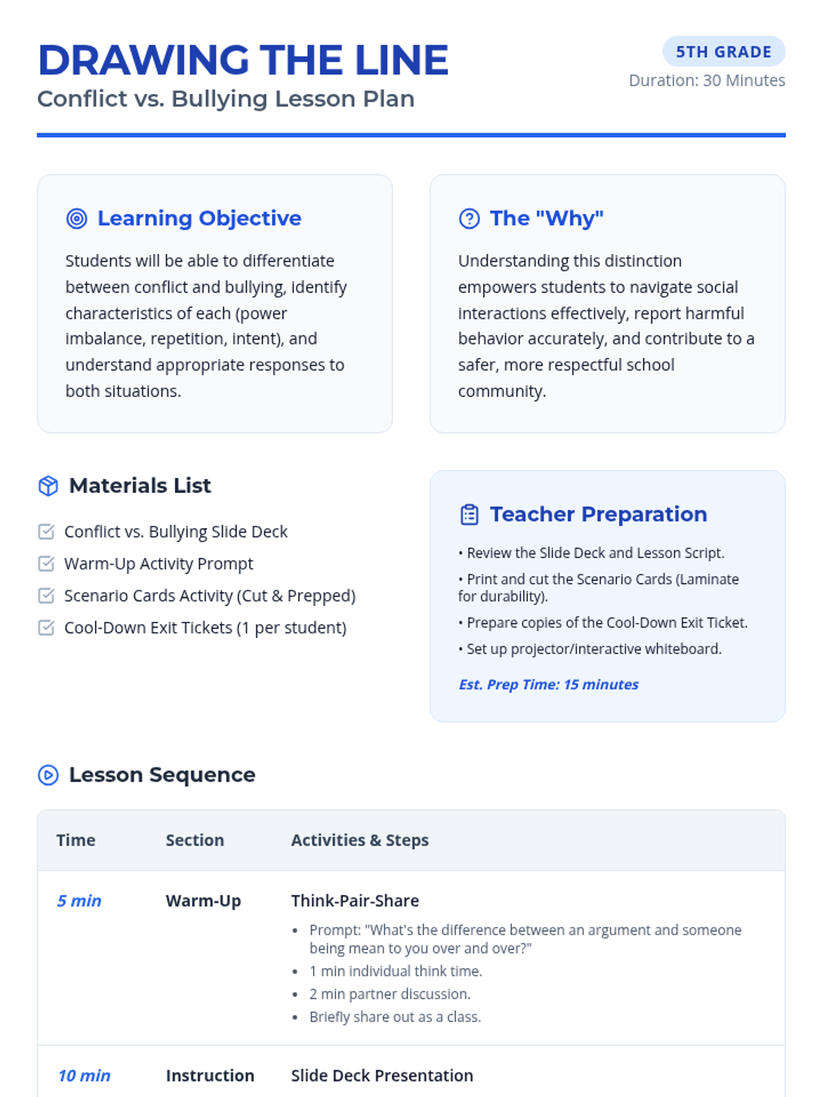 This 30-minute lesson helps 5th-grade students understand the crucial differences between conflict and bullying through interactive discussion, visual comparison, and scenario analysis. Students will learn to identify characteristics like power imbalance, repetition, and intent to foster a safer school environment.