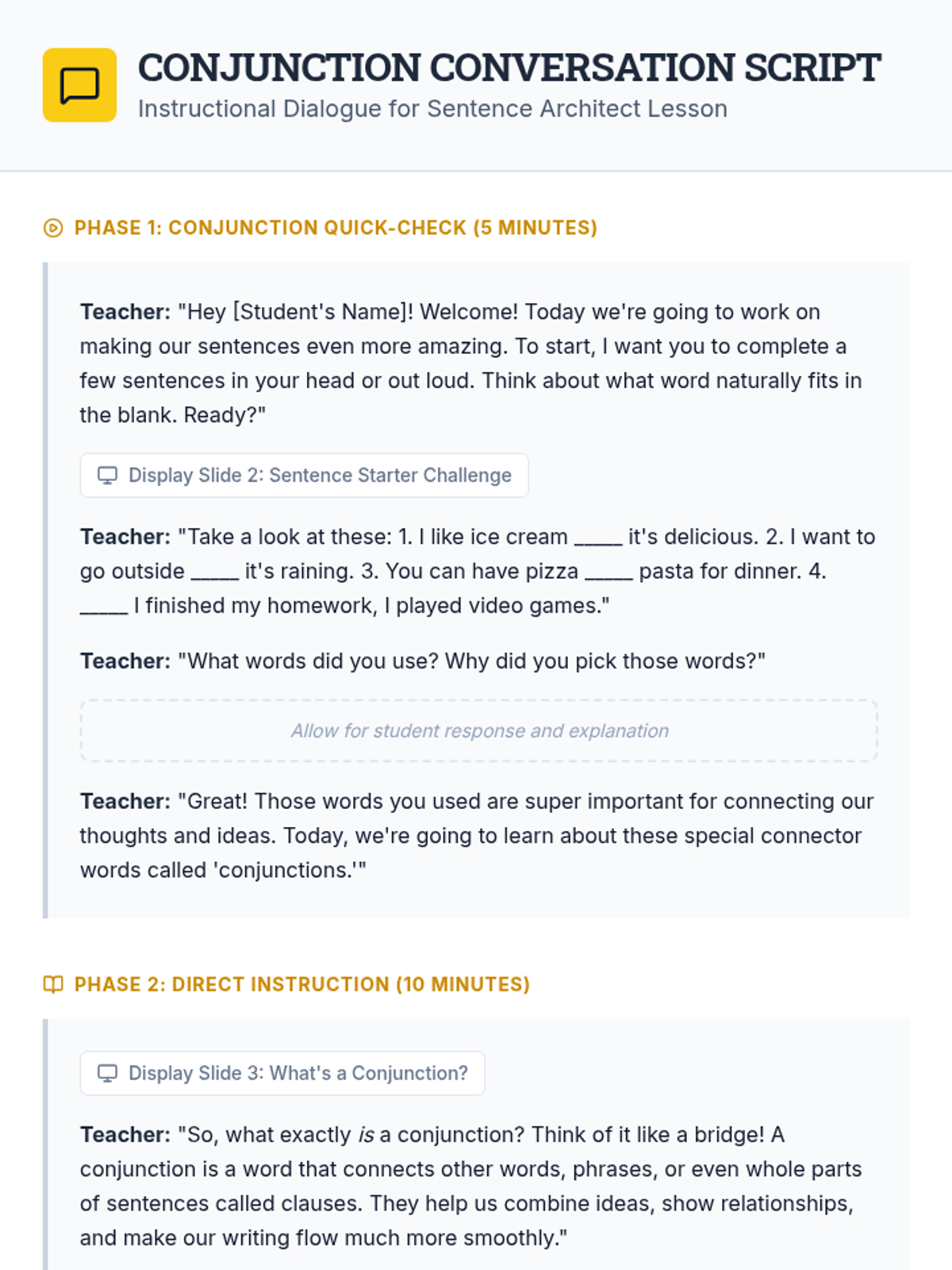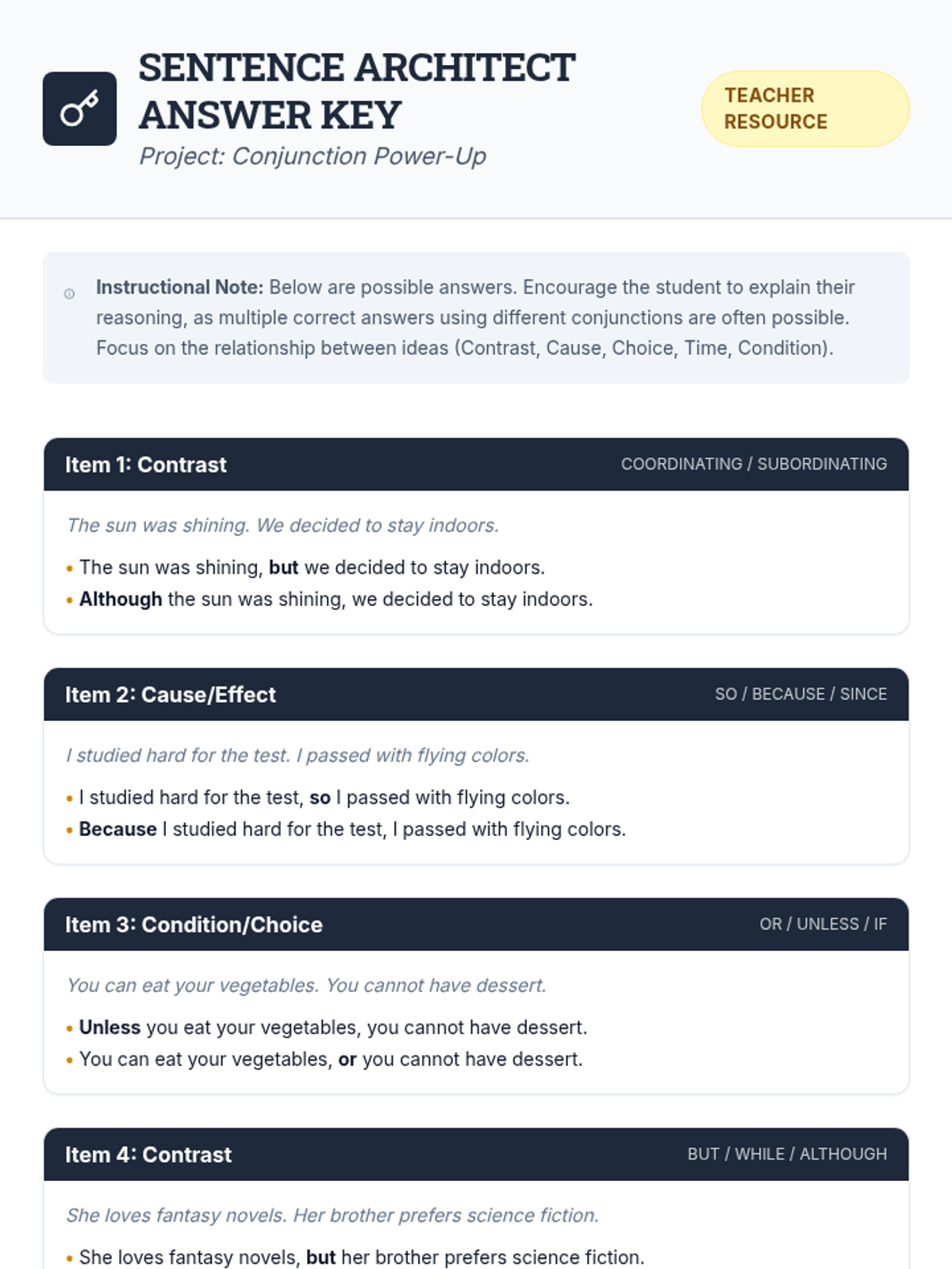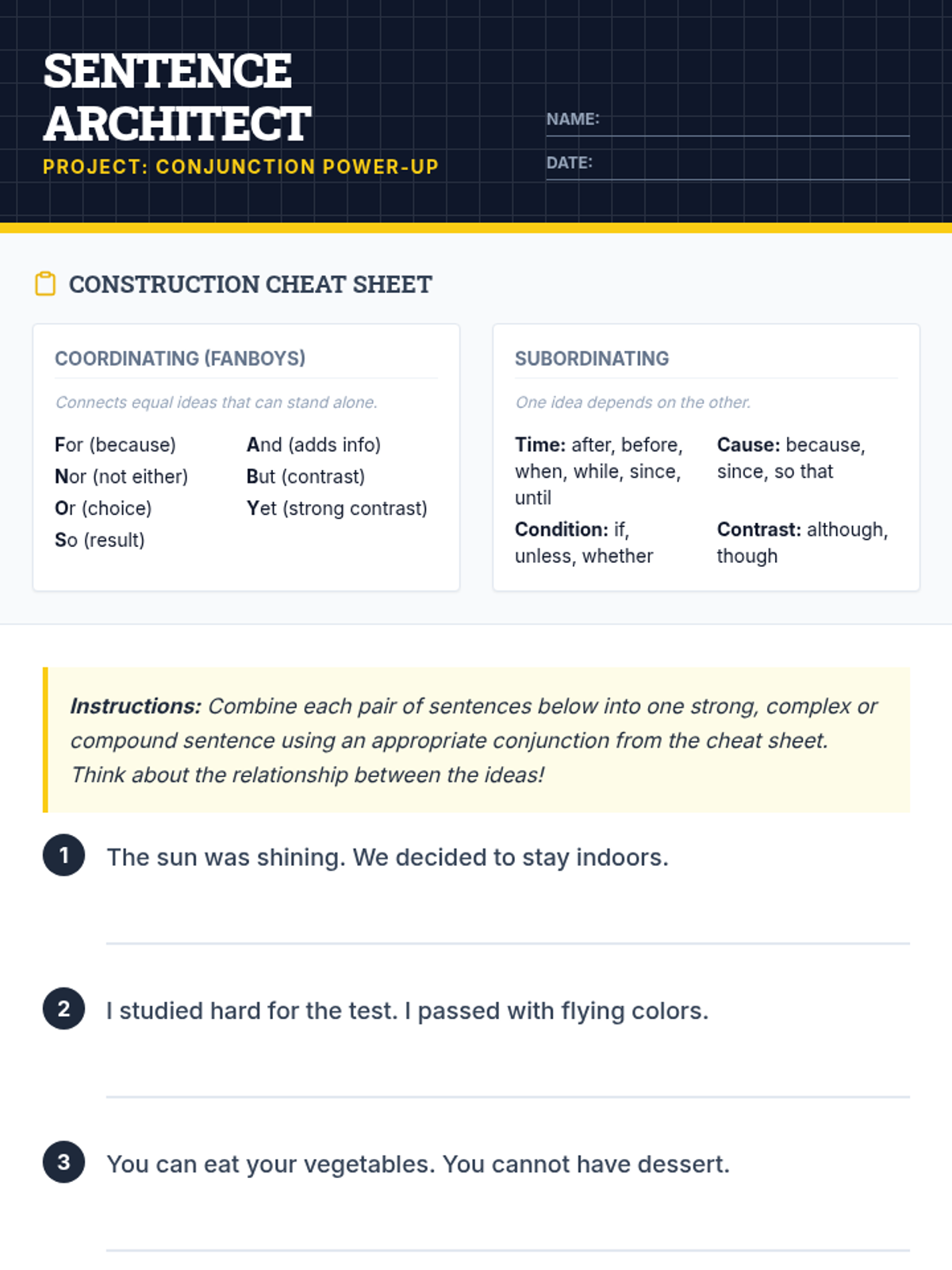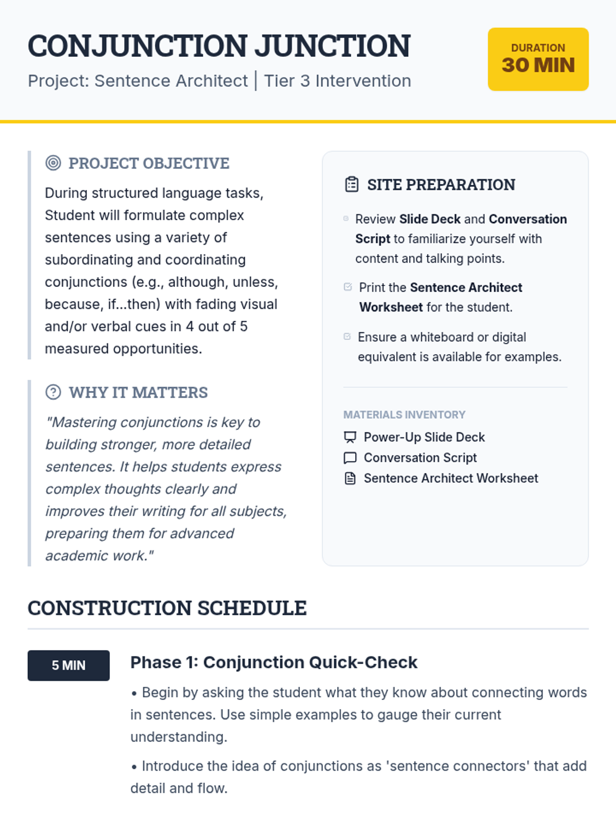 A targeted Tier 3 lesson for a 9th-grade student to master the use of coordinating and subordinating conjunctions to build complex, sophisticated sentences. This 30-minute session uses a construction-themed 'Sentence Architect' approach to guide the student from basic identification to independent application.
