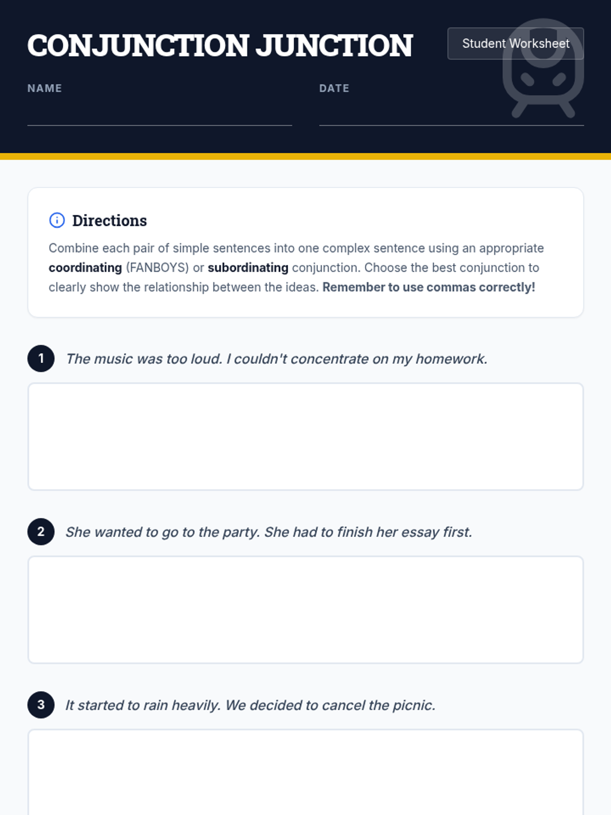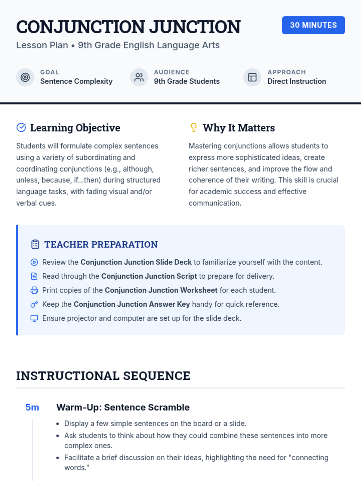 A 30-minute lesson for 9th graders to master coordinating and subordinating conjunctions using a railway-themed approach to sentence construction.