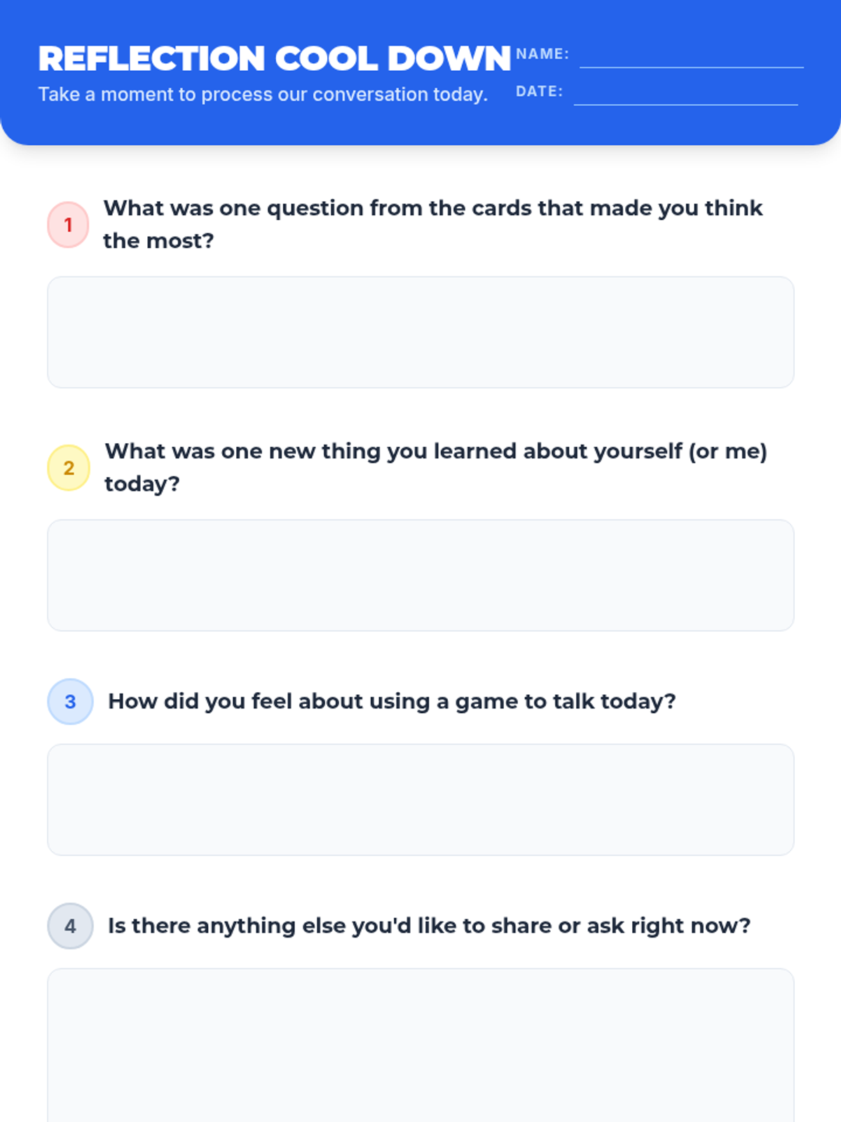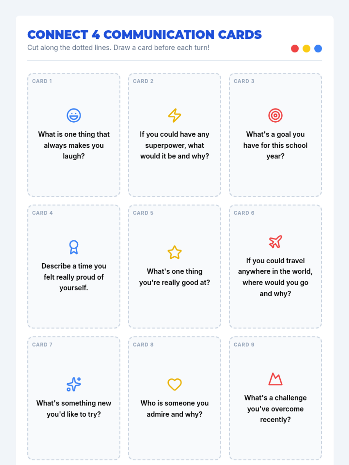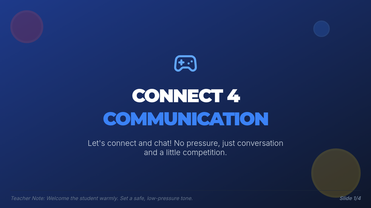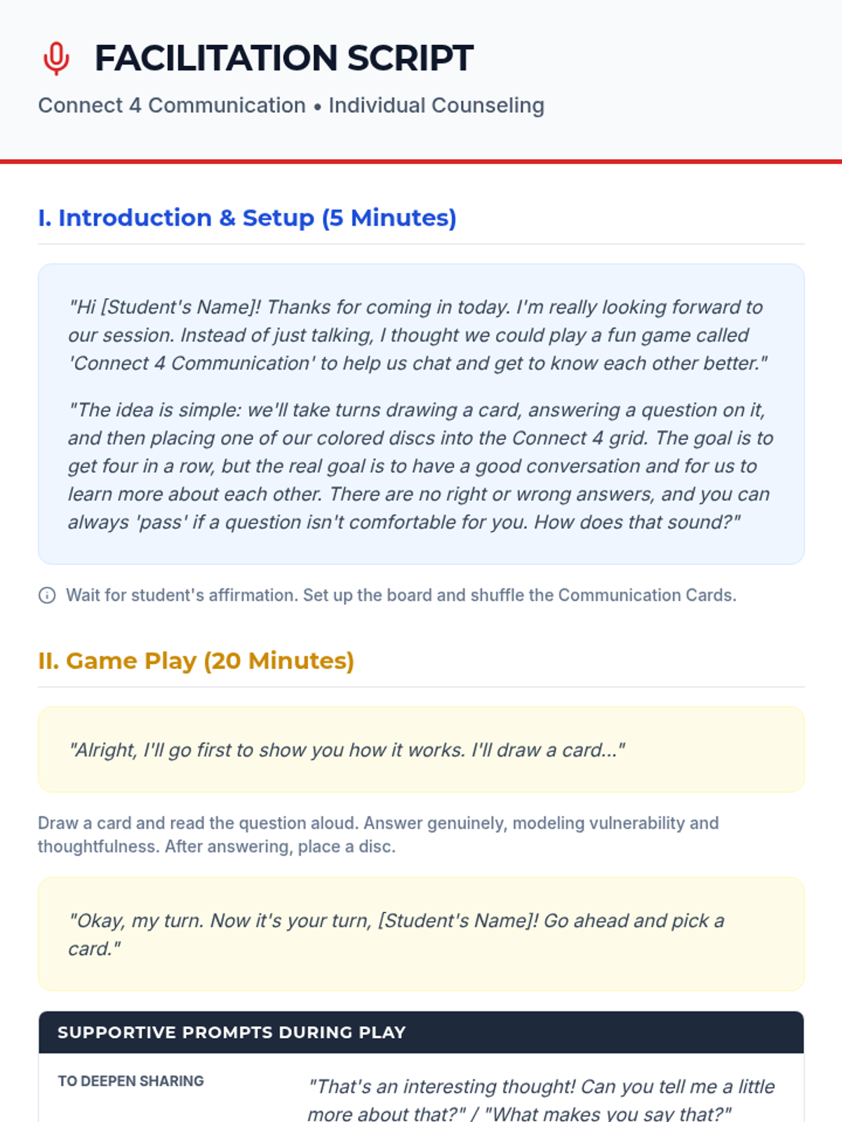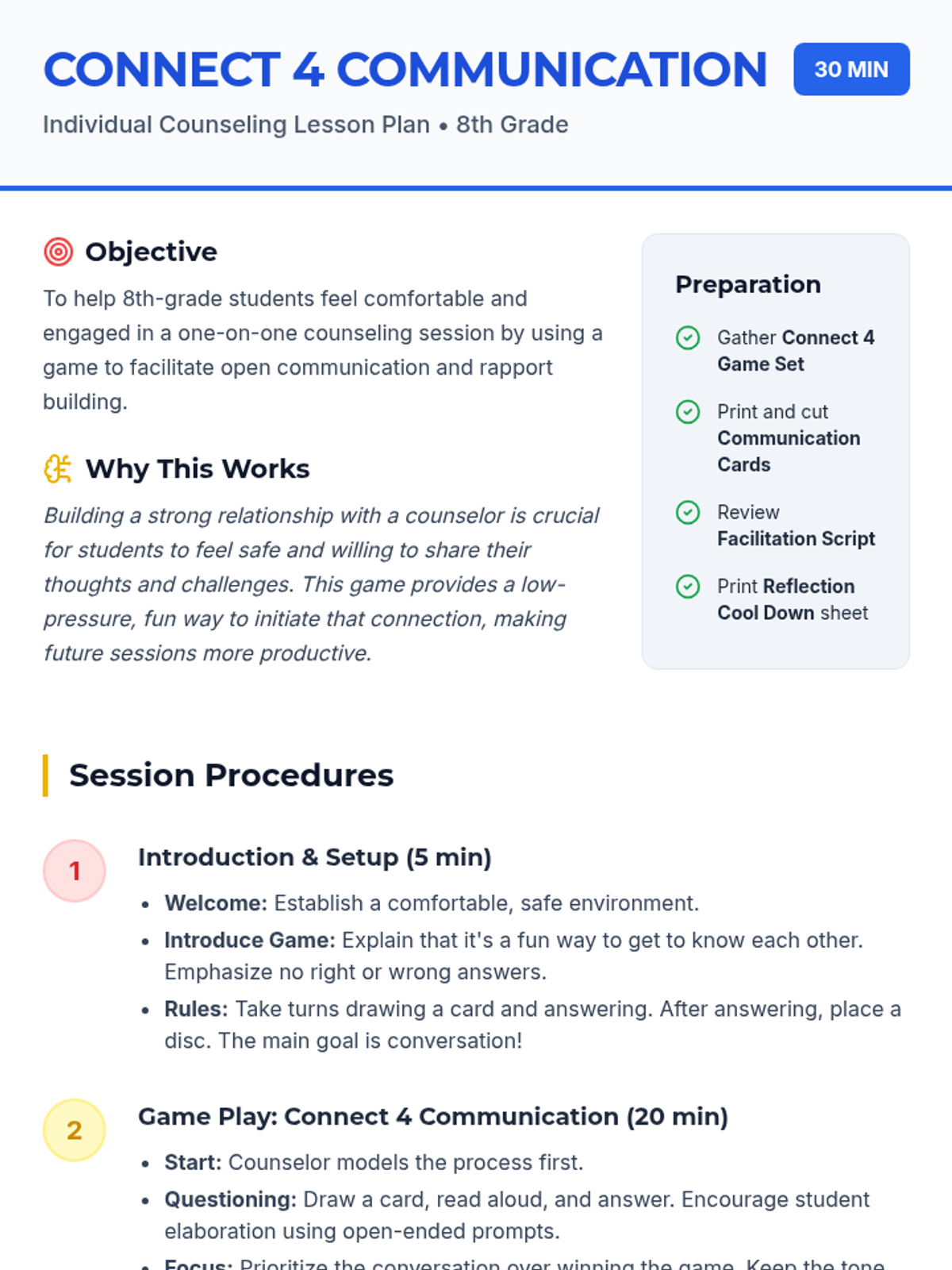 A 30-minute individual counseling session for 8th graders using a Connect 4 game to build rapport and facilitate open communication. Students engage in structured conversation while playing the game, followed by a reflective cool-down.