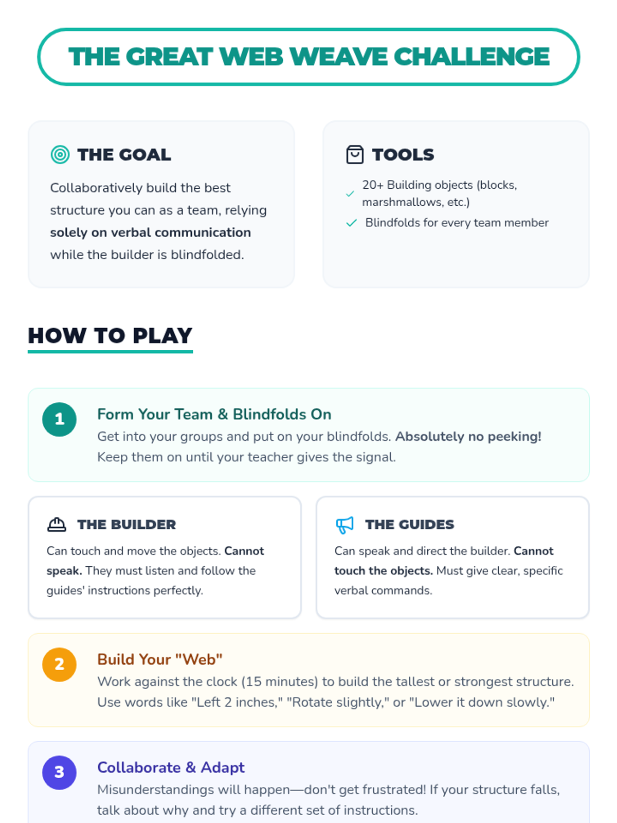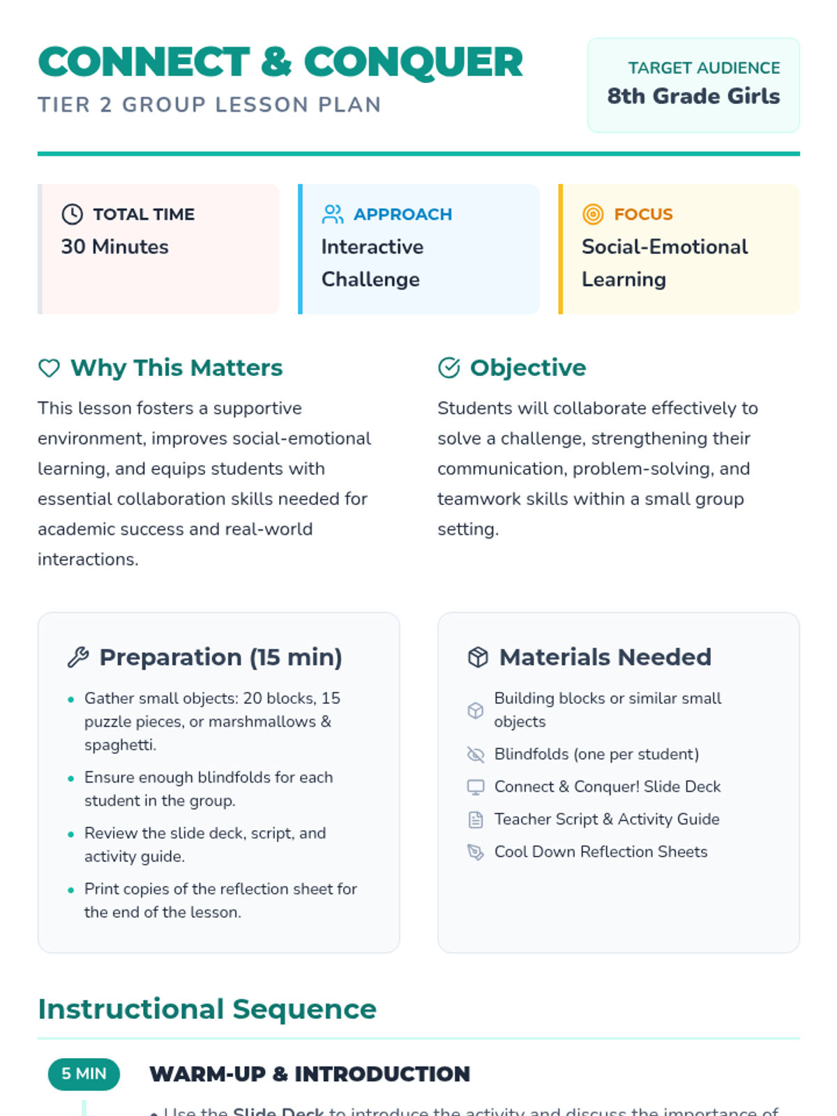 A 30-minute team-building lesson for 8th-grade girls that uses a blindfolded building challenge to strengthen communication, trust, and collaboration skills.