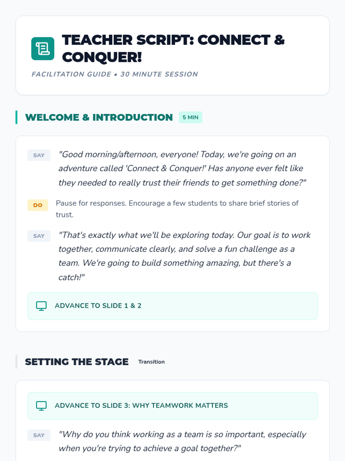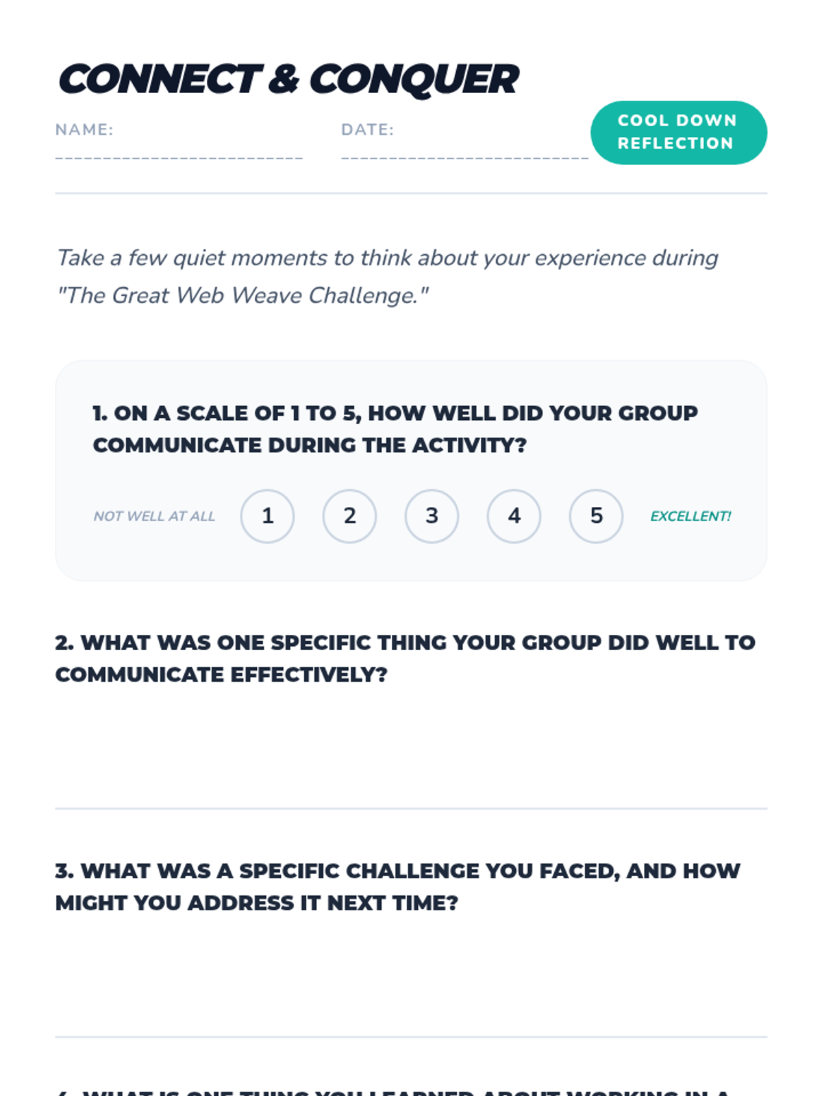 Practical team-based synergy challenges to apply collaborative problem-solving skills.