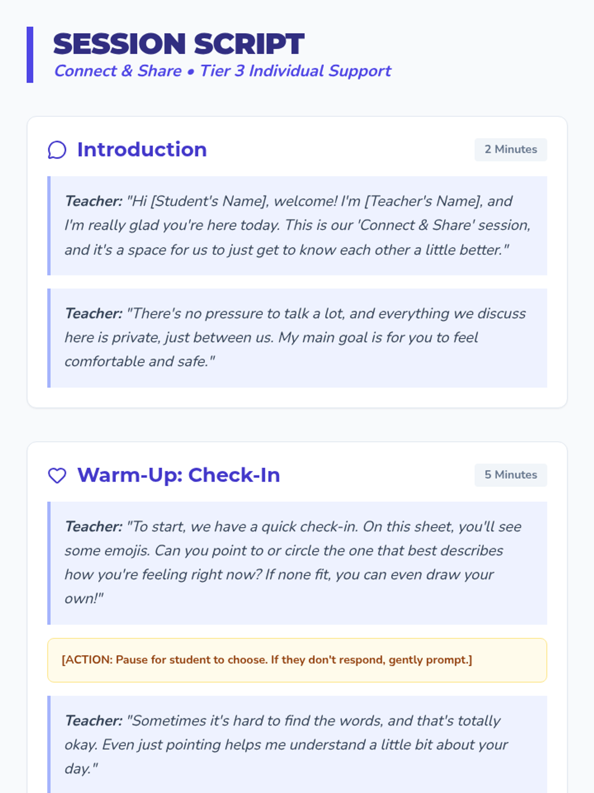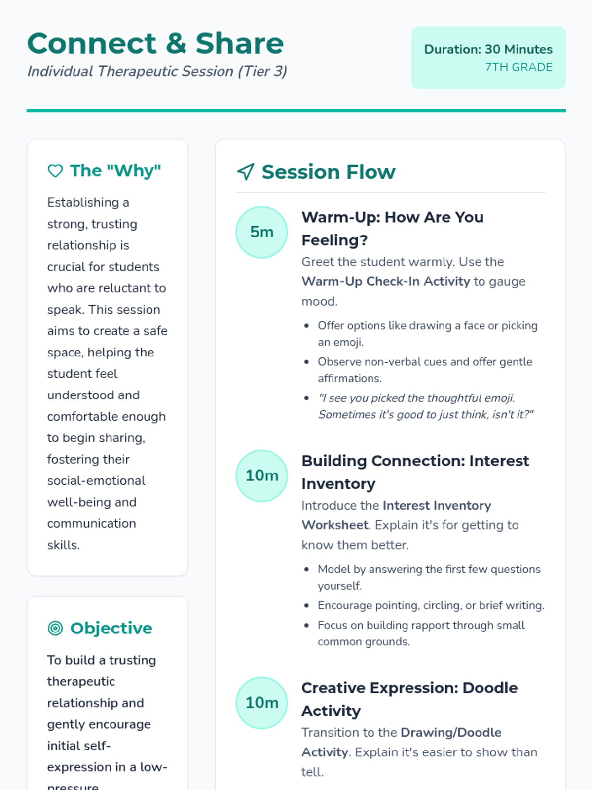 A 30-minute therapeutic session for 7th graders focused on building rapport through low-pressure creative activities and check-ins.
