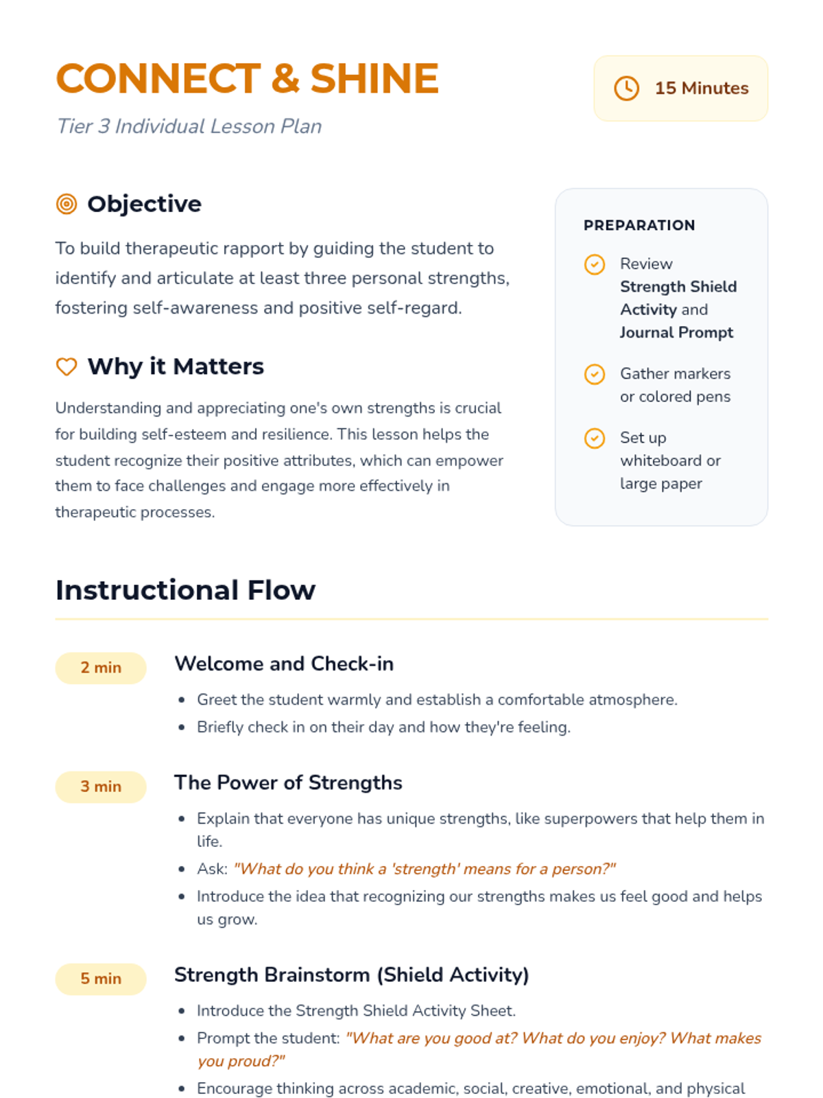 A 15-minute Tier 3 individual lesson for 7th-grade students focused on building therapeutic rapport and self-esteem by identifying and celebrating personal strengths.