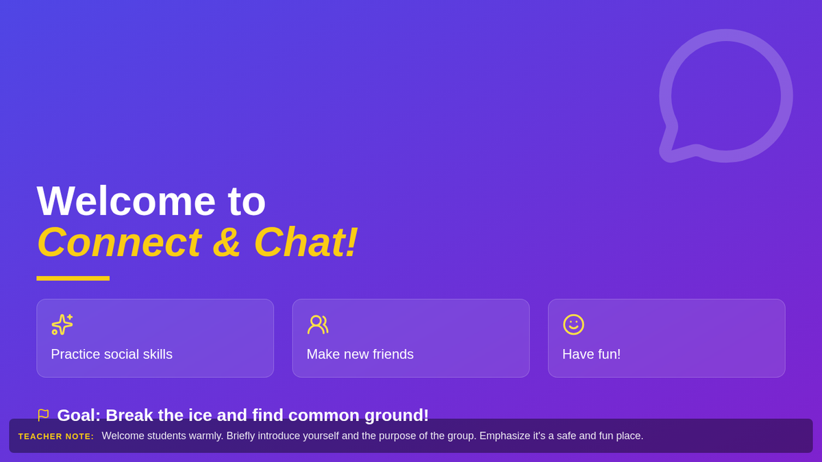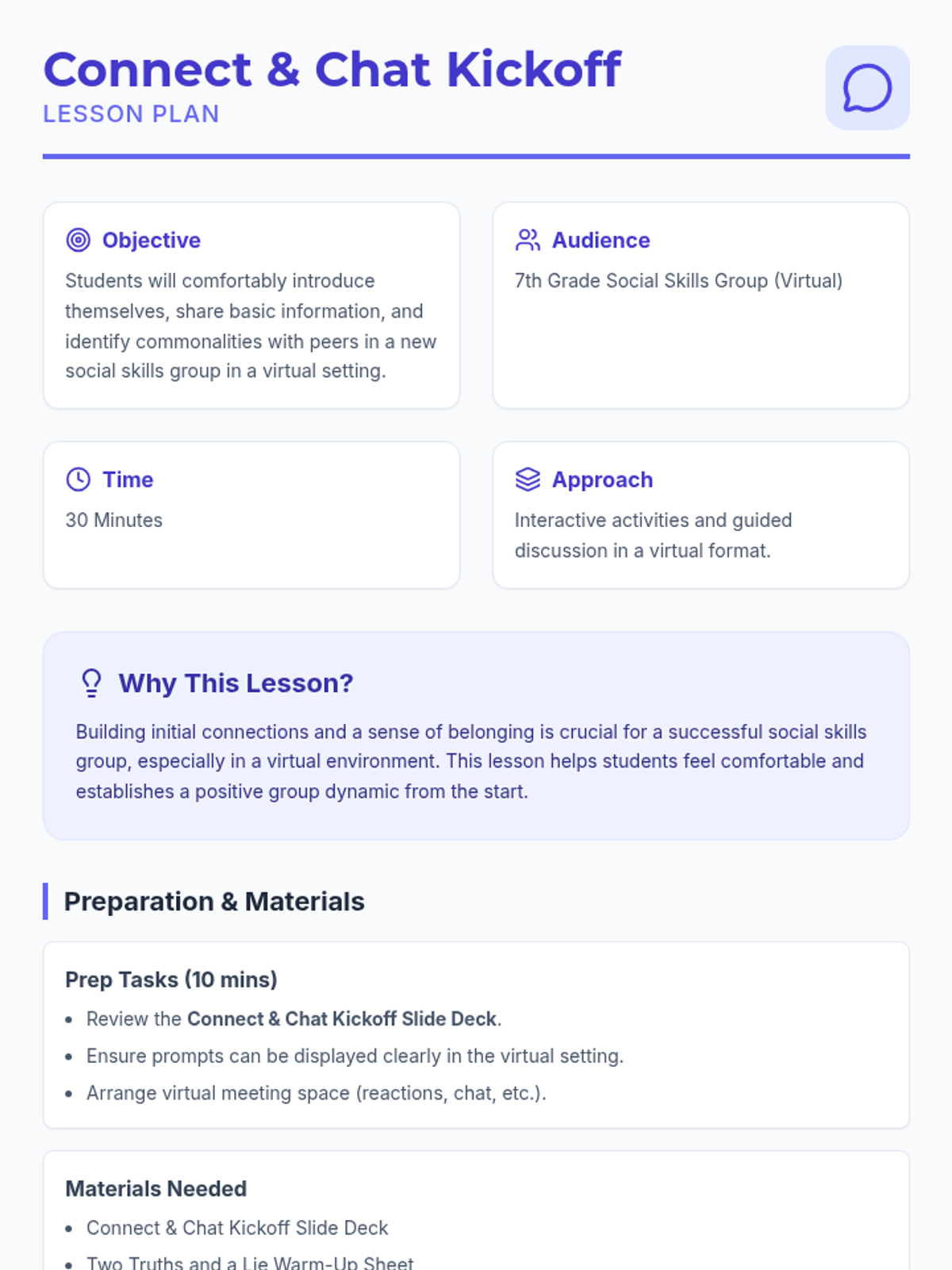 This lesson helps 7th-grade students in a social skills group get to know each other through fun and engaging activities. It fosters a comfortable environment and encourages initial connections. Designed for a 30-minute group session.