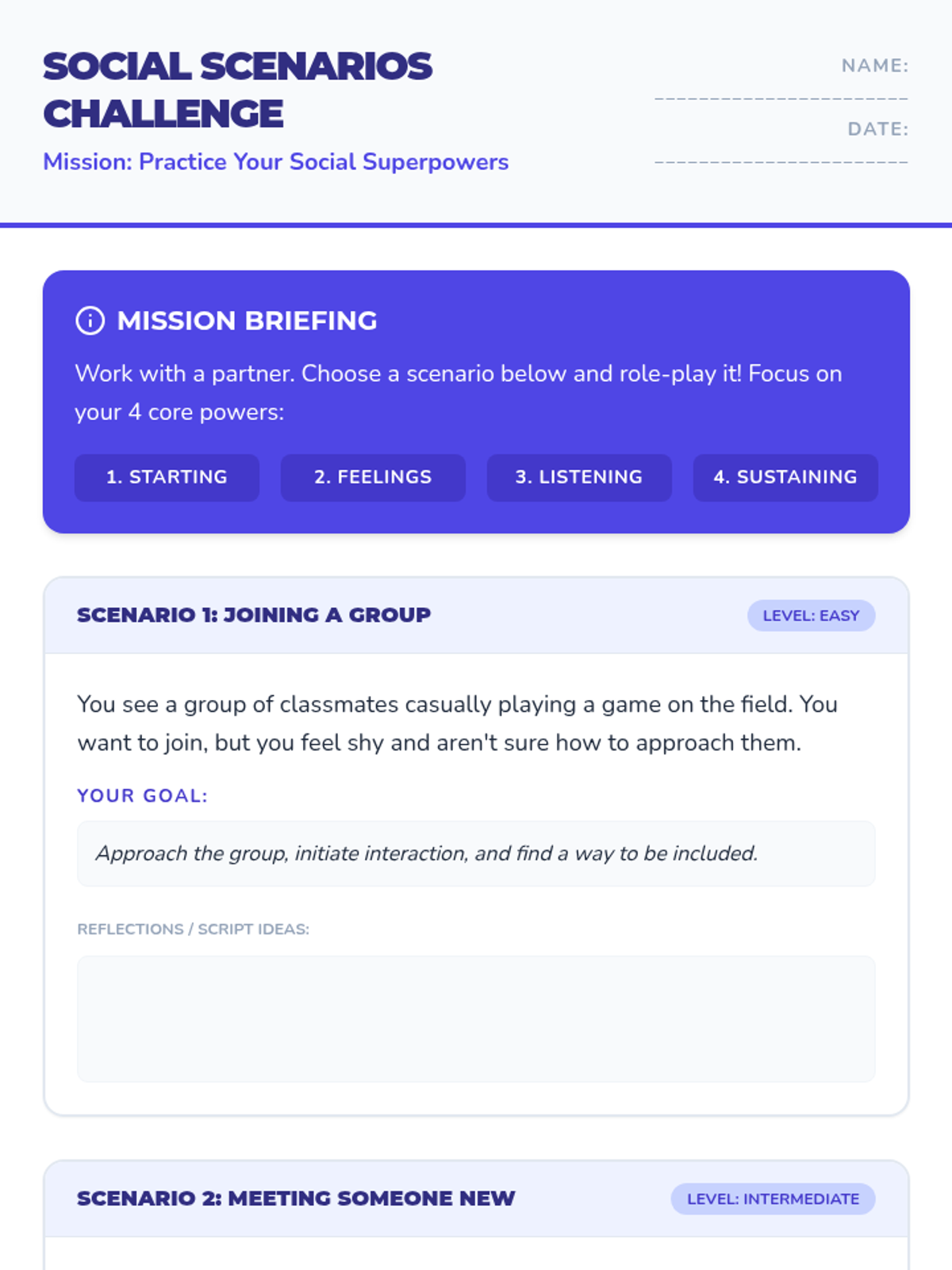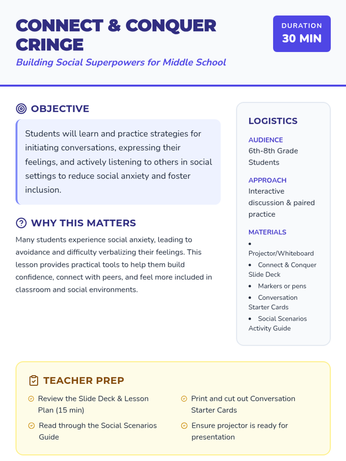 This interactive 30-minute lesson empowers middle schoolers to navigate social anxiety and build genuine connections using 'social superpowers' like conversation starters and active listening. Students practice real-world scenarios to transform 'cringe' moments into opportunities for inclusion.