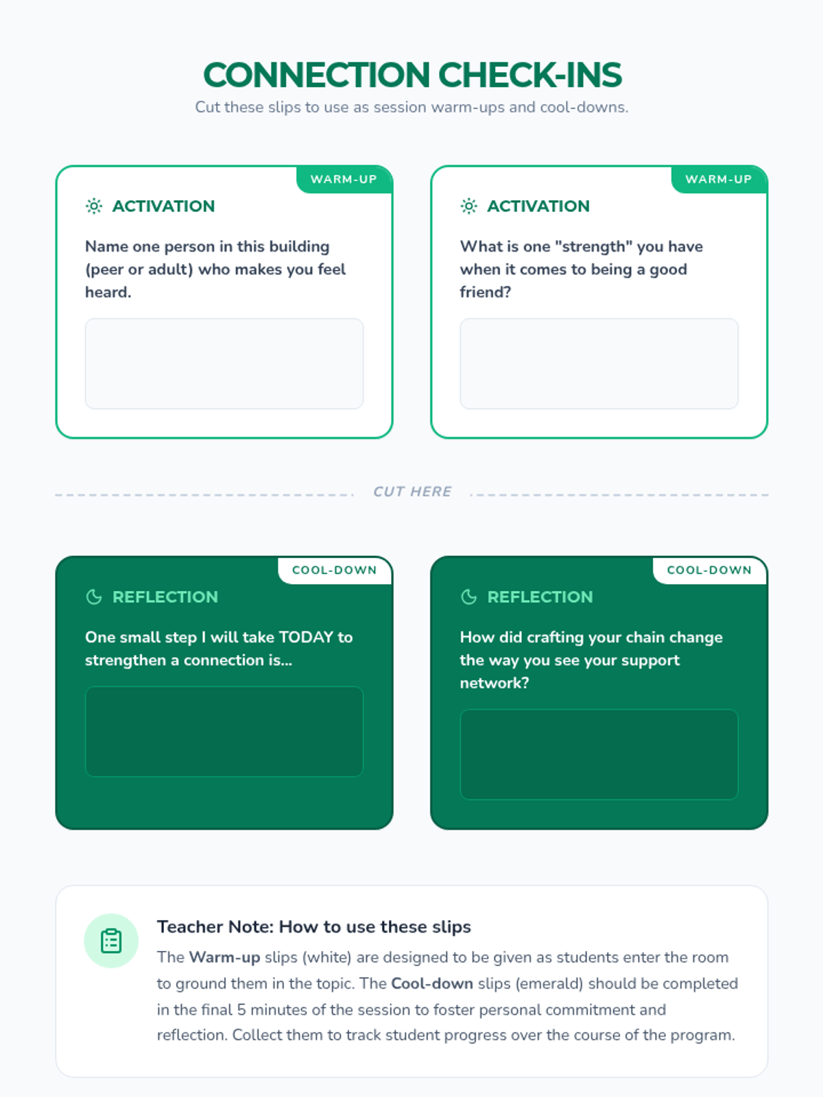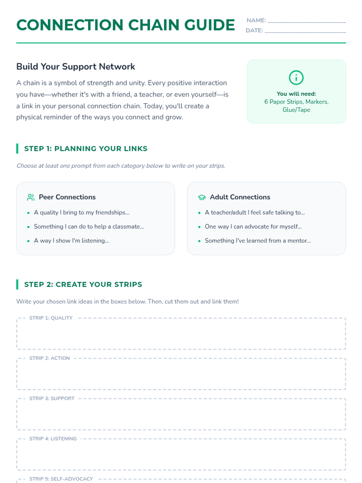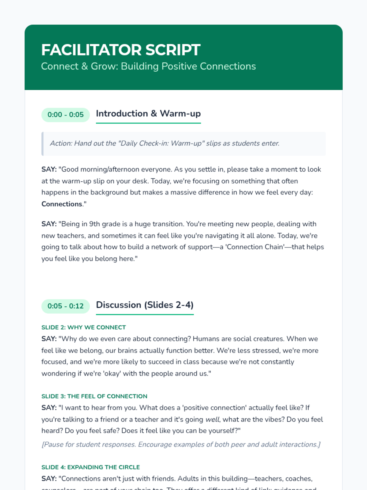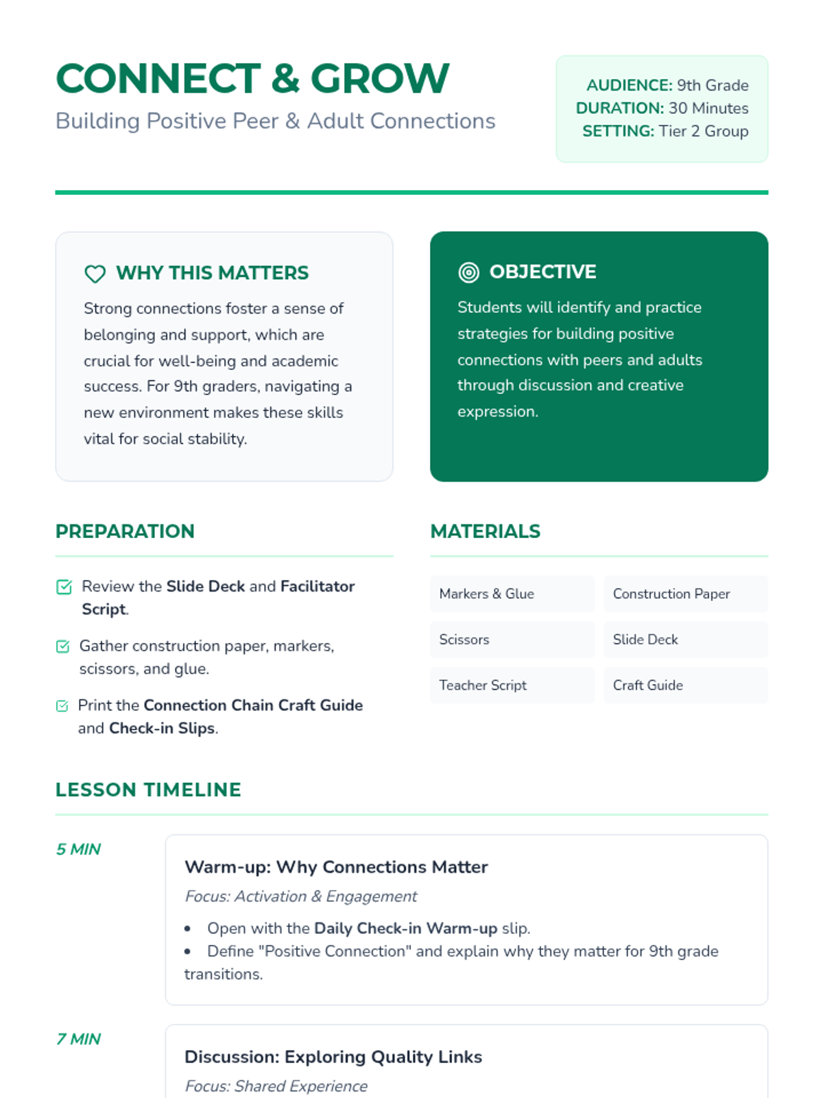 A 30-minute therapeutic group lesson for 9th graders focused on identifying and practicing strategies for building positive connections with peers and adults to foster belonging and well-being.