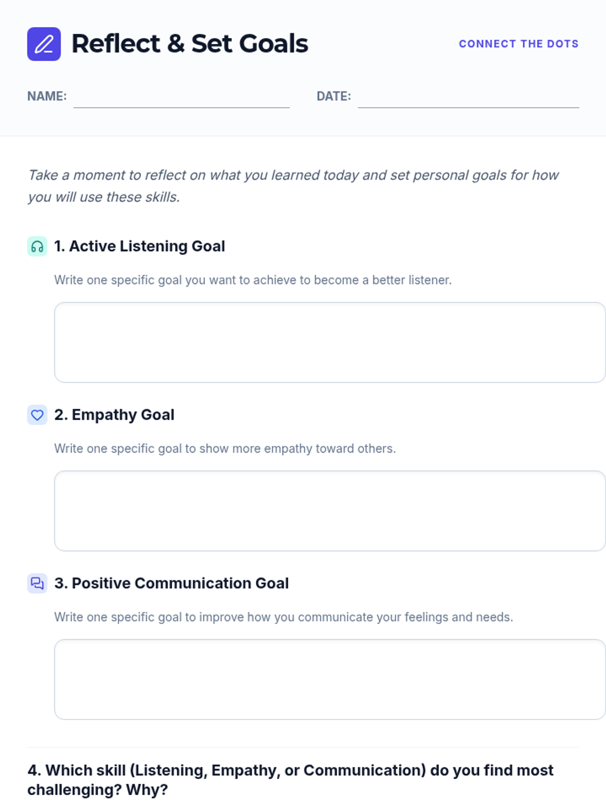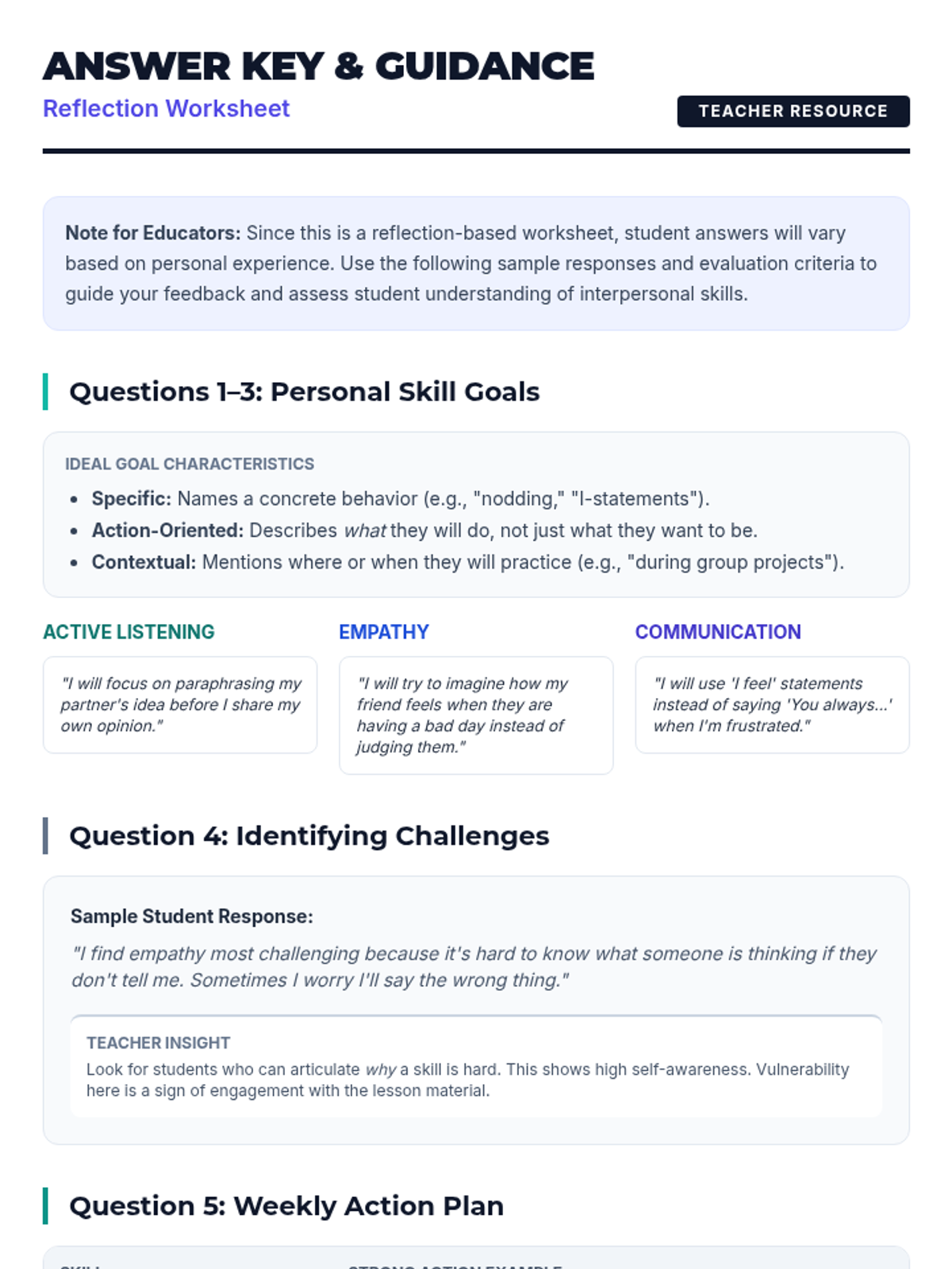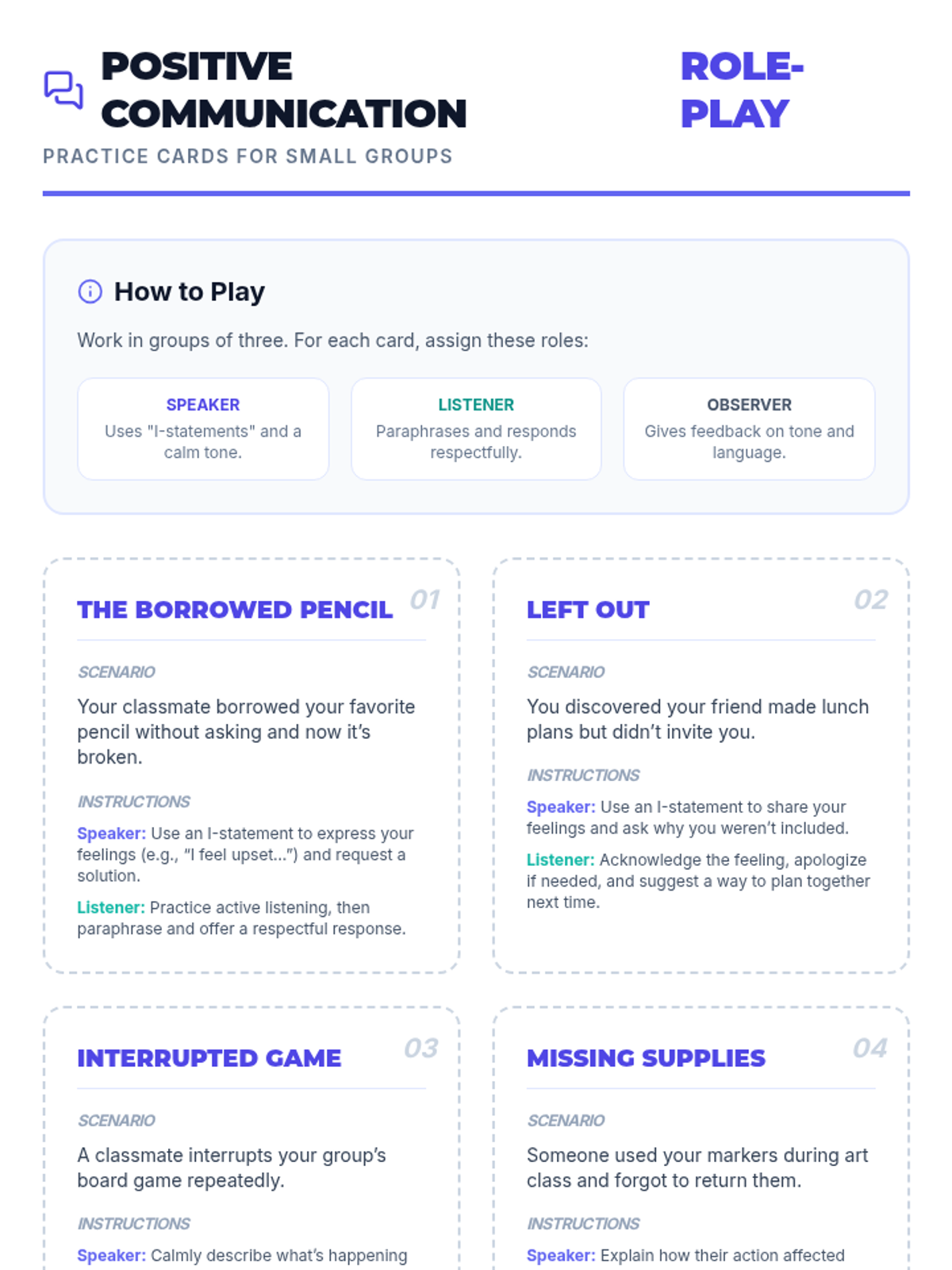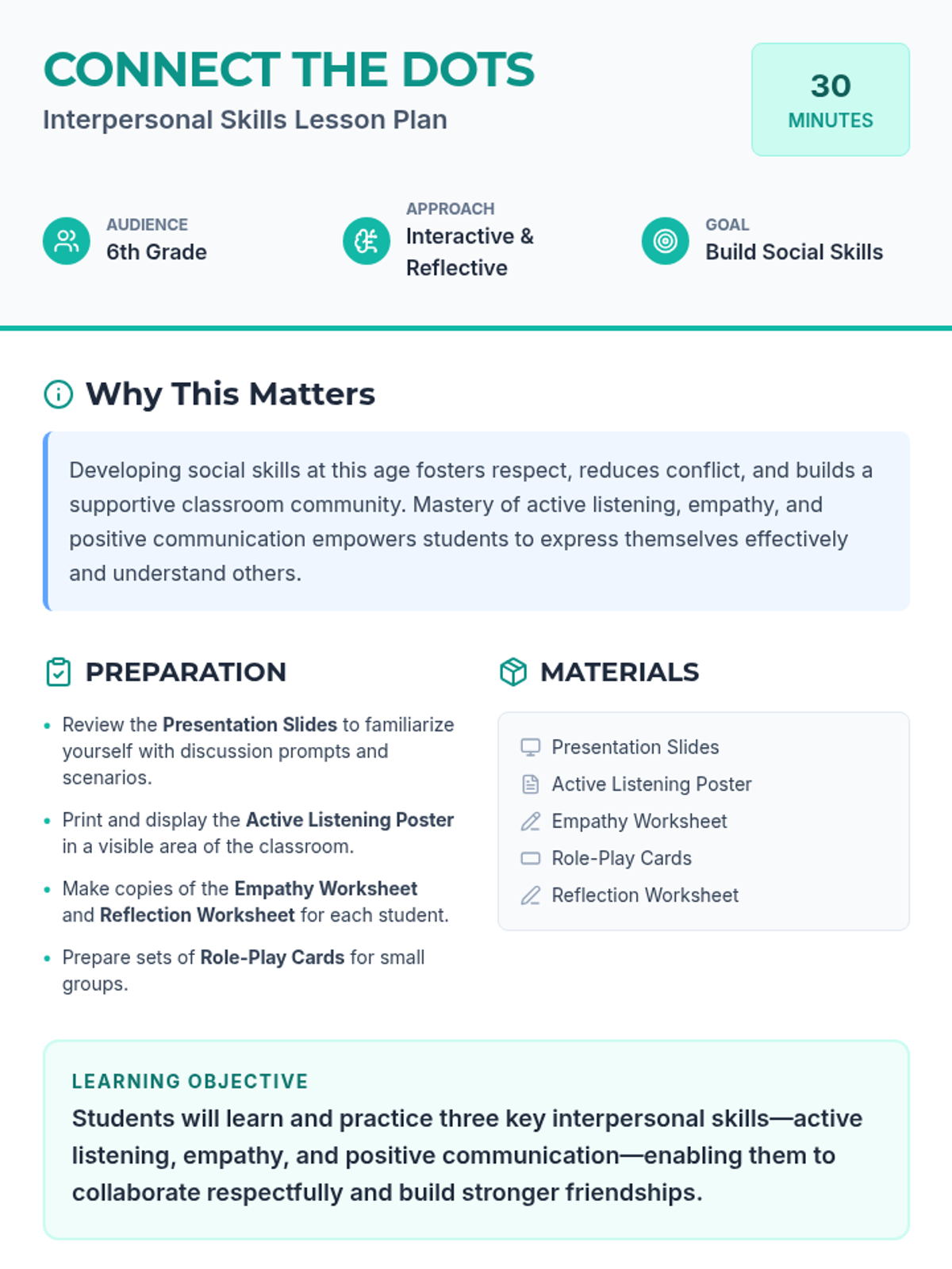 In this 30-minute lesson, 6th graders will learn key interpersonal social skills—active listening, empathy, and positive communication. These skills help students build stronger friendships and collaborate effectively.