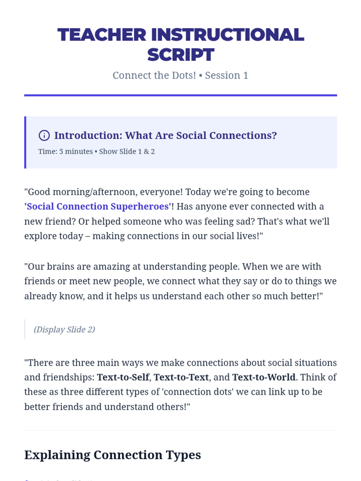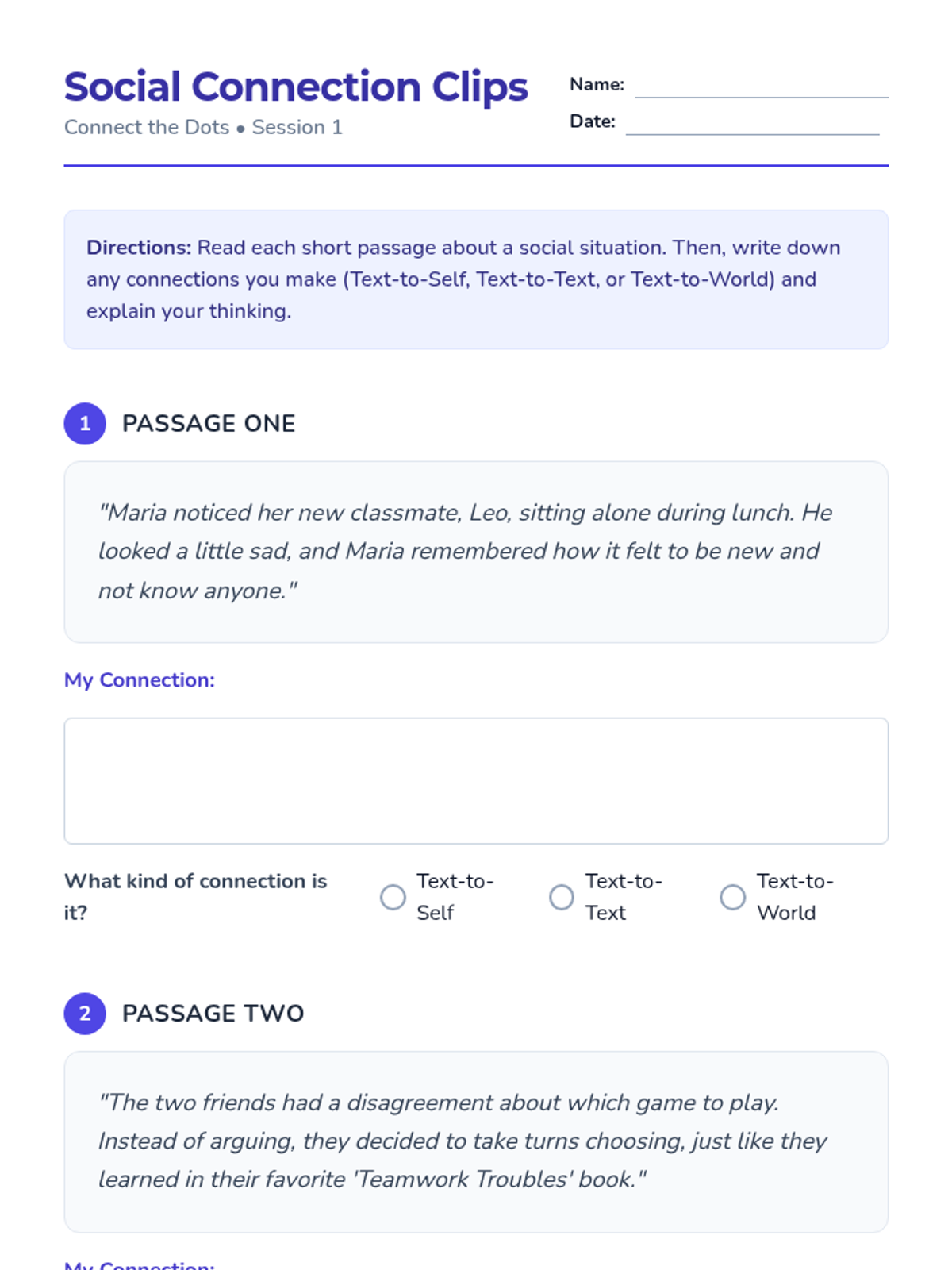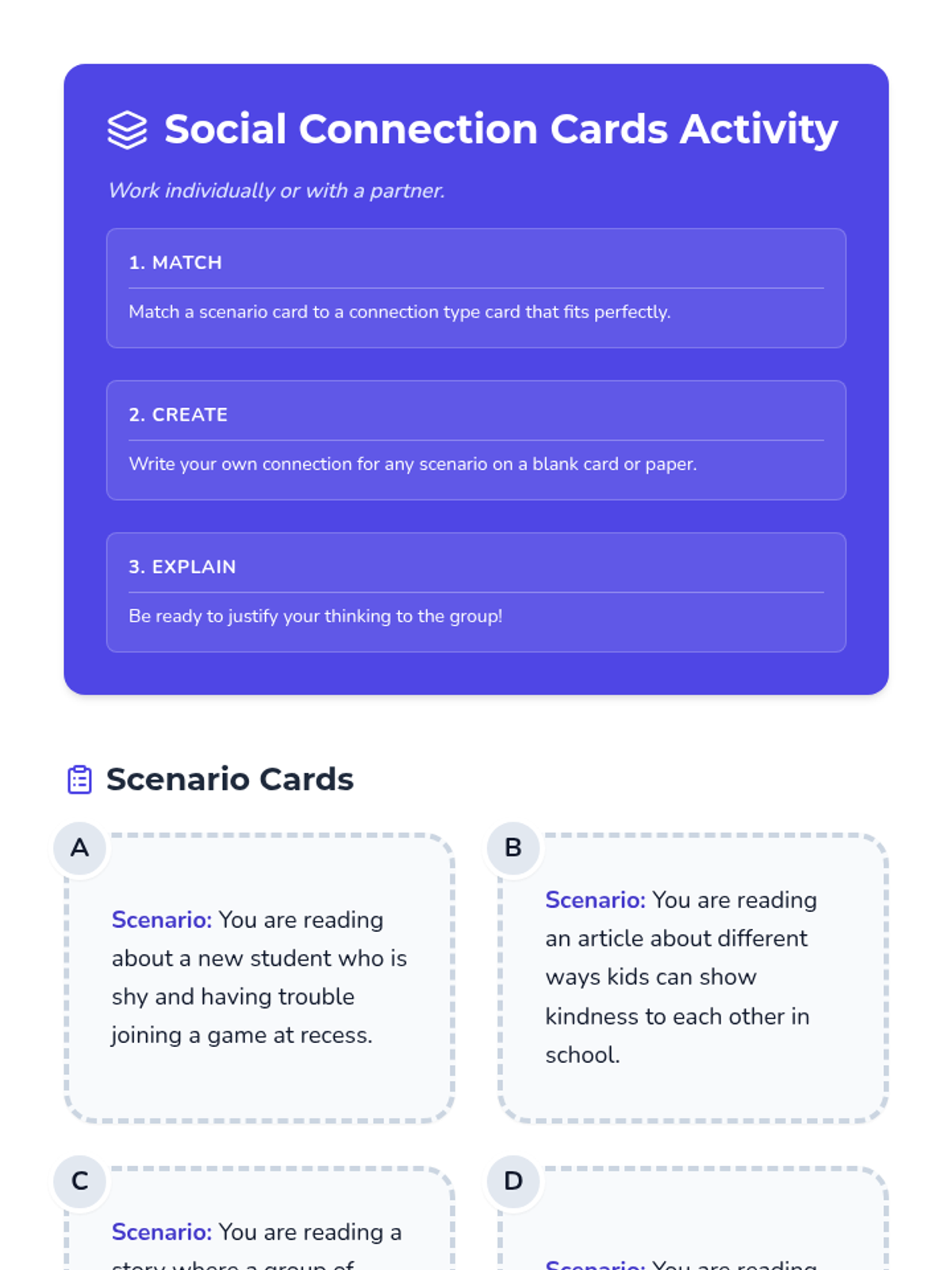 Introduces the three types of social connections (text-to-self, text-to-text, and text-to-world) through guided practice and interactive games.