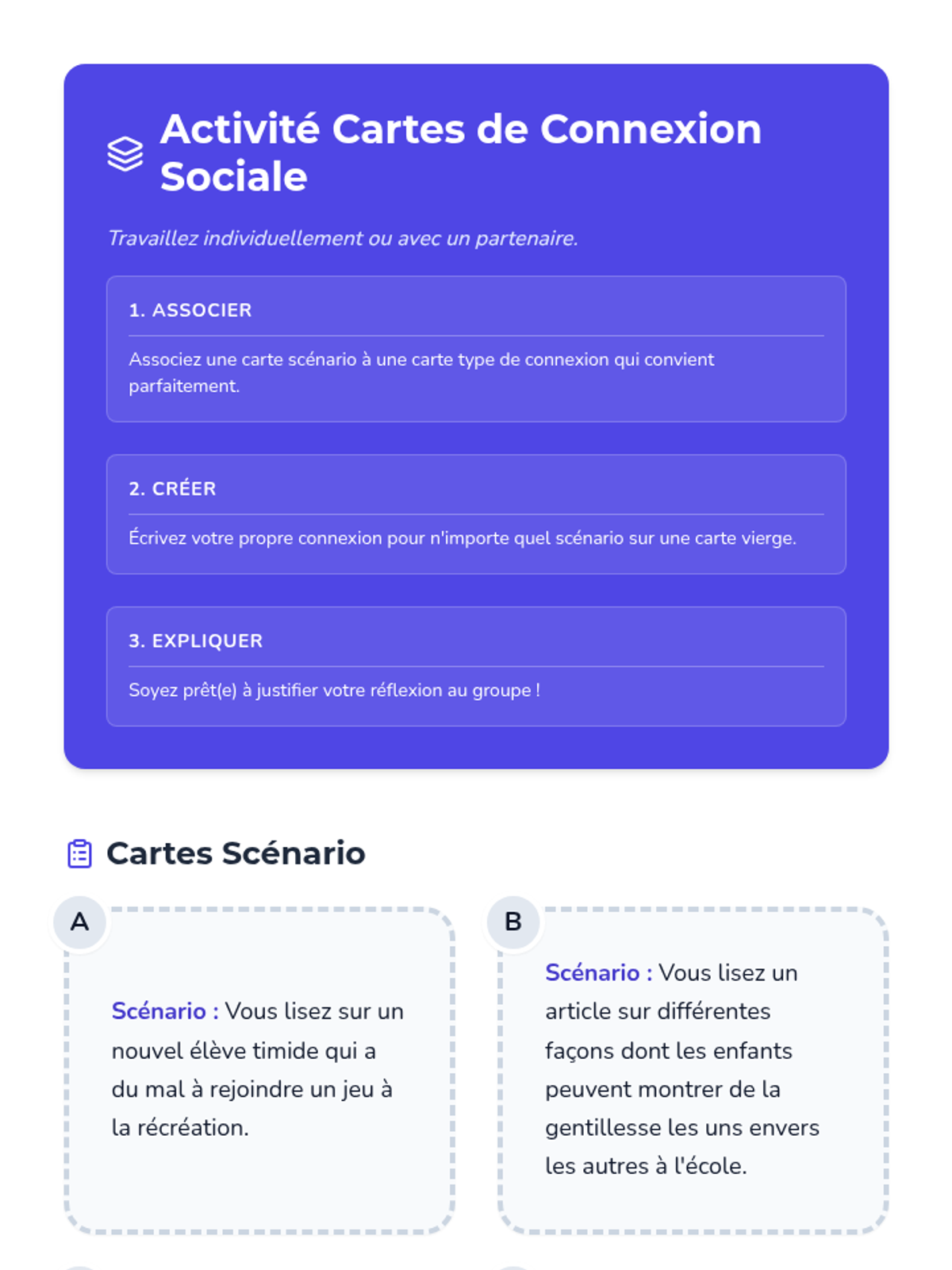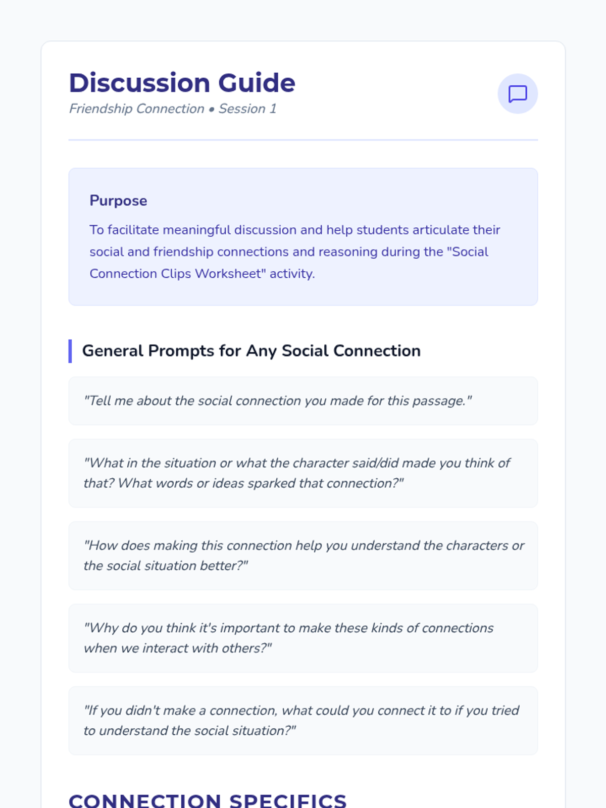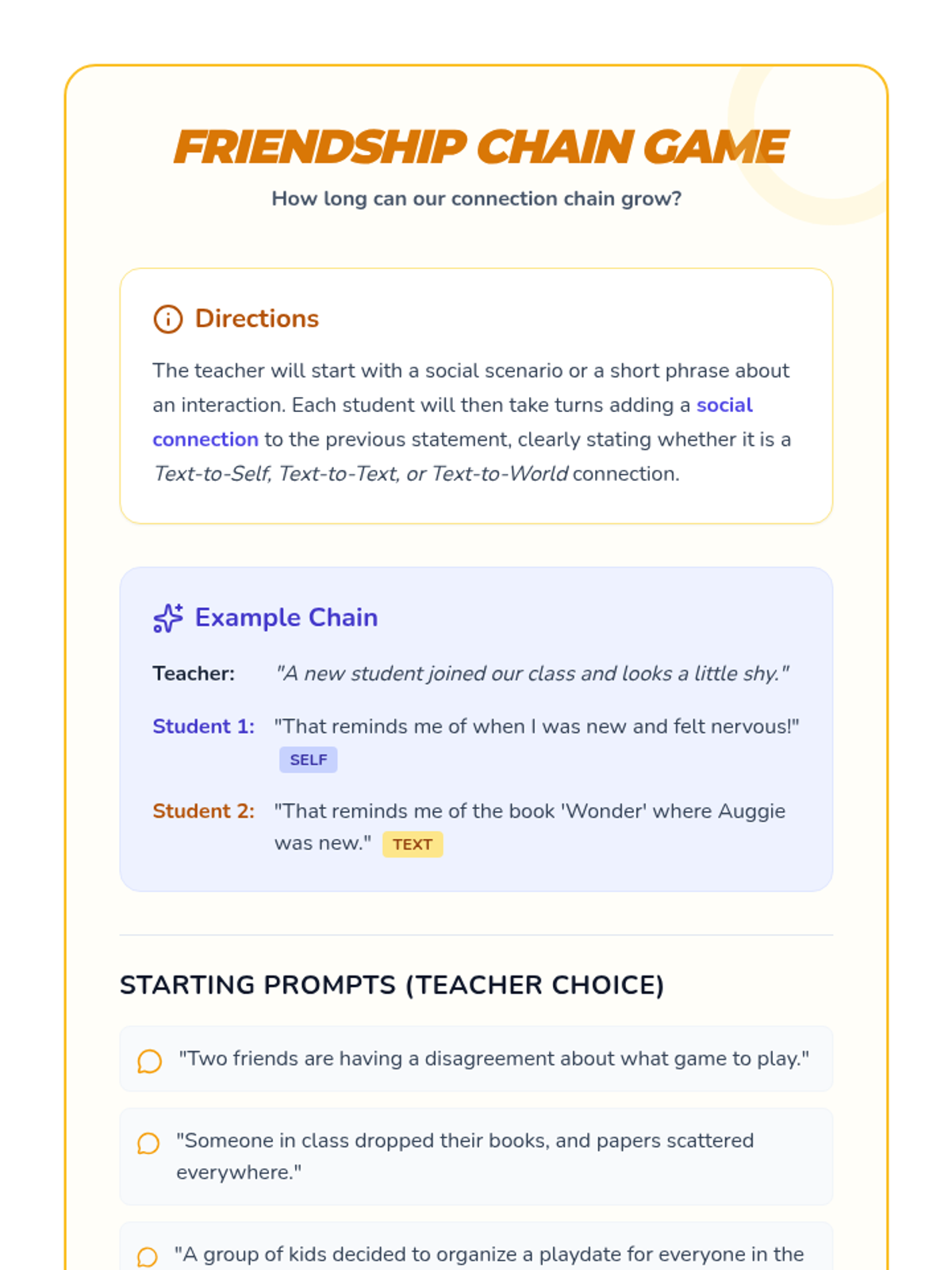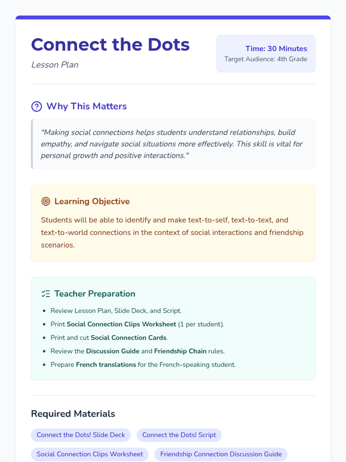 Introduces the three types of social connections (text-to-self, text-to-text, and text-to-world) through guided practice and interactive games.