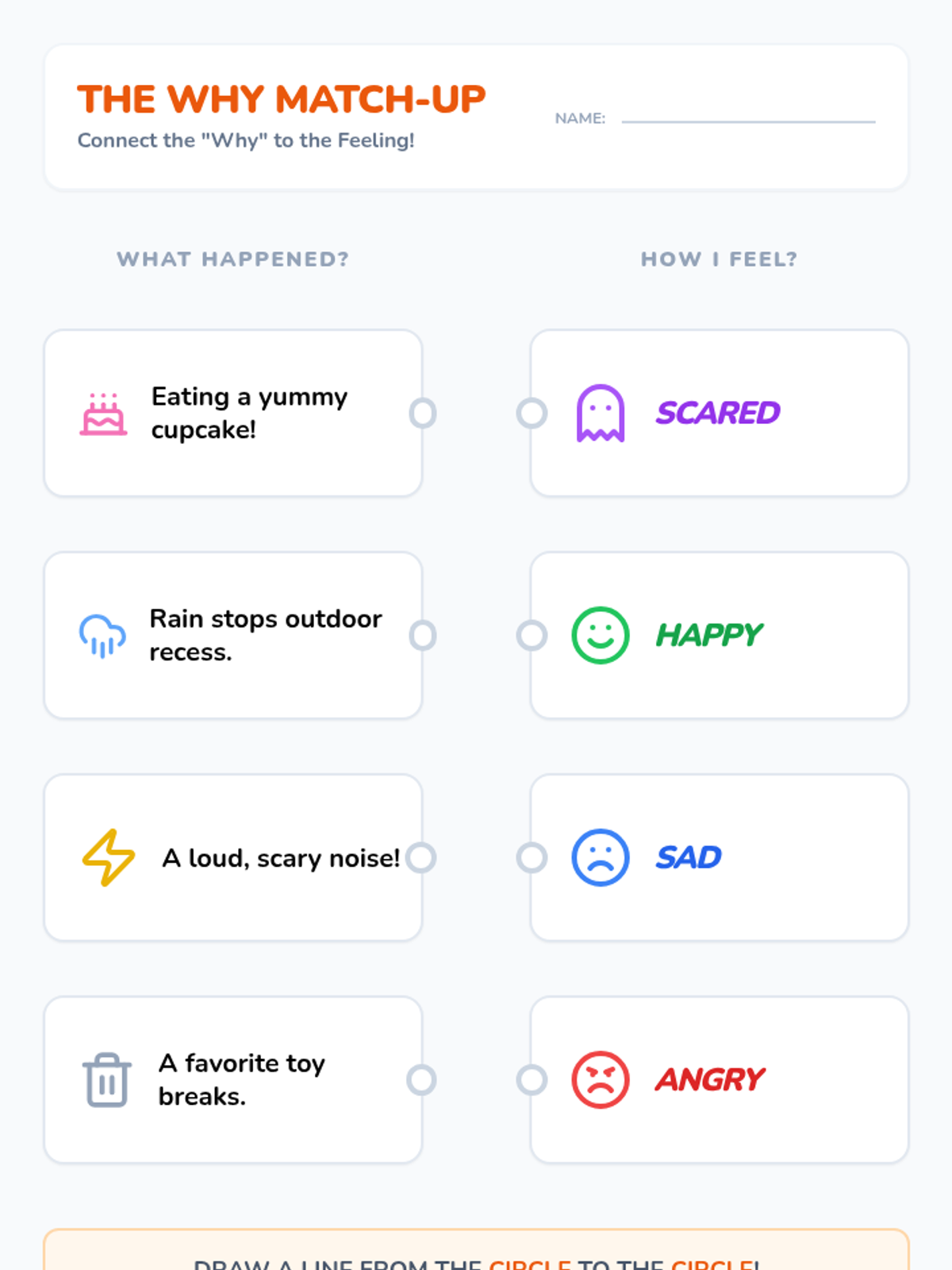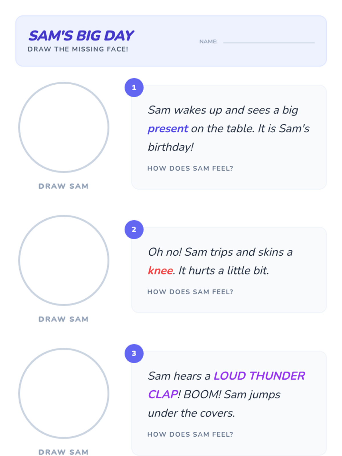Students link specific events to emotional responses, understanding how their identity is shaped by their reactions to the world around them.