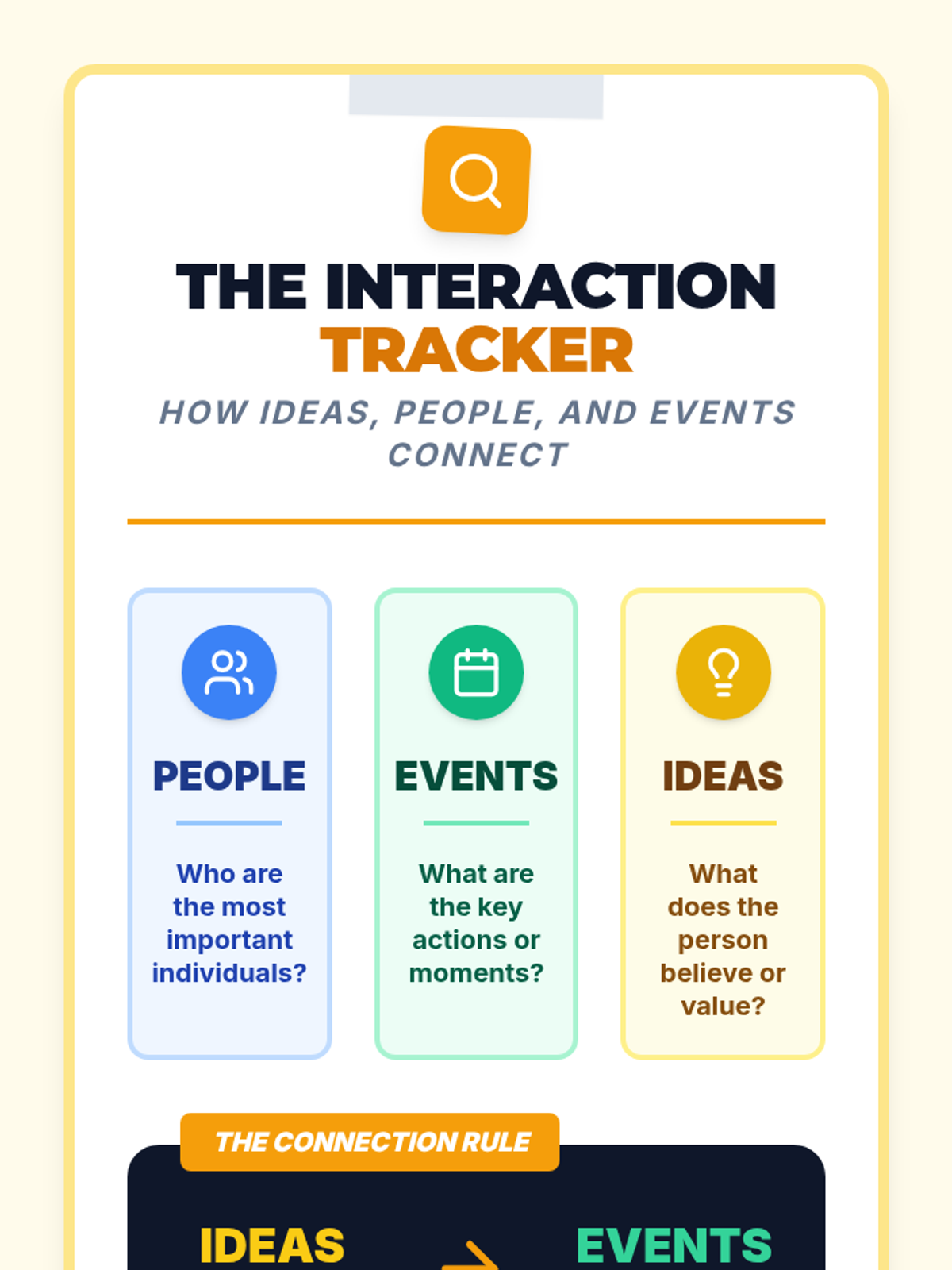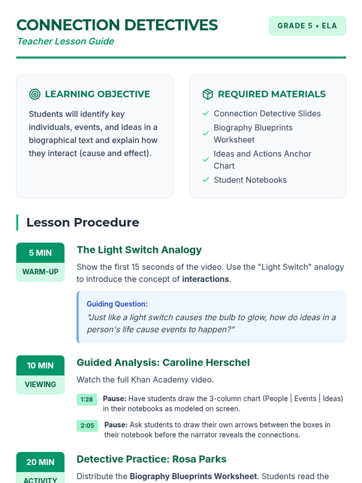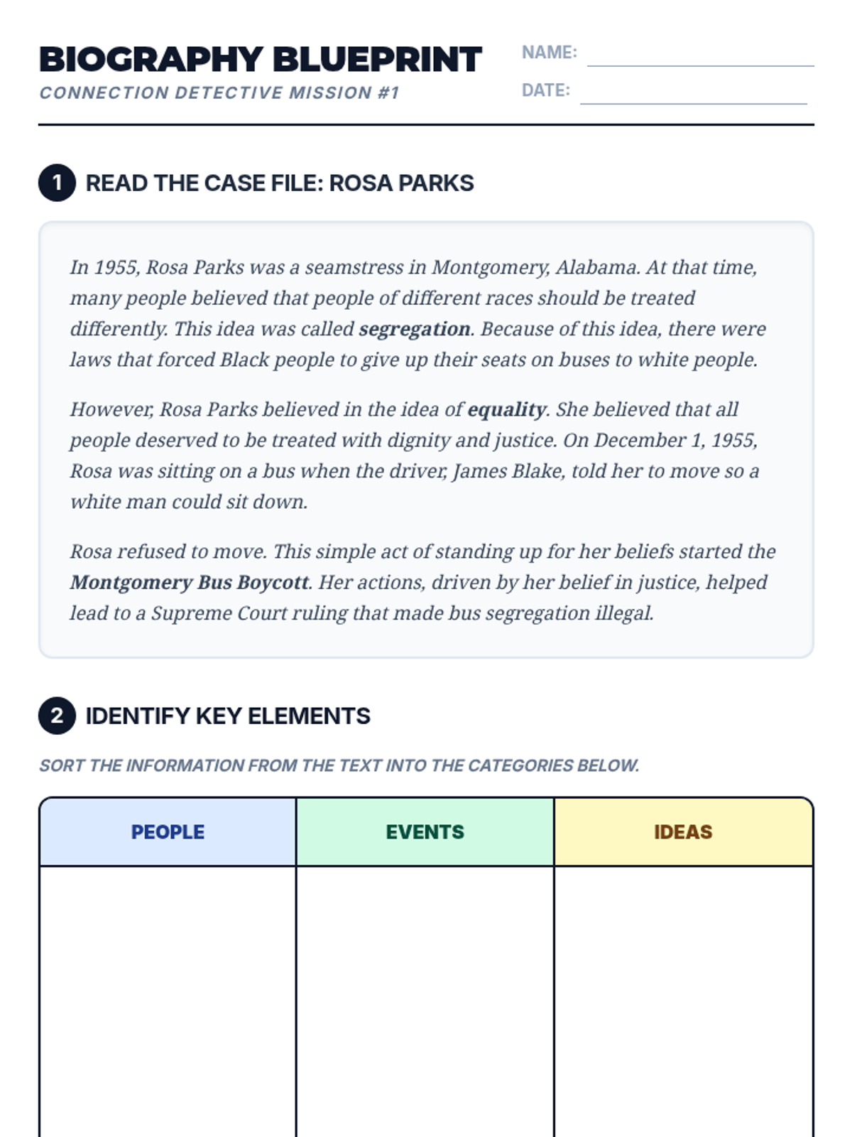 A lesson where students learn to identify and connect key individuals, events, and ideas within biographical texts using a 3-column analysis strategy. Students will analyze a biography of Caroline Herschel via video and then apply the strategy to a short biography of Rosa Parks.