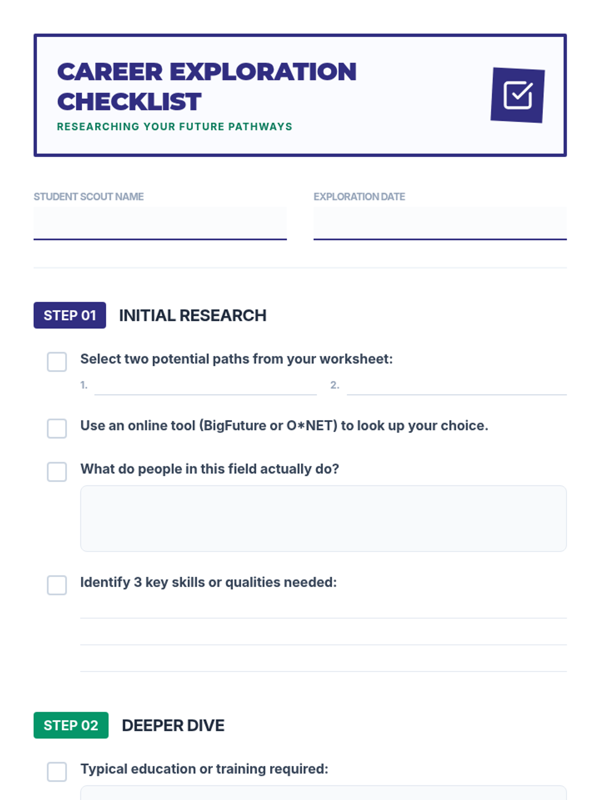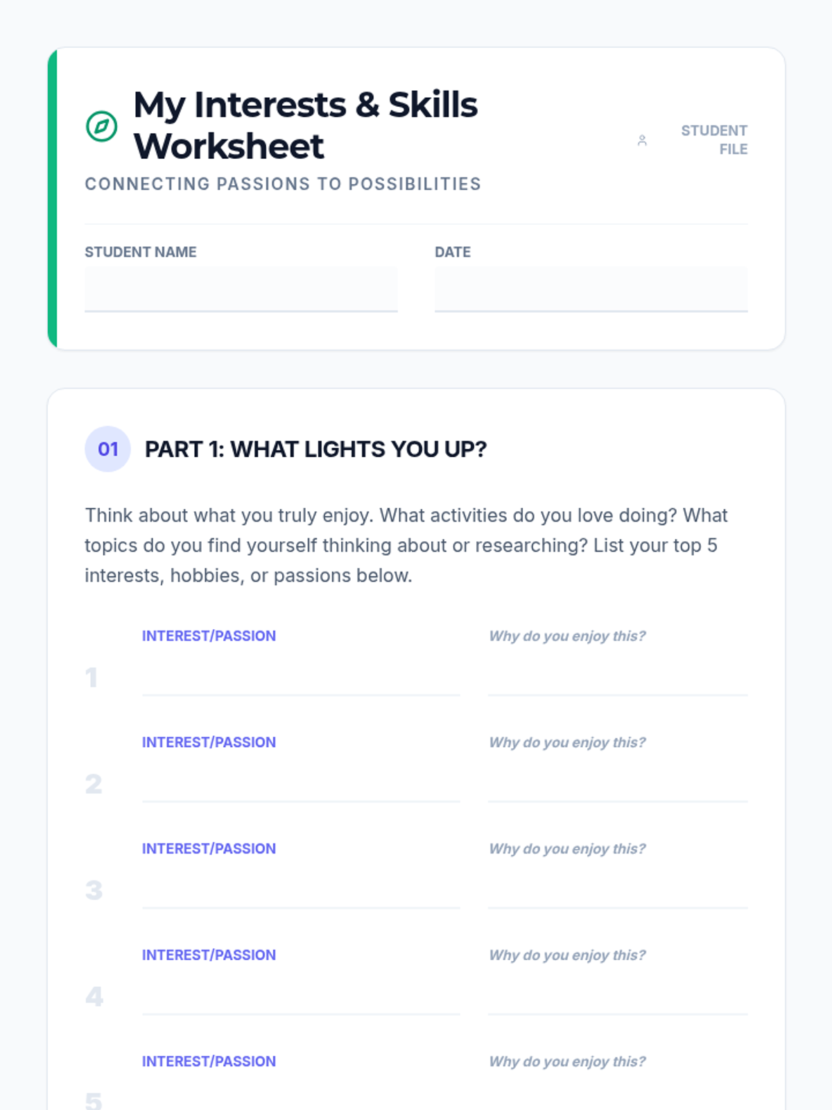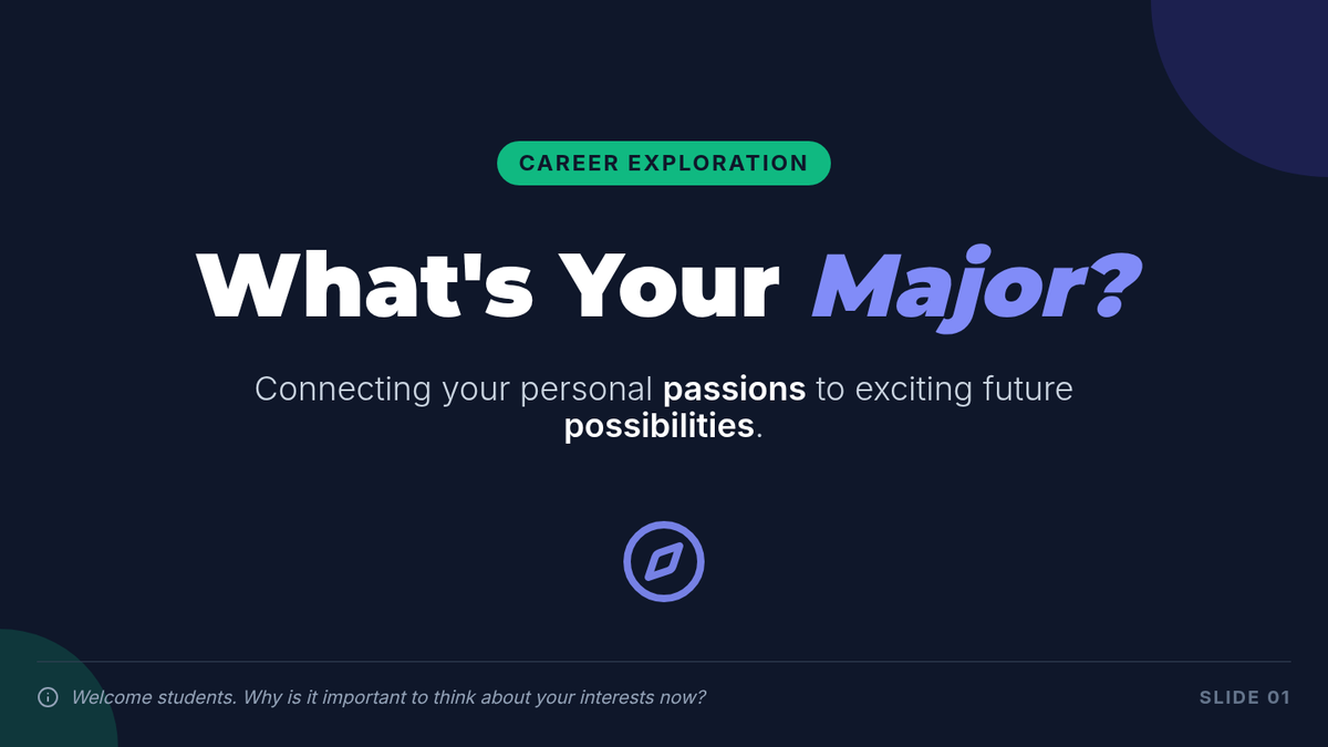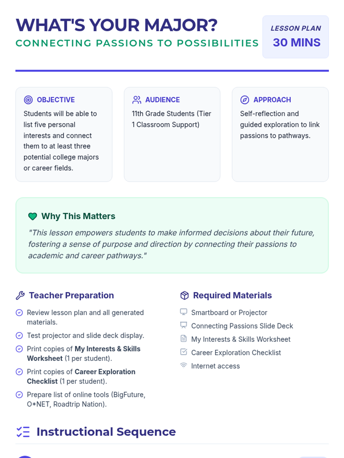 A 30-minute session for 11th graders to explore their personal interests, skills, and values, connecting them to potential college majors and career pathways.
