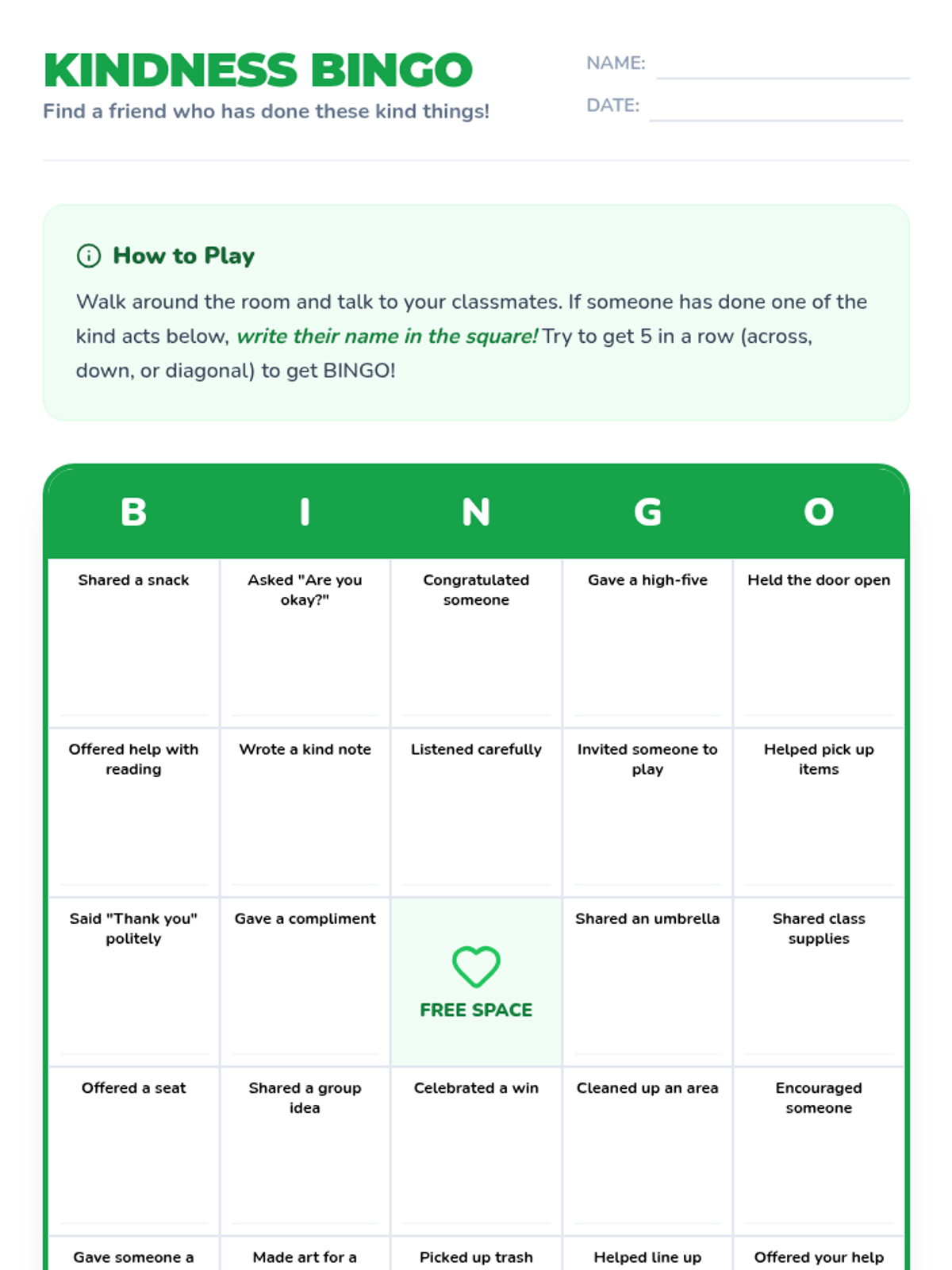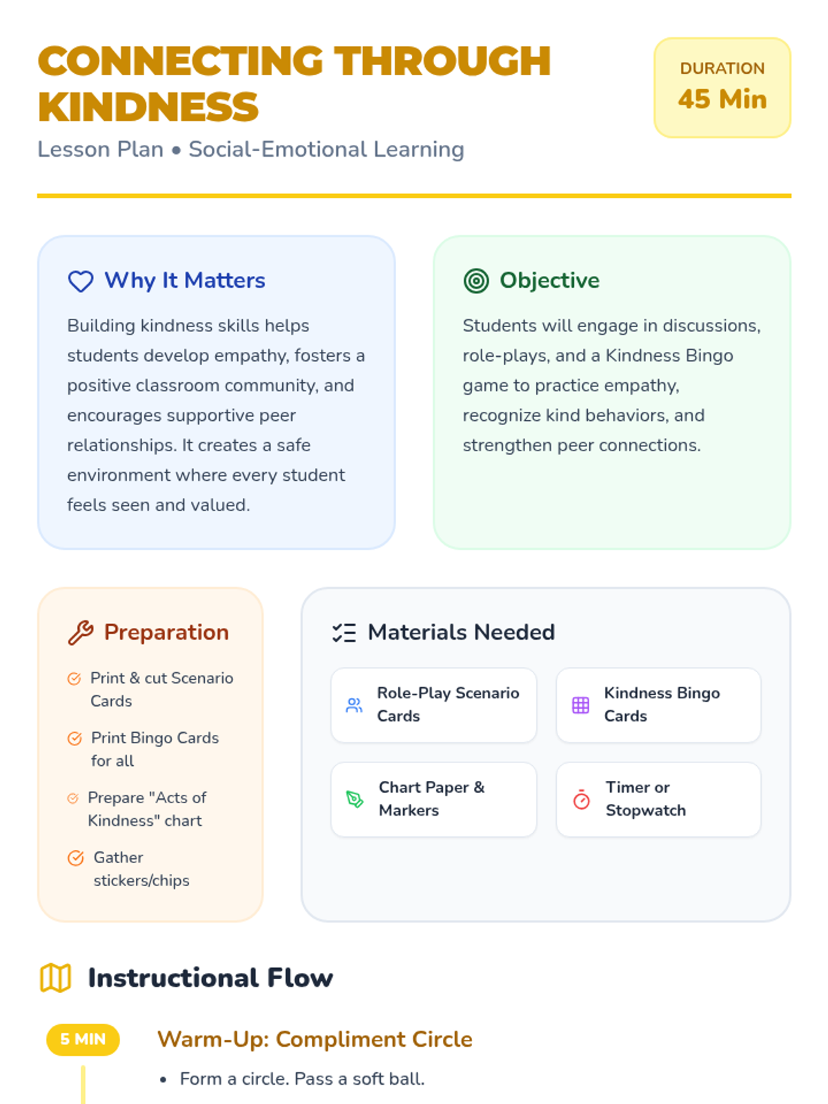 A 45-minute lesson for elementary students focused on building empathy and classroom community through role-play and a cooperative bingo game.