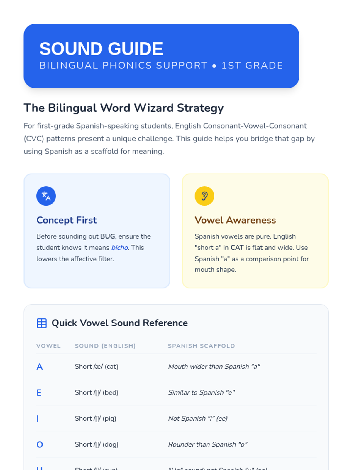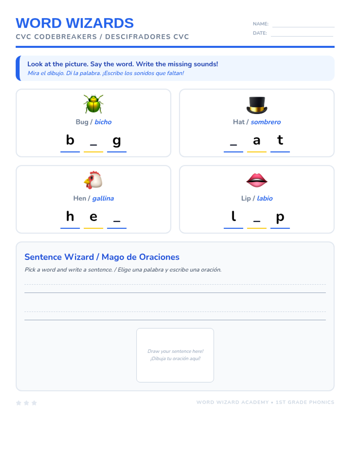 A phonics-focused lesson for first graders to master CVC words with bilingual Spanish support to bridge vocabulary gaps. Students will explore sounds, write words, and connect meanings between languages.