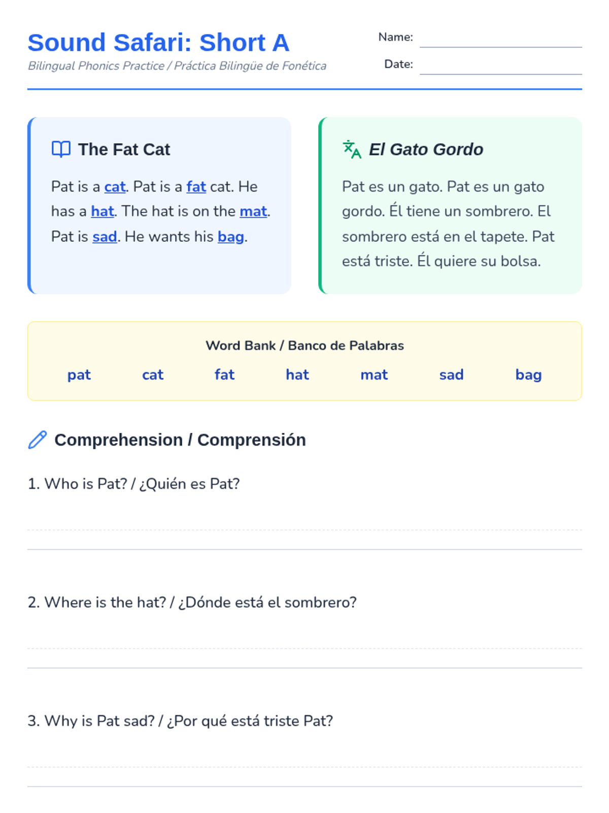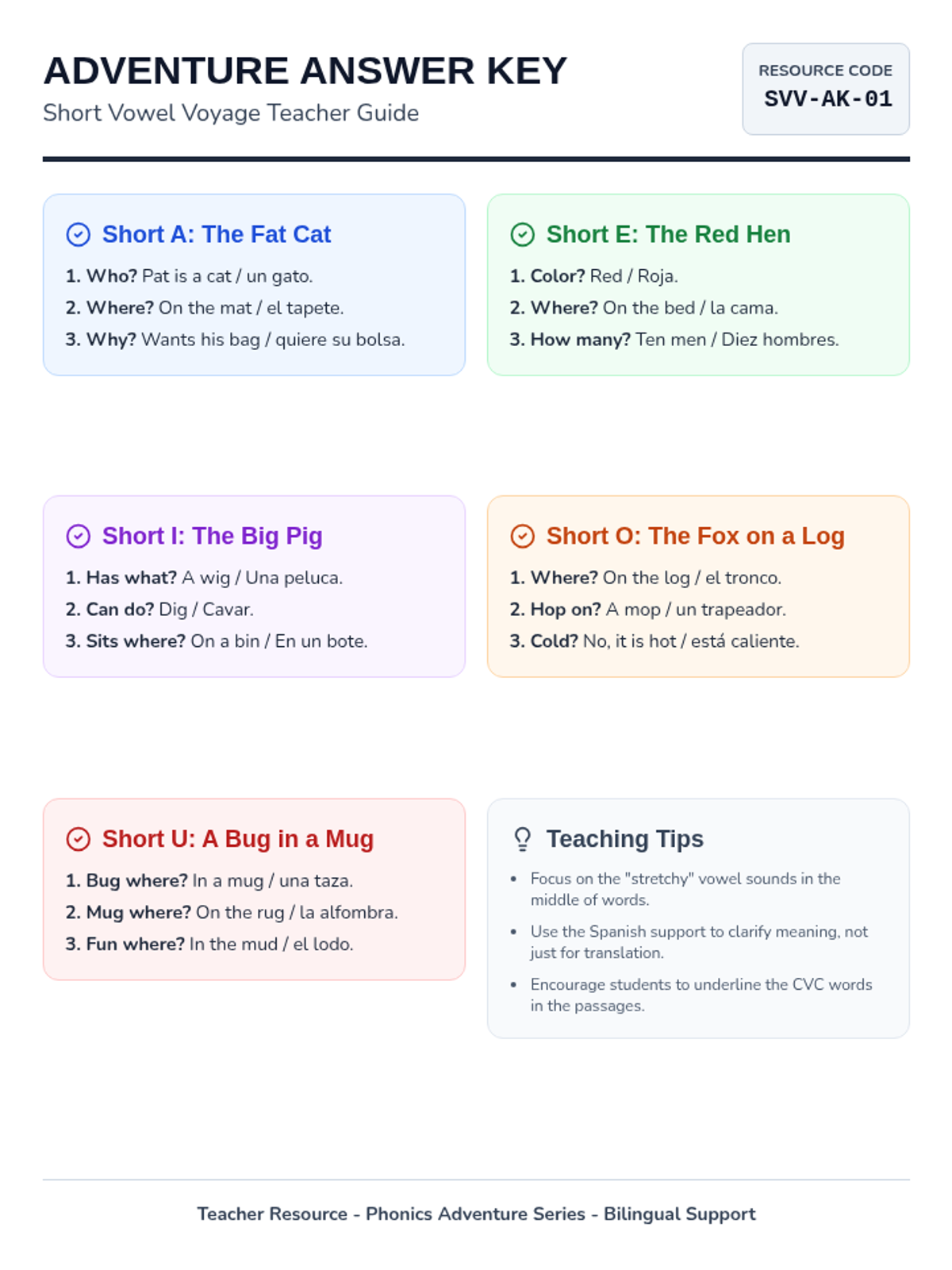 A fun, dual-language introduction to short vowel CVC words through engaging stories and hands-on mini-books. Students will build phonics fluency and reading comprehension in both English and Spanish contexts.