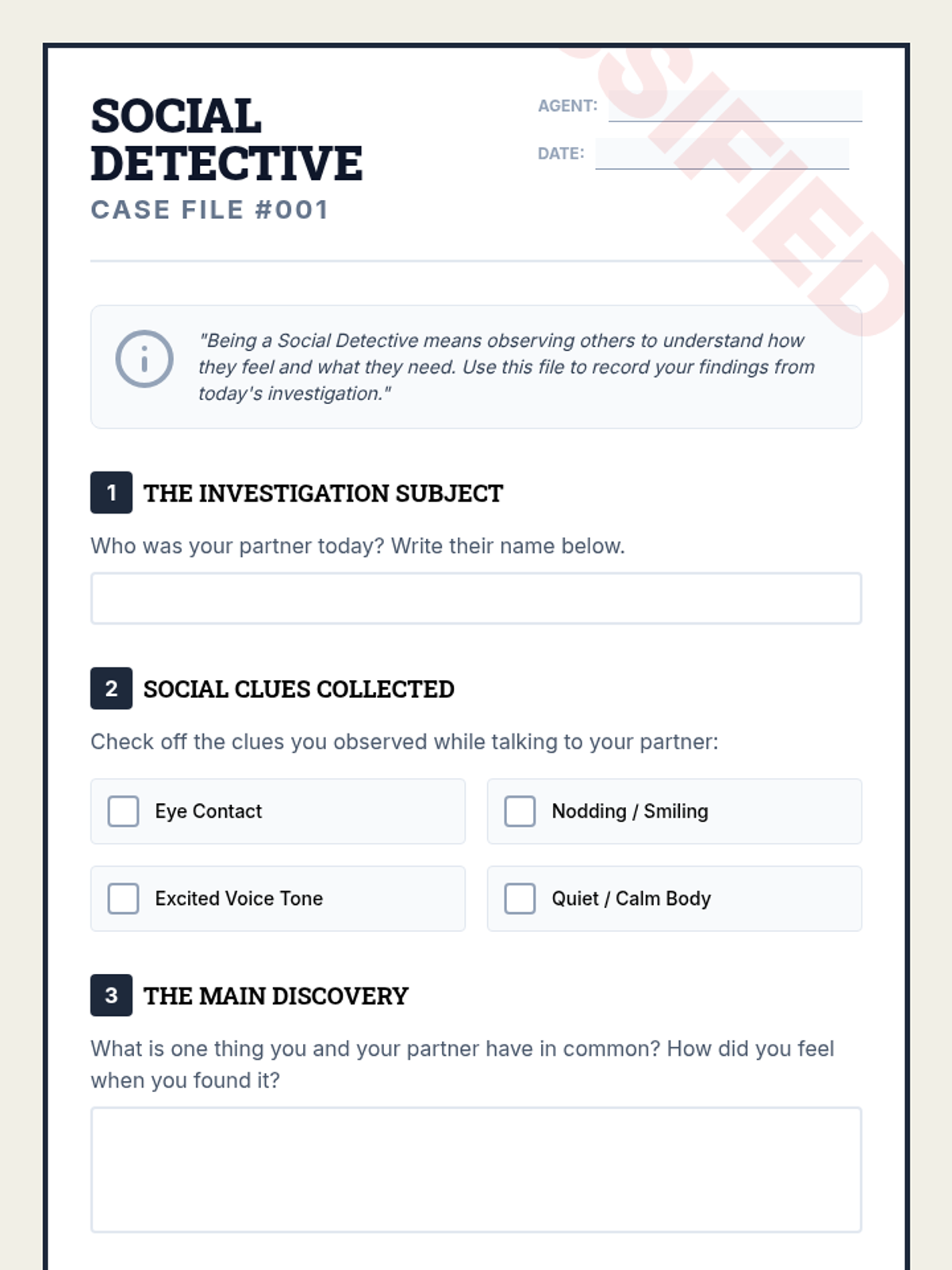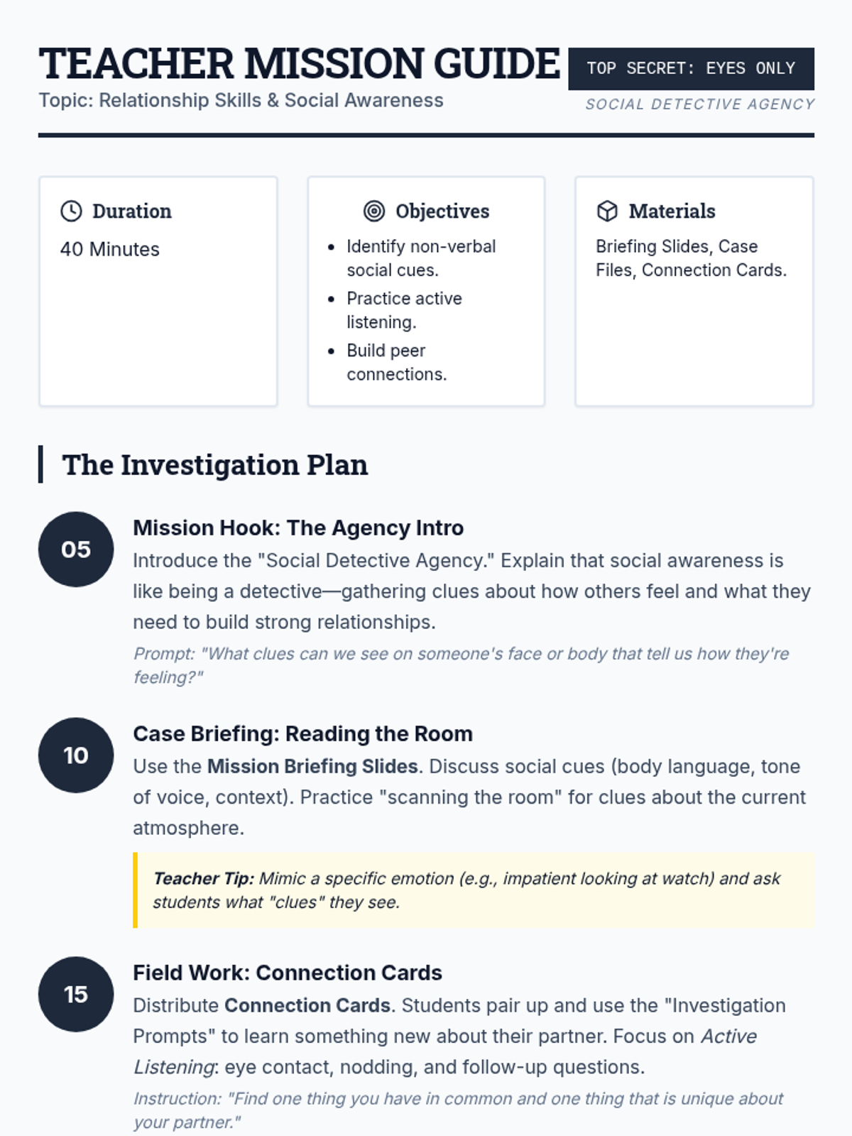 A 40-minute Social-Emotional Learning lesson focused on social awareness and relationship building through the lens of a 'Social Detective' theme. Students practice reading social cues and building meaningful connections.