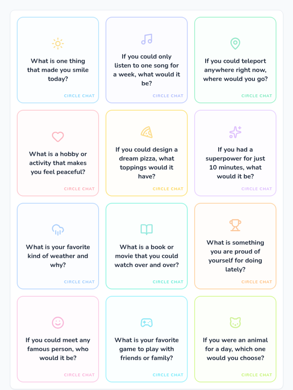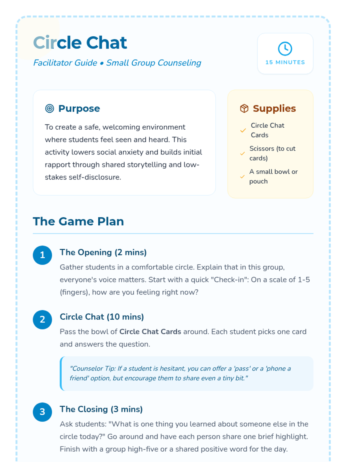 A short, 15-minute icebreaker activity designed for small group counseling to build rapport and trust through low-stakes conversation starters.